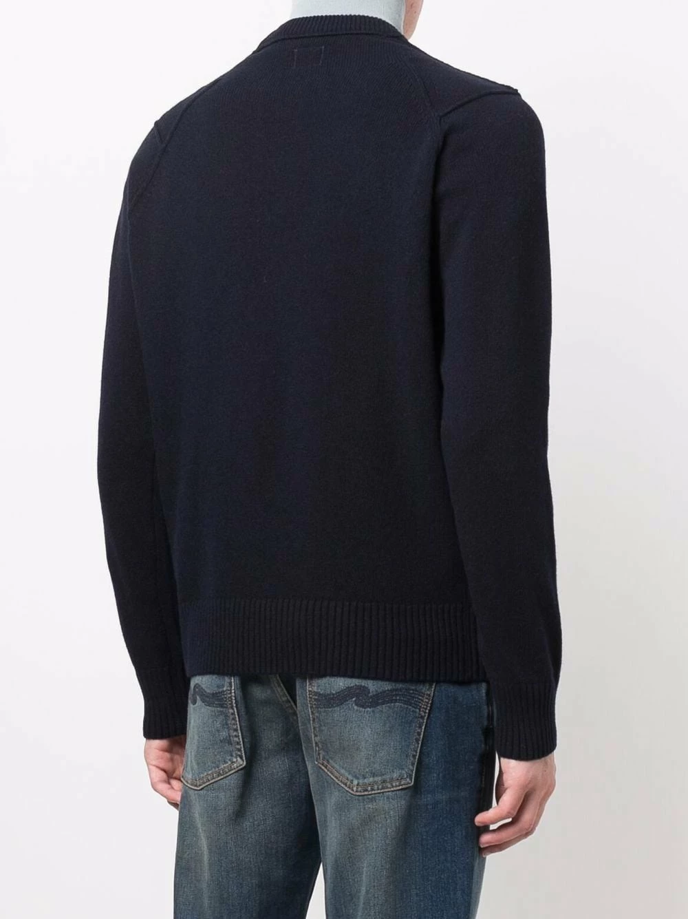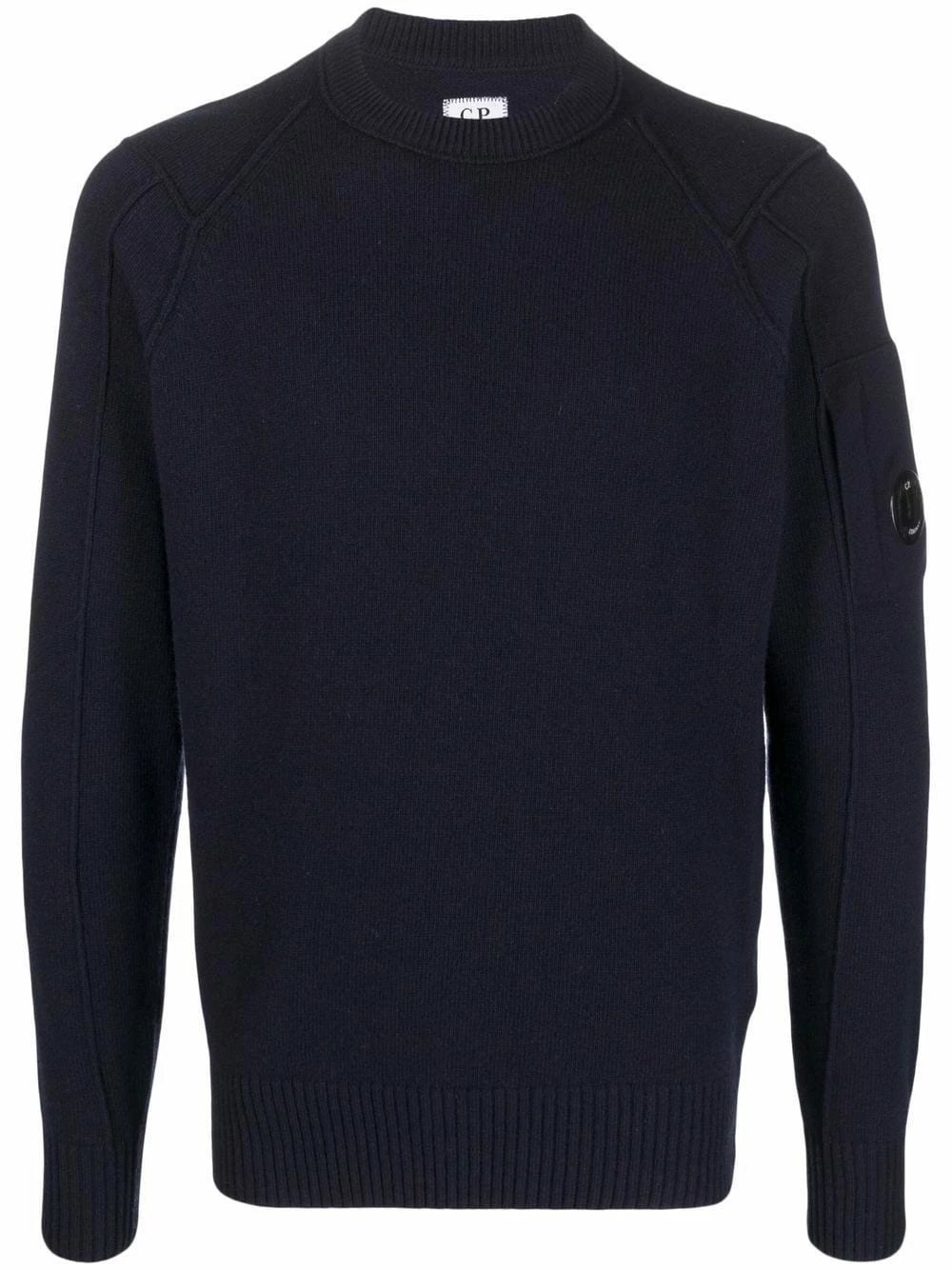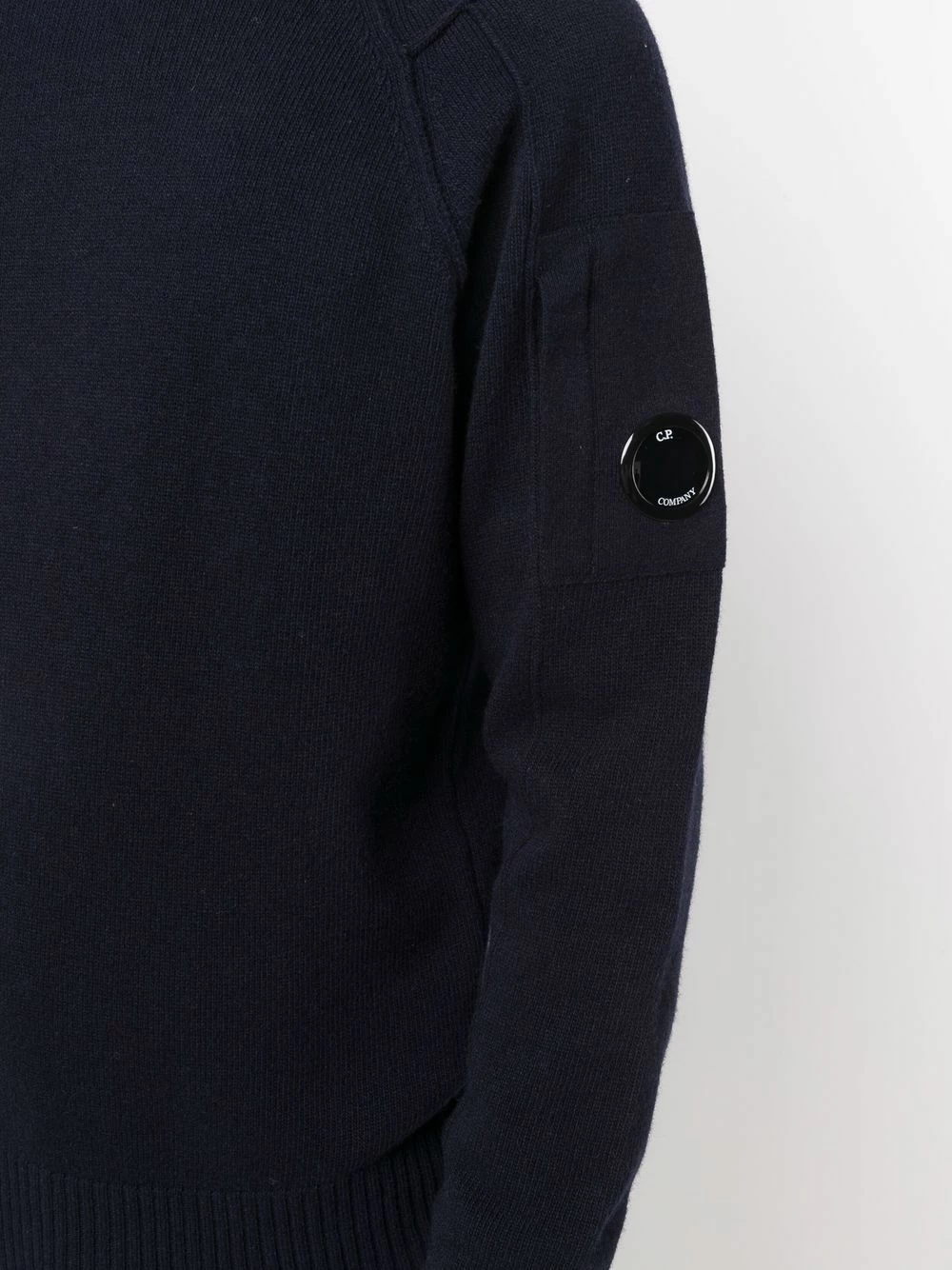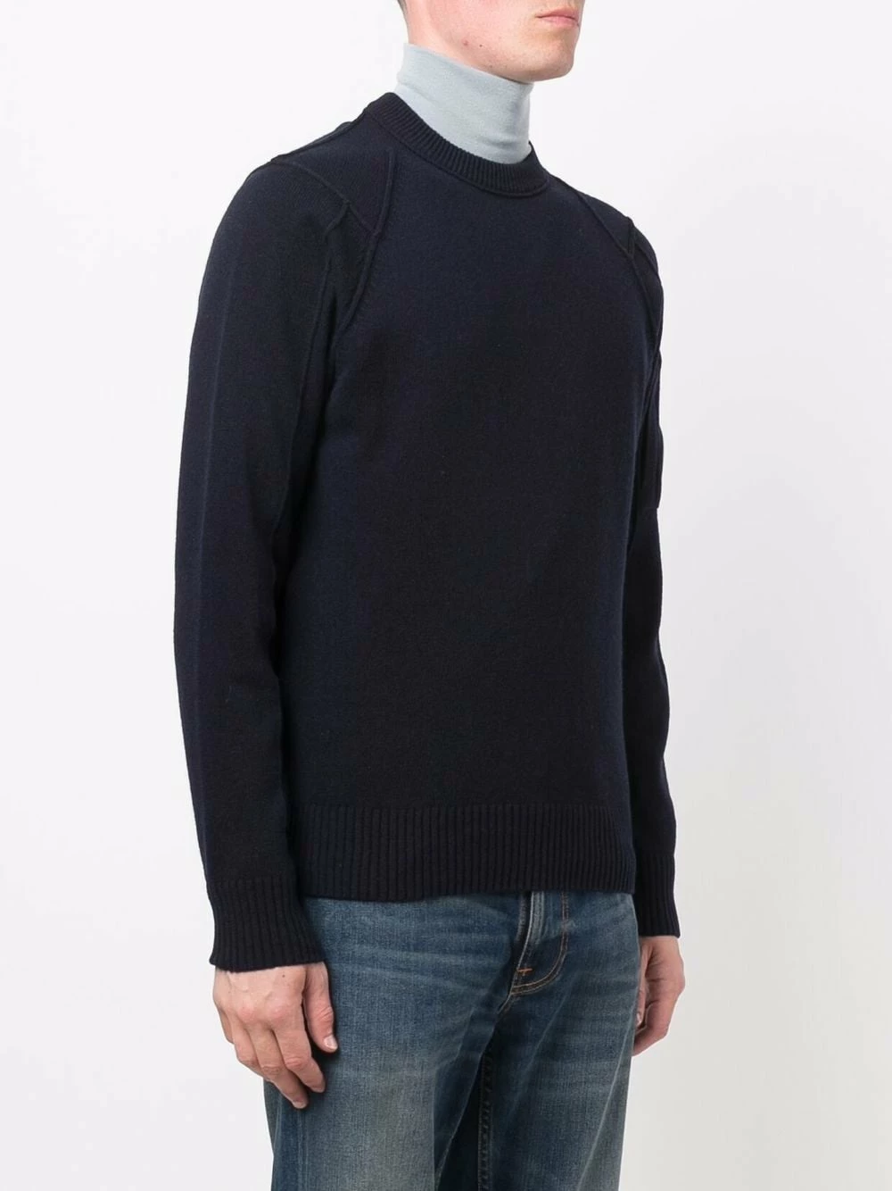 Maille fine, finitions nervurées, détail verre de lunette signature, encolure ras du cou, manches longues, ourlet droit.
