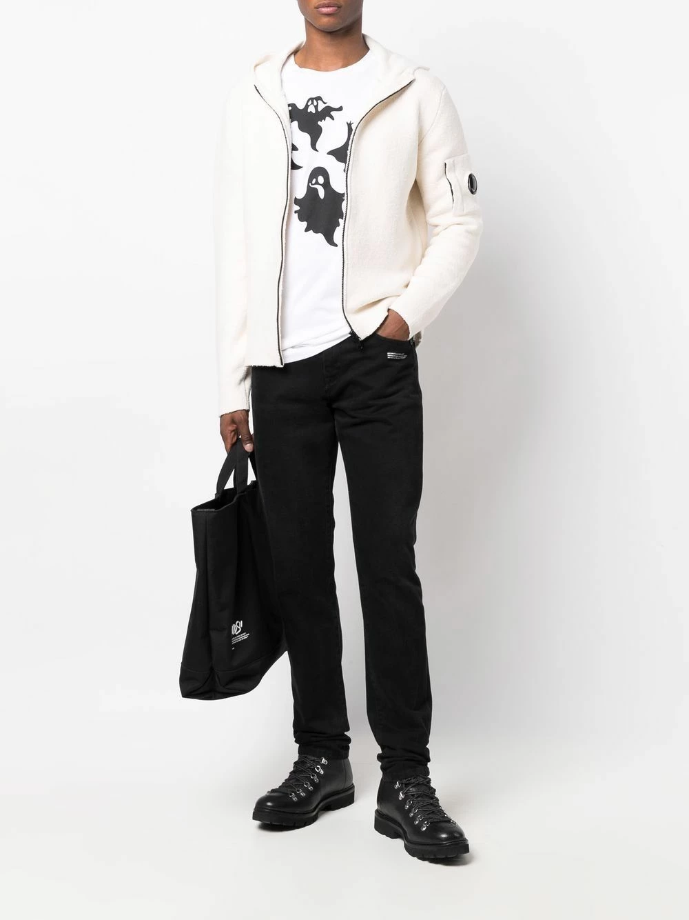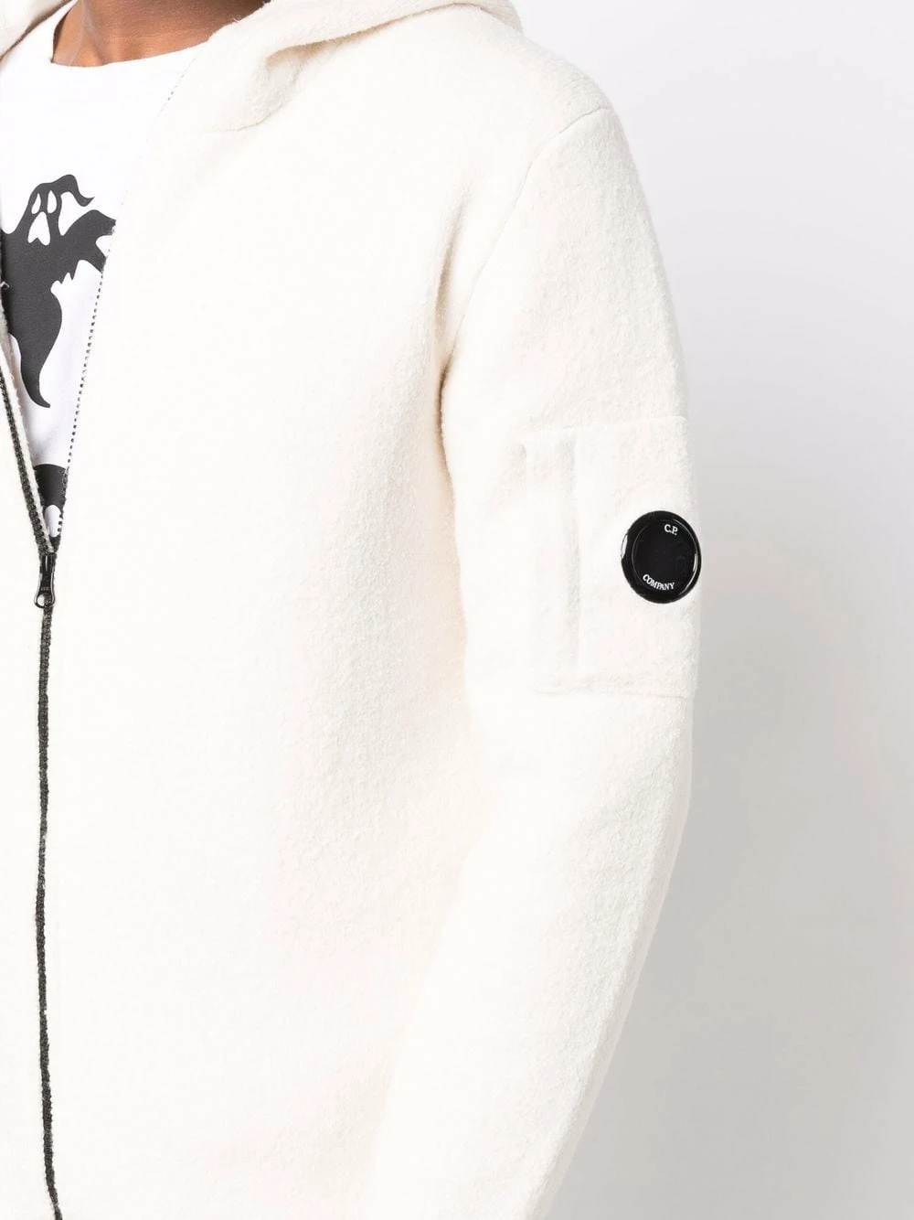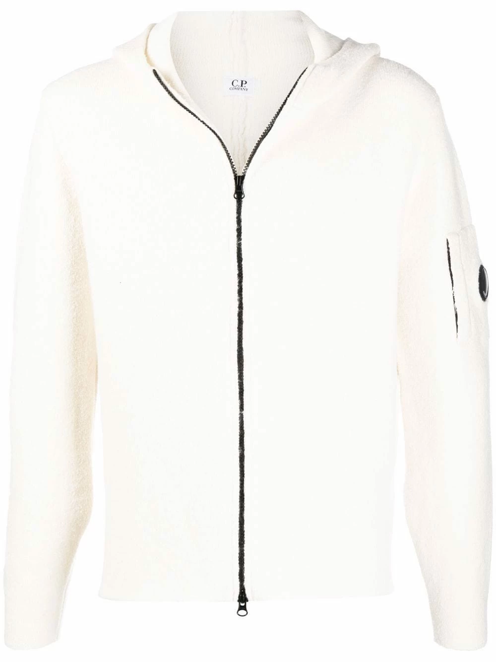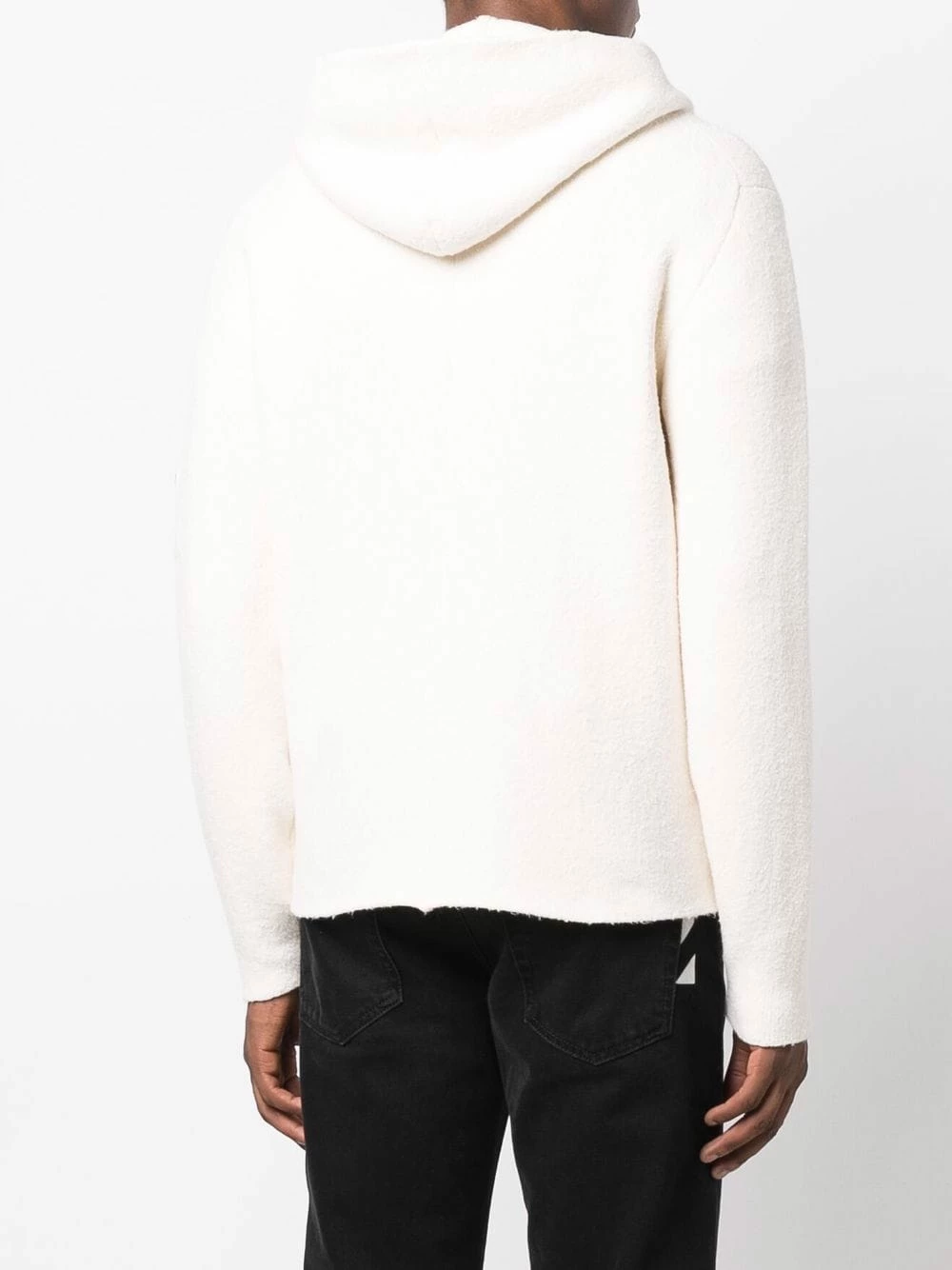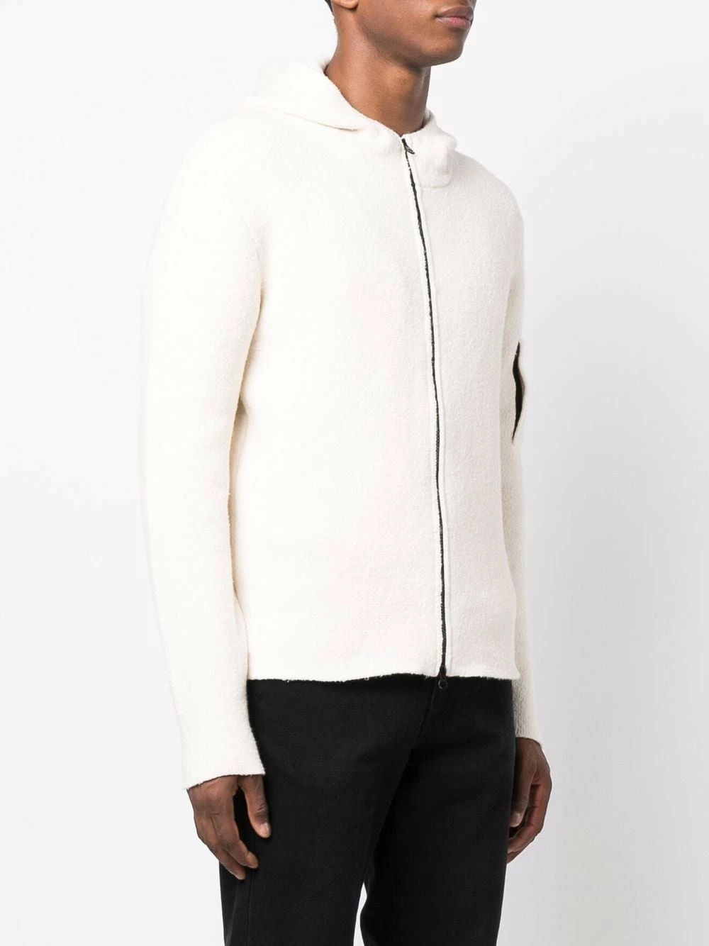 Design en maille, détail verre de lunette signature, manches longues, capuche classique, fermeture zippée devant. Couleur : blanc.