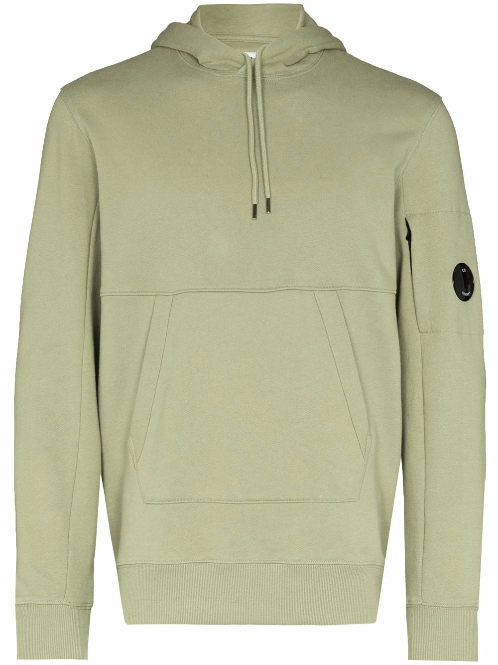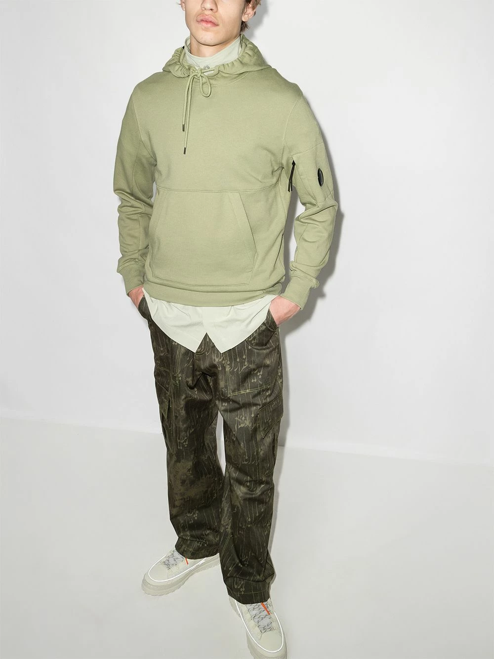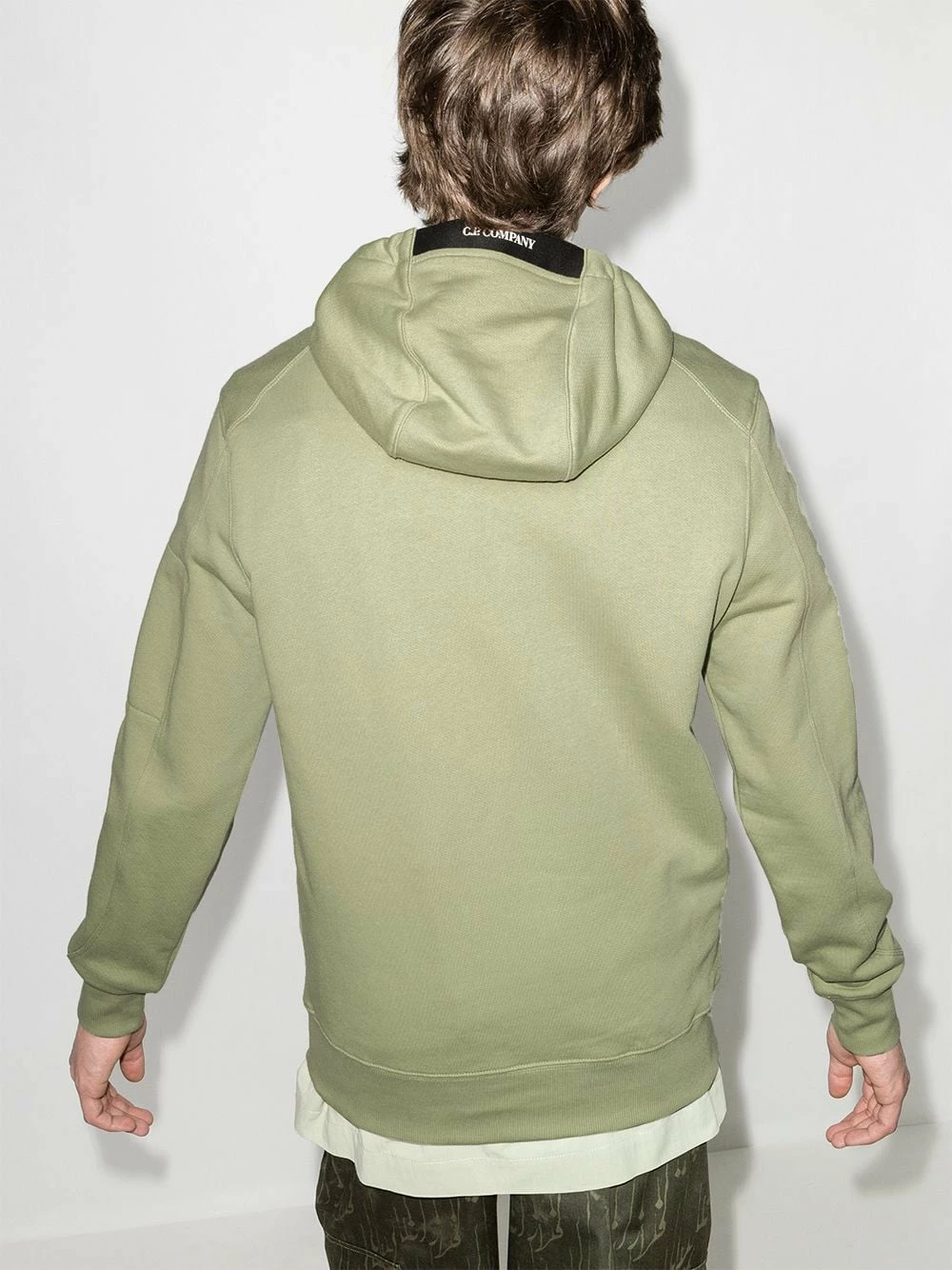 Capuche à lien de resserrage, poche plaquée sur le devant, ourlet droit, poche zippée sur la manche, bord en maille côtelée, détail verre de lunette signature. Matière : coton.