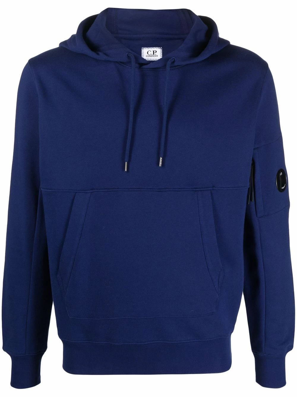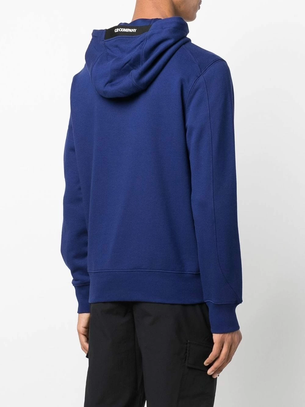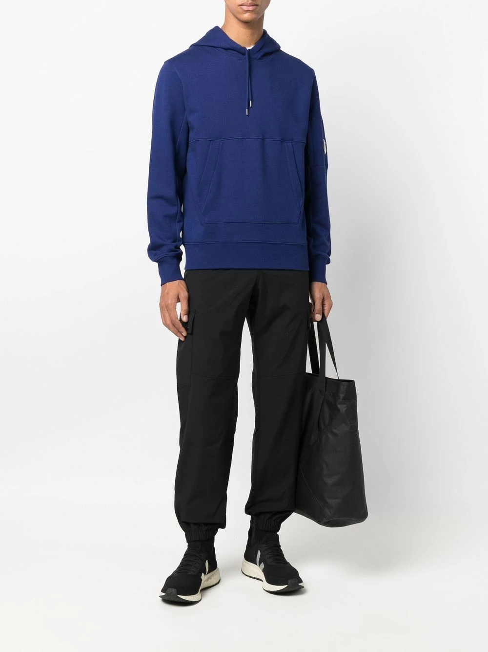 Patch logo sur la manche, capuche à lien de resserrage, manches longues, poche plaquée sur le devant, ourlet élastiqué. Couleur : bleu. Matière : coton.