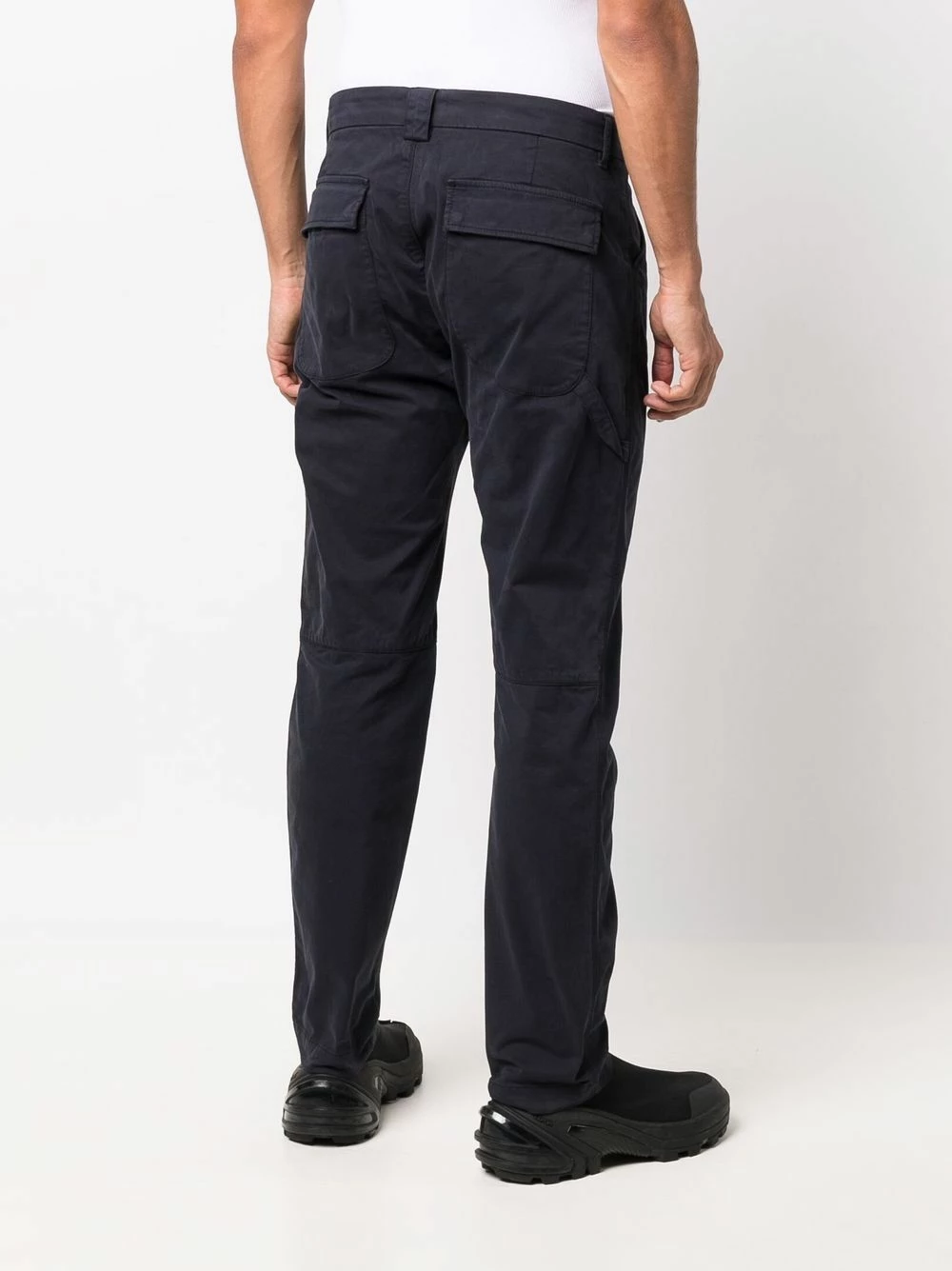 Détail verre de lunette signature, poches cargo multiples, boutonnière sur le devant, passants de ceinture, coupe droite.