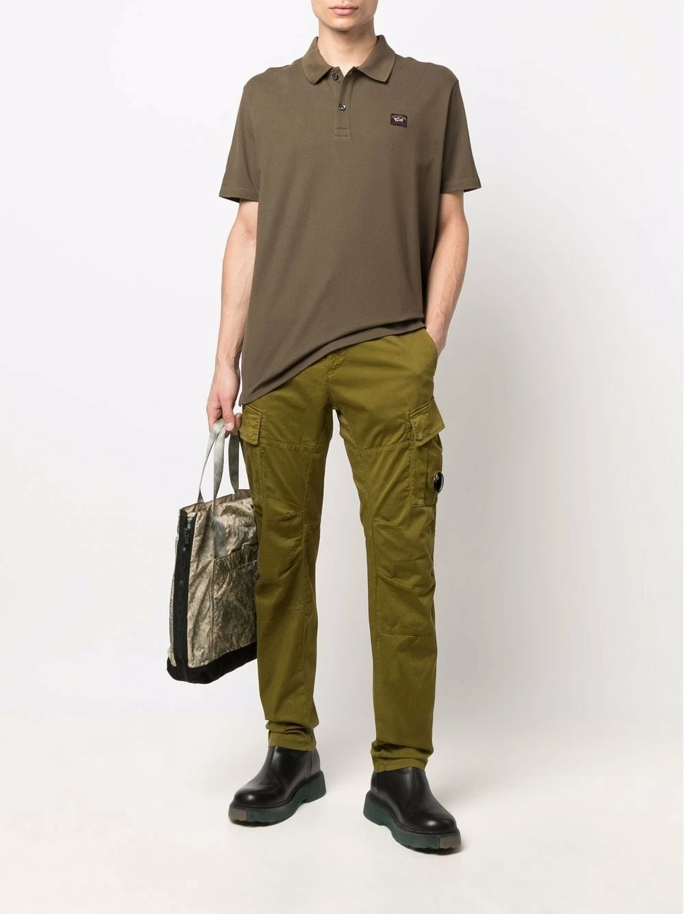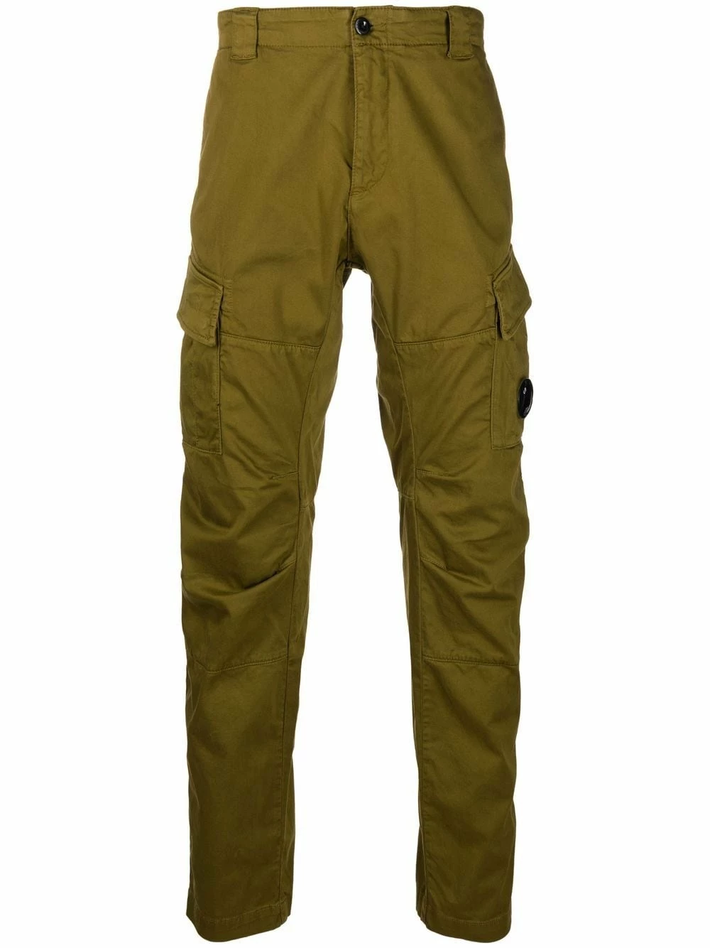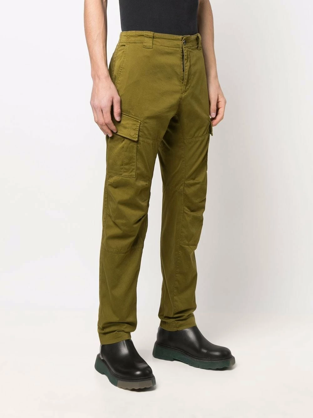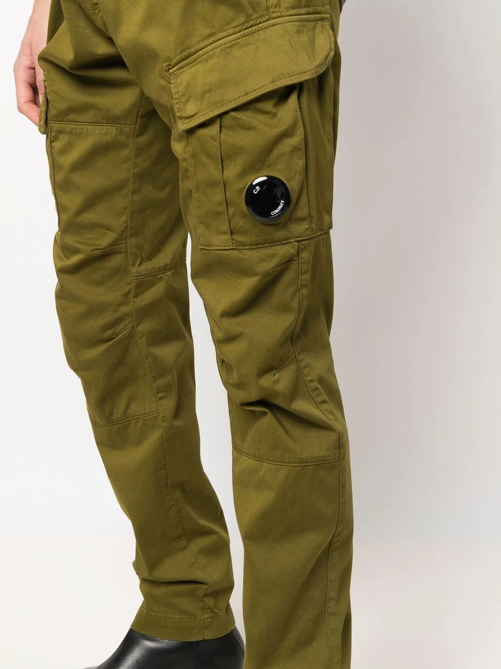 Détail verre de lunette signature, passants de ceinture, fermeture à zip et boutons sur le devant, deux poches latérales fendues, poches latérales cargo, poches arrière passepoilées.