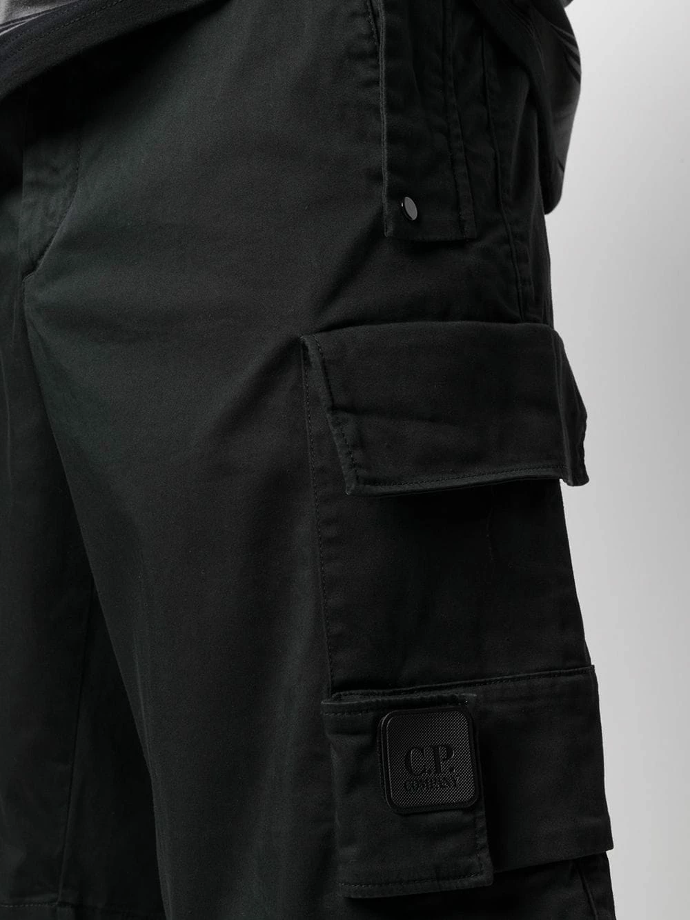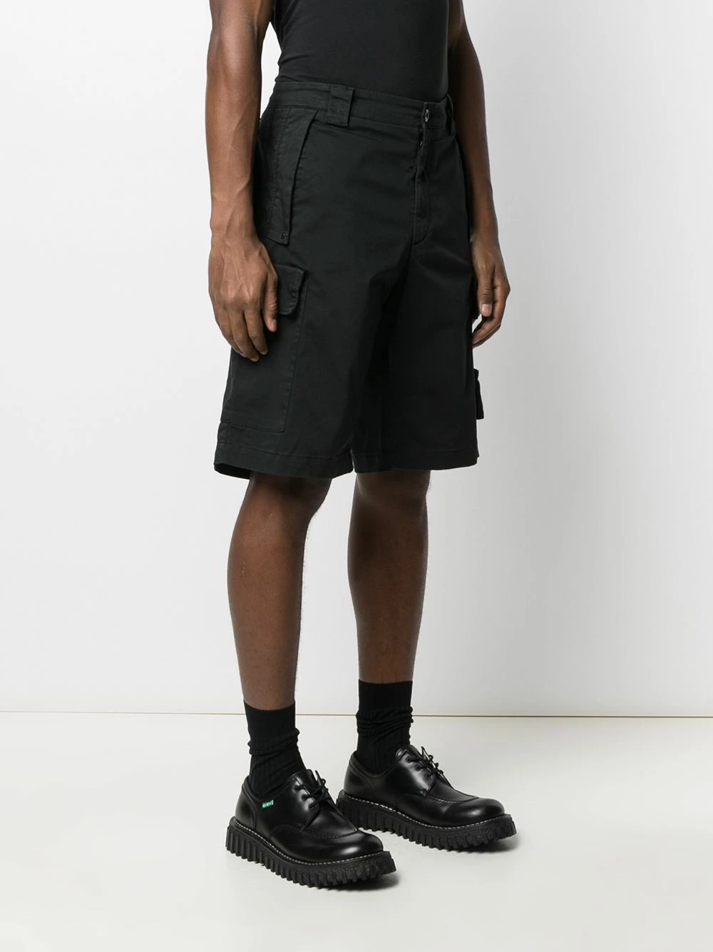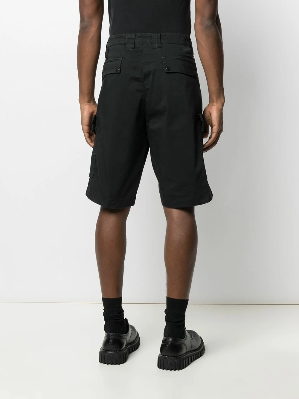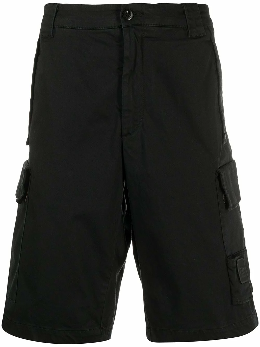 Hauteur genou, fermeture boutonnée, passants de ceinture, deux poches latérales plaquées, poches arrière à rabat. Couleur : noir. Matière : coton mélangé.