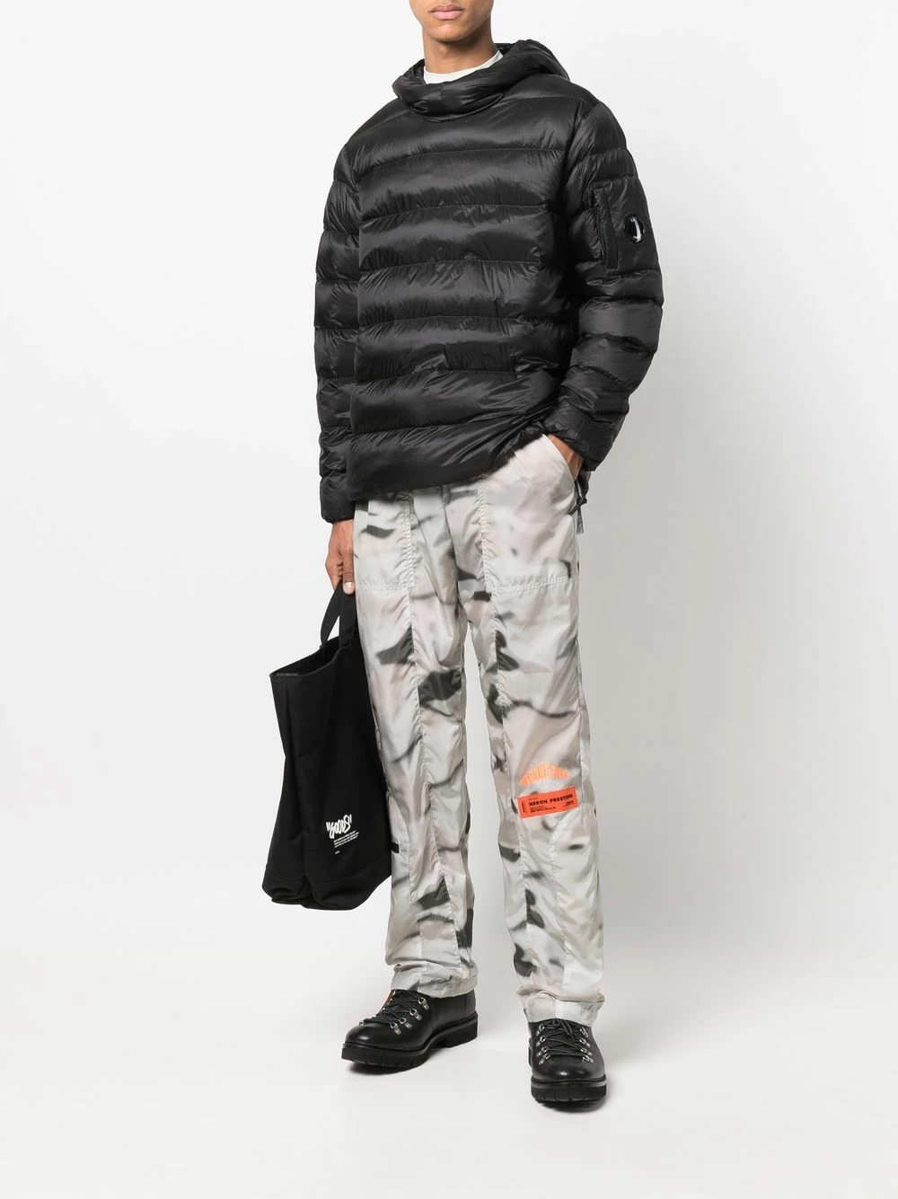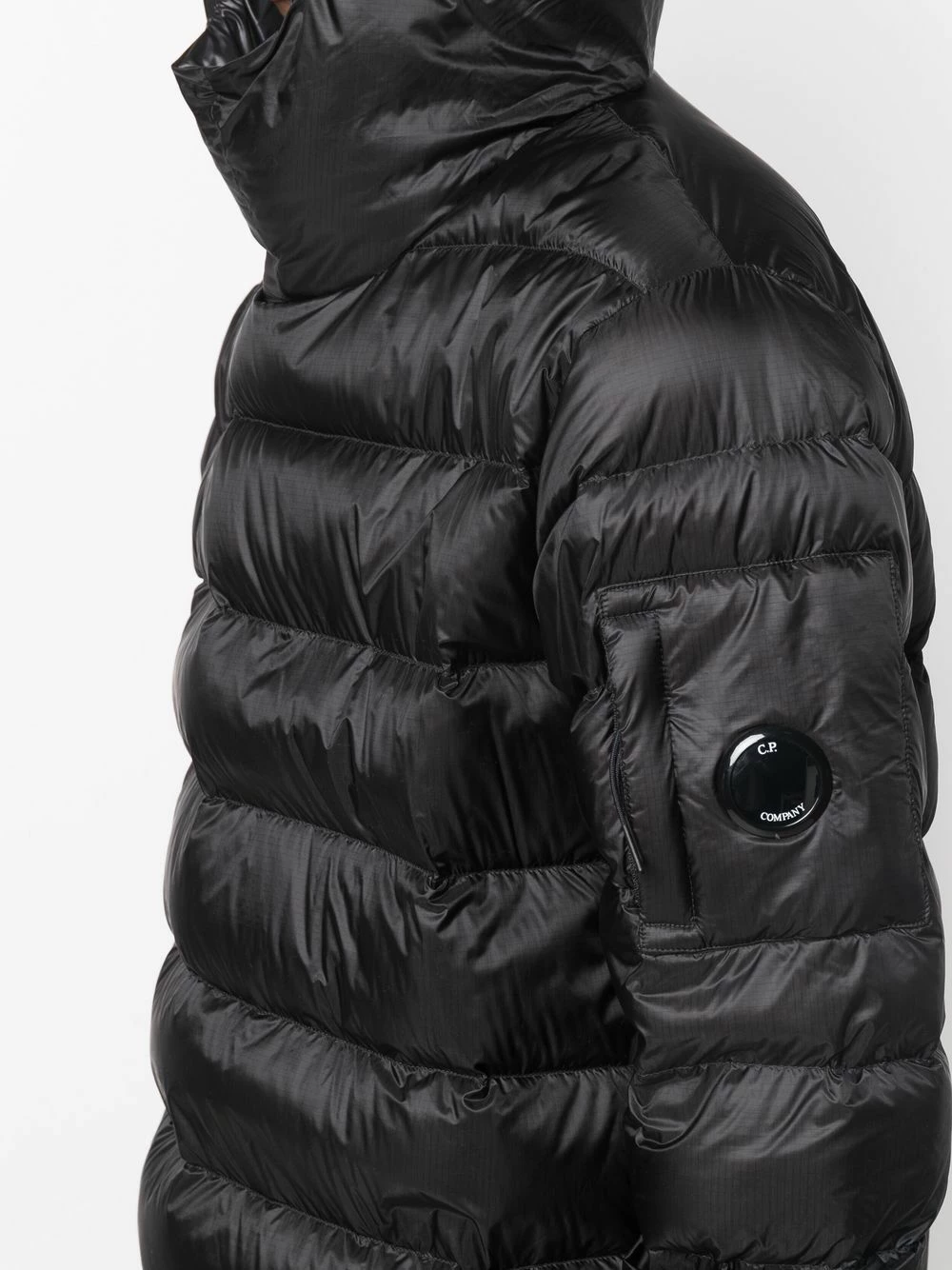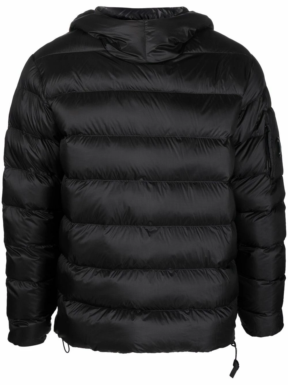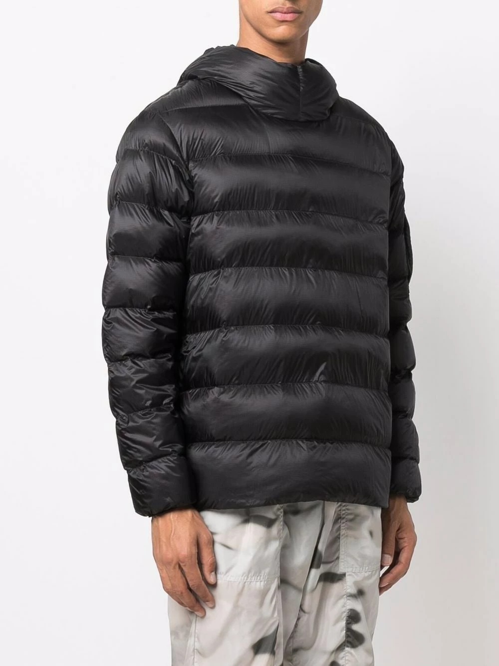 Design à enfiler, empiècements matelassés, garnissage en duvet, détail verre de lunette signature, capuche classique, poche latérale zippée, manches longues, ourlet droit. Couleur : noir. Matière : duvet.