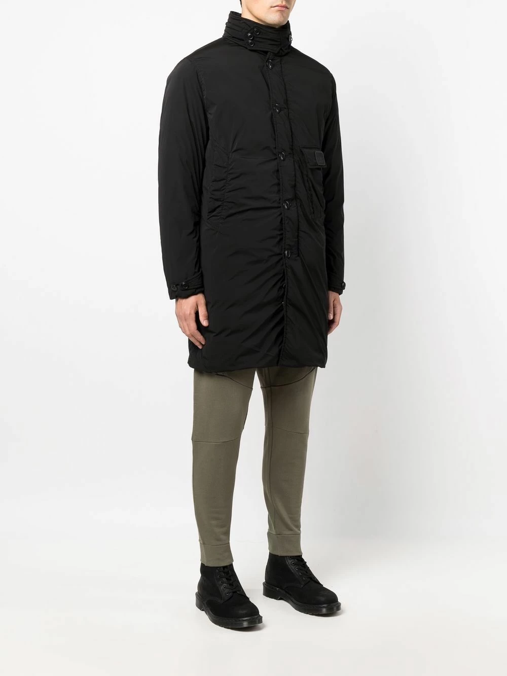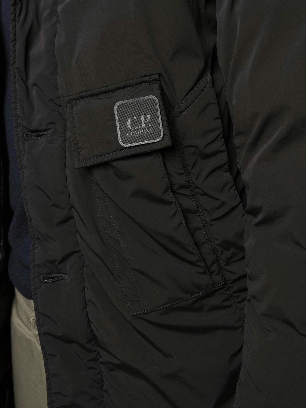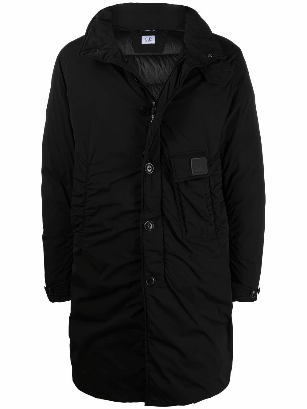 Design matelassé, patch logo sur le devant, capuche dissimulée, fermeture à zip et boutons sur le devant, manches longues, ourlet droit. Couleur : noir. Matière : duvet.