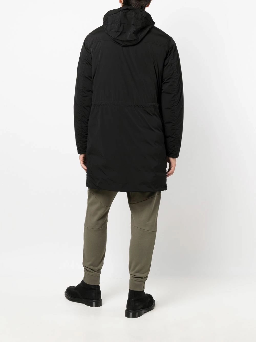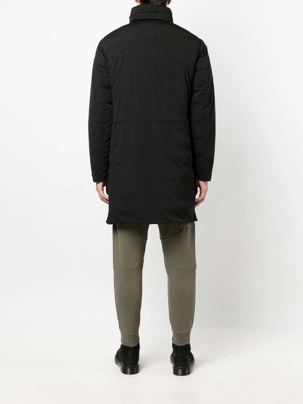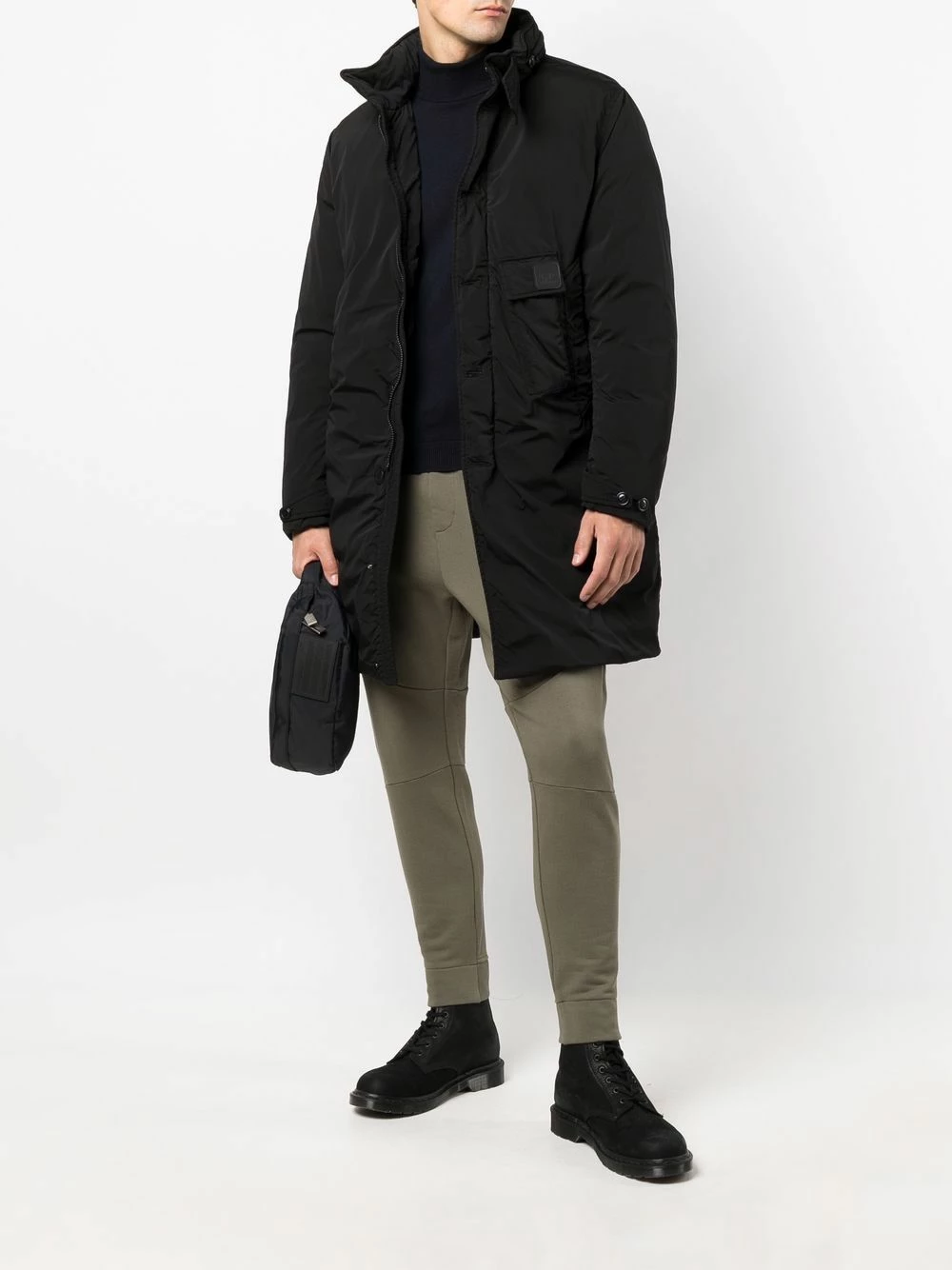 Design matelassé, patch logo sur le devant, capuche dissimulée, fermeture à zip et boutons sur le devant, manches longues, ourlet droit. Couleur : noir. Matière : duvet.