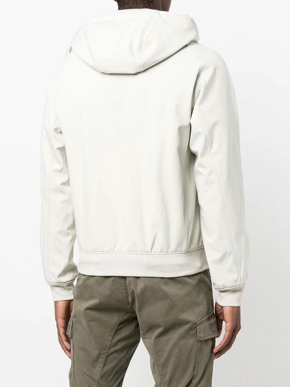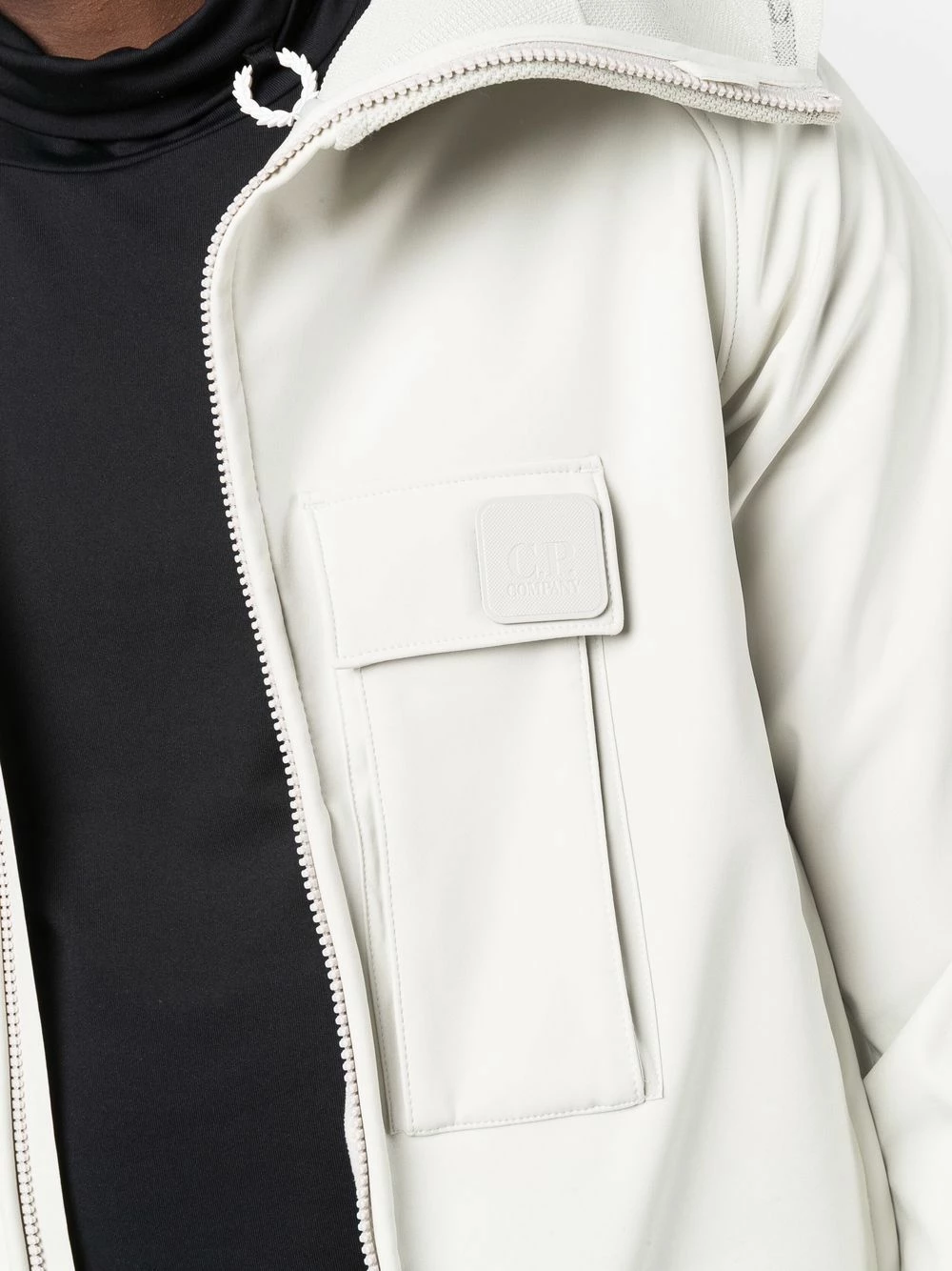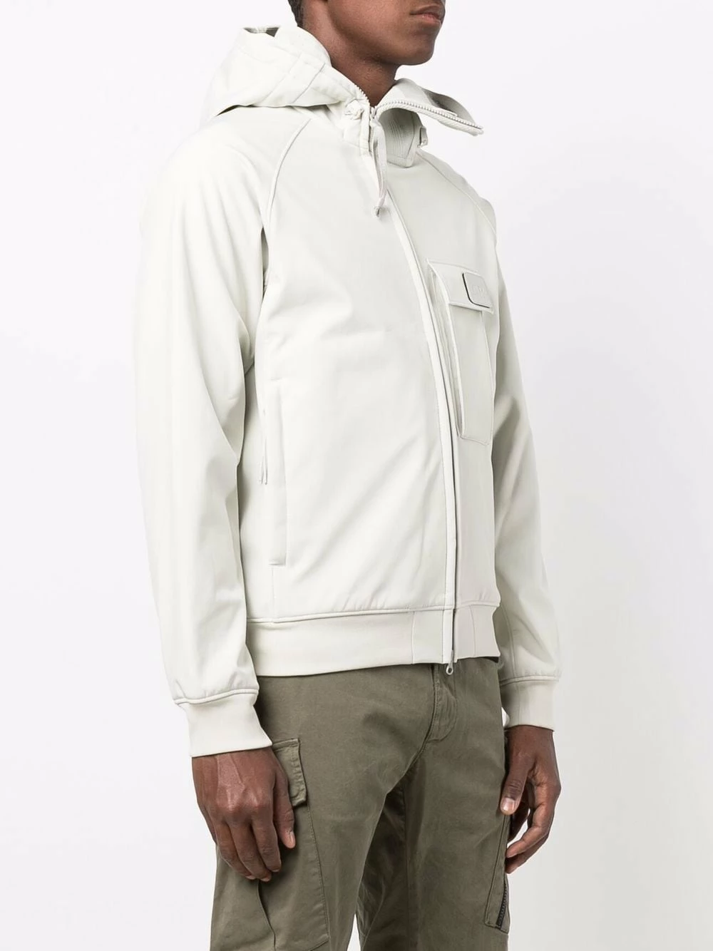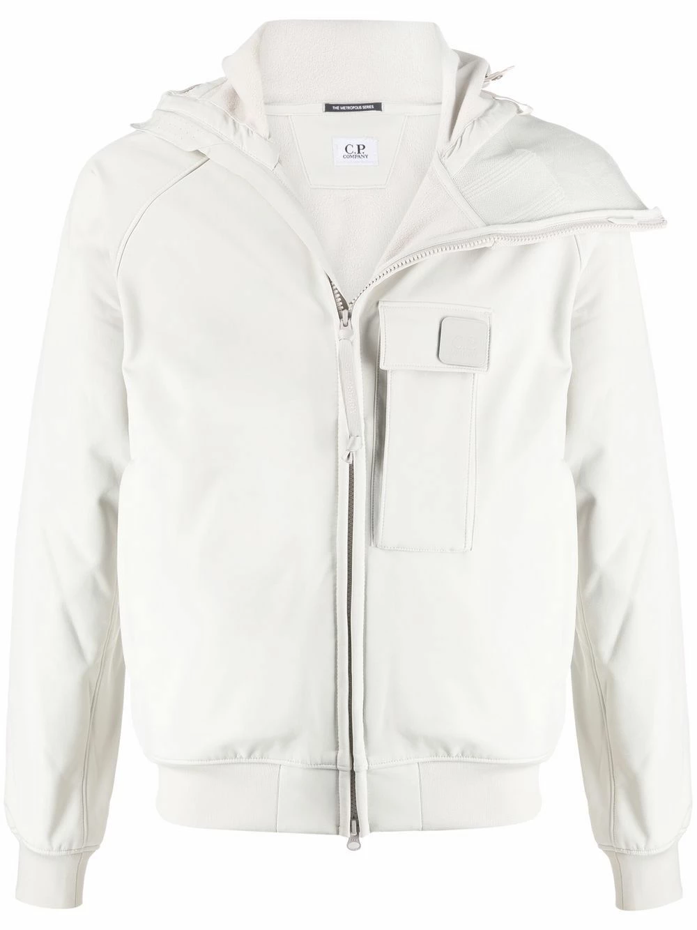 Patch logo sur le devant, col montant, capuche classique, fermeture zippée devant, manches longues, poignets élastiqués, poche poitrine à rabat, ourlet élastiqué. Couleur : blanc.