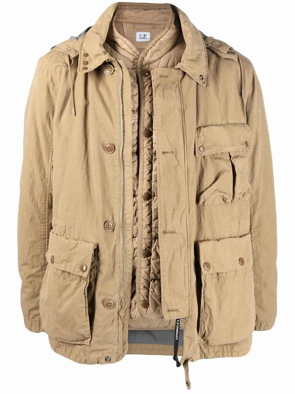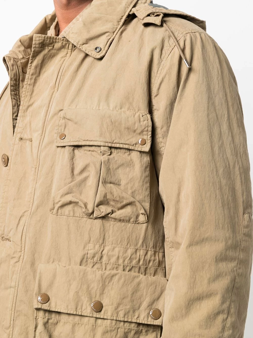 Capuche à lien de resserrage, fermeture à zip et boutons sur le devant, trois poches à rabat latérales, manches longues, col montant, boutonnière sur le devant, manches longues, pochette plaquée devant, ourlet droit. Matière : coton.