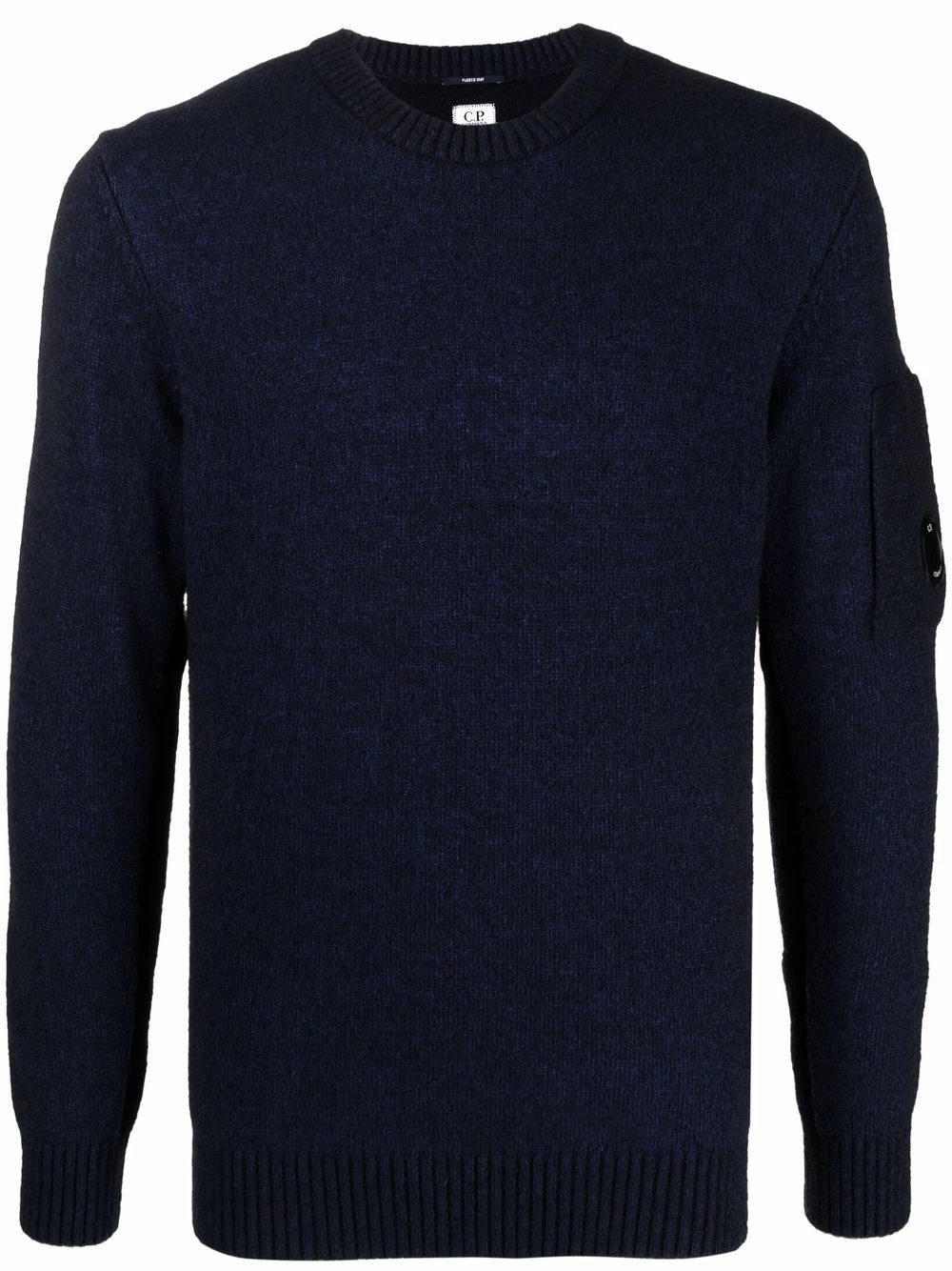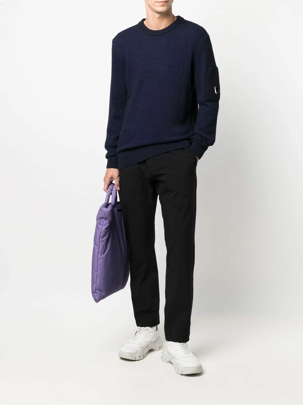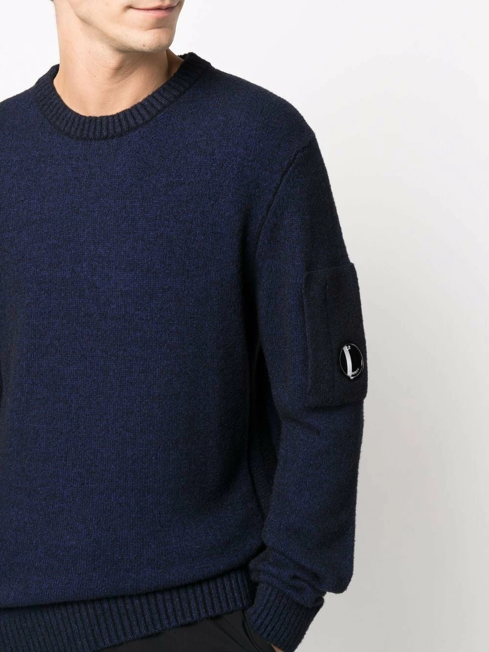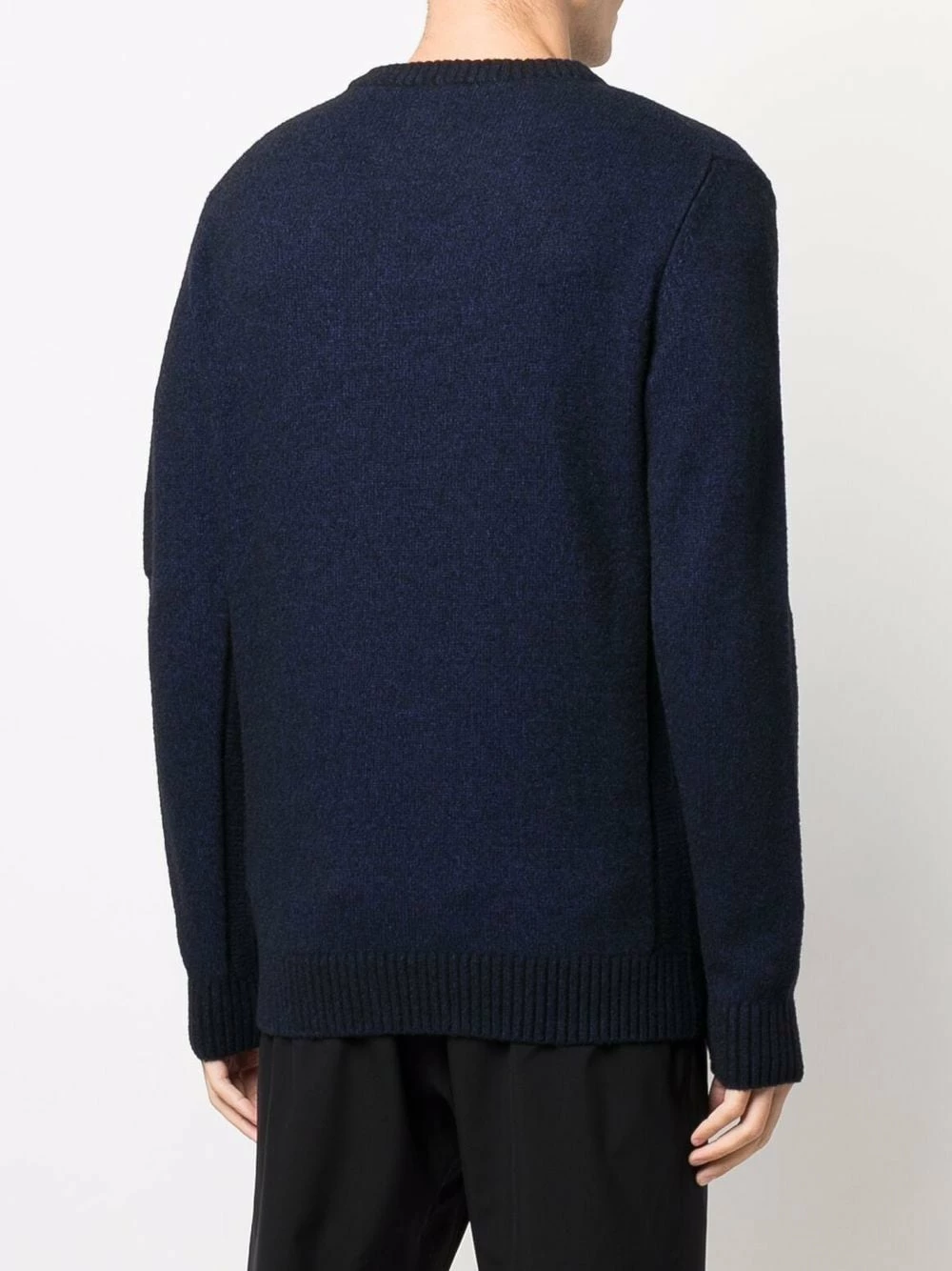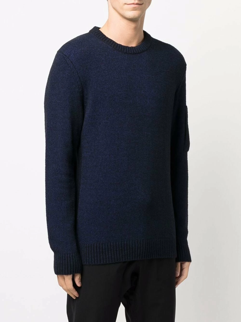 Bleu, maille fine, plaque logo, poche plaquée sur la manche, encolure ras du cou, manches longues, ourlet droit.