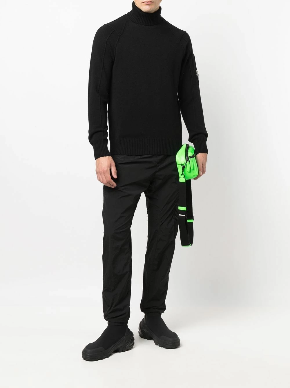 Ceinture élastique, patch logo sur le devant, coupe droite, détails de fronces. Couleur : noir.