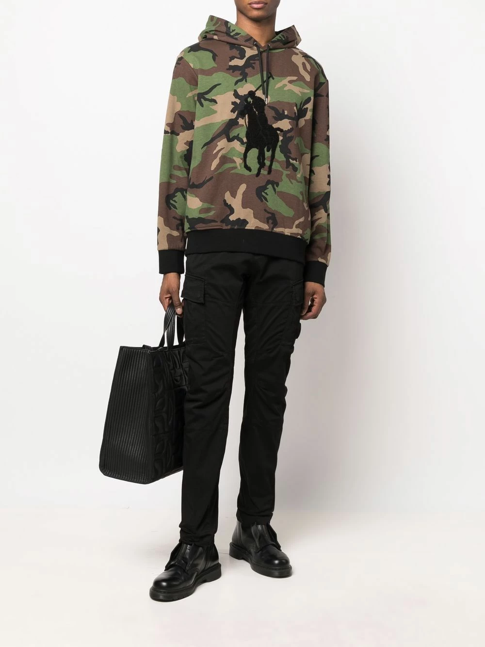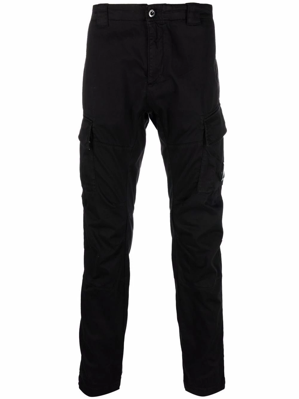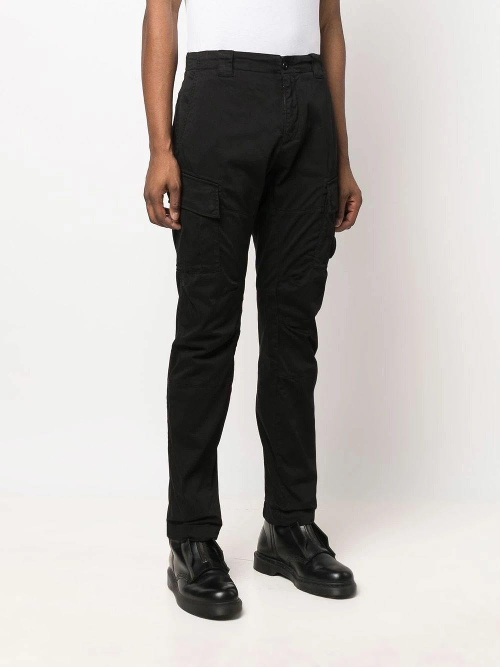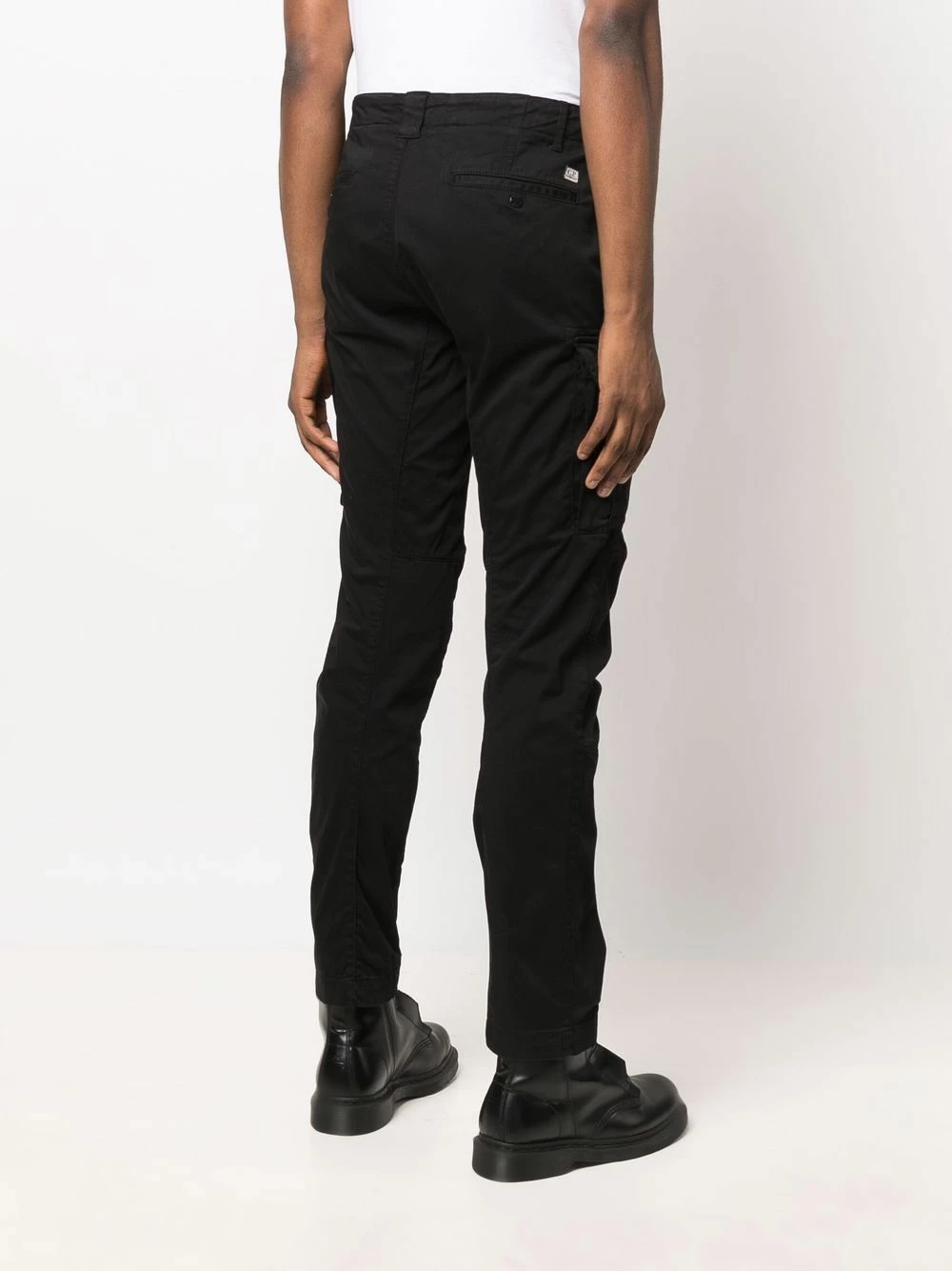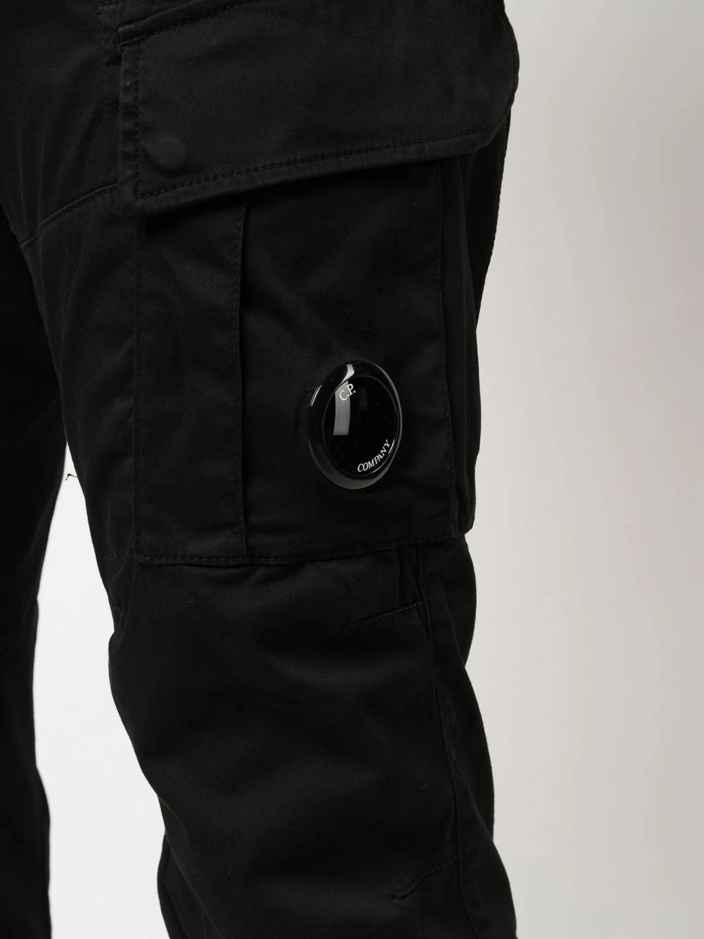 Détail verre de lunette signature, passants de ceinture, fermeture à zip et boutons sur le devant, deux poches latérales fendues, poches latérales cargo, poches arrière passepoilées. Couleur : noir.