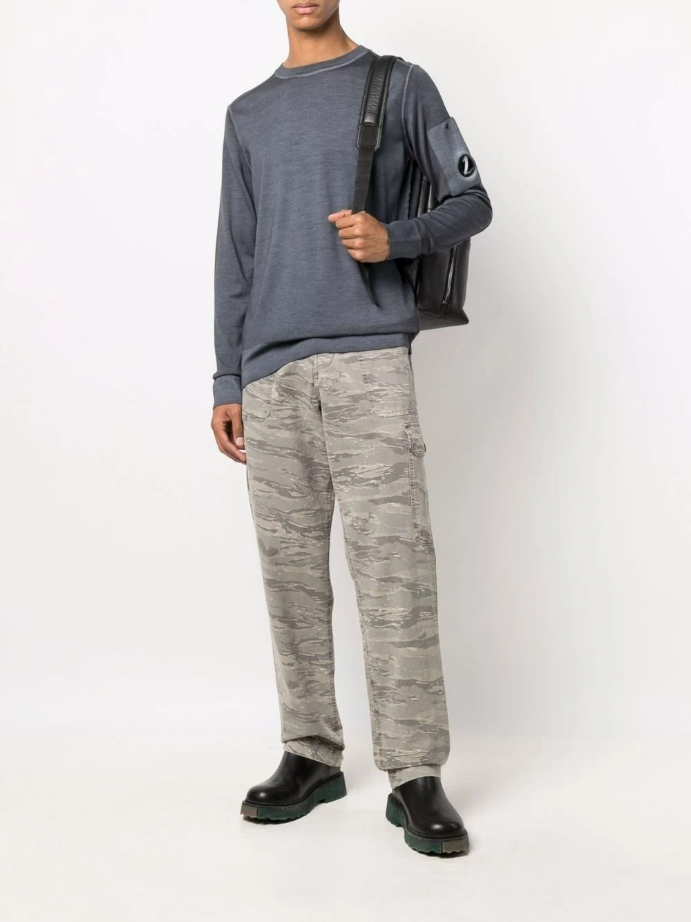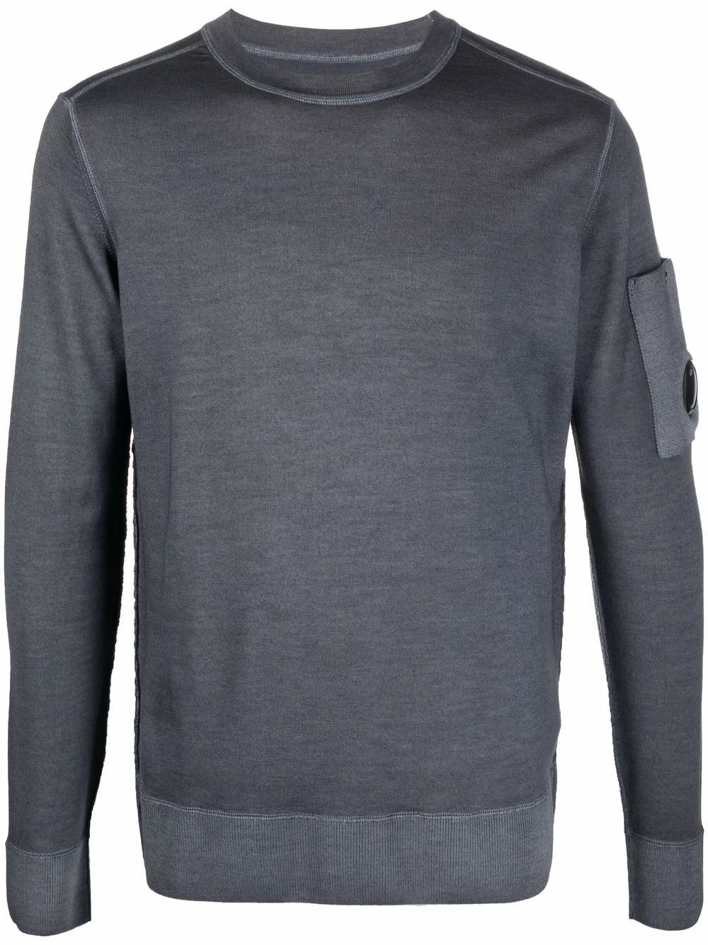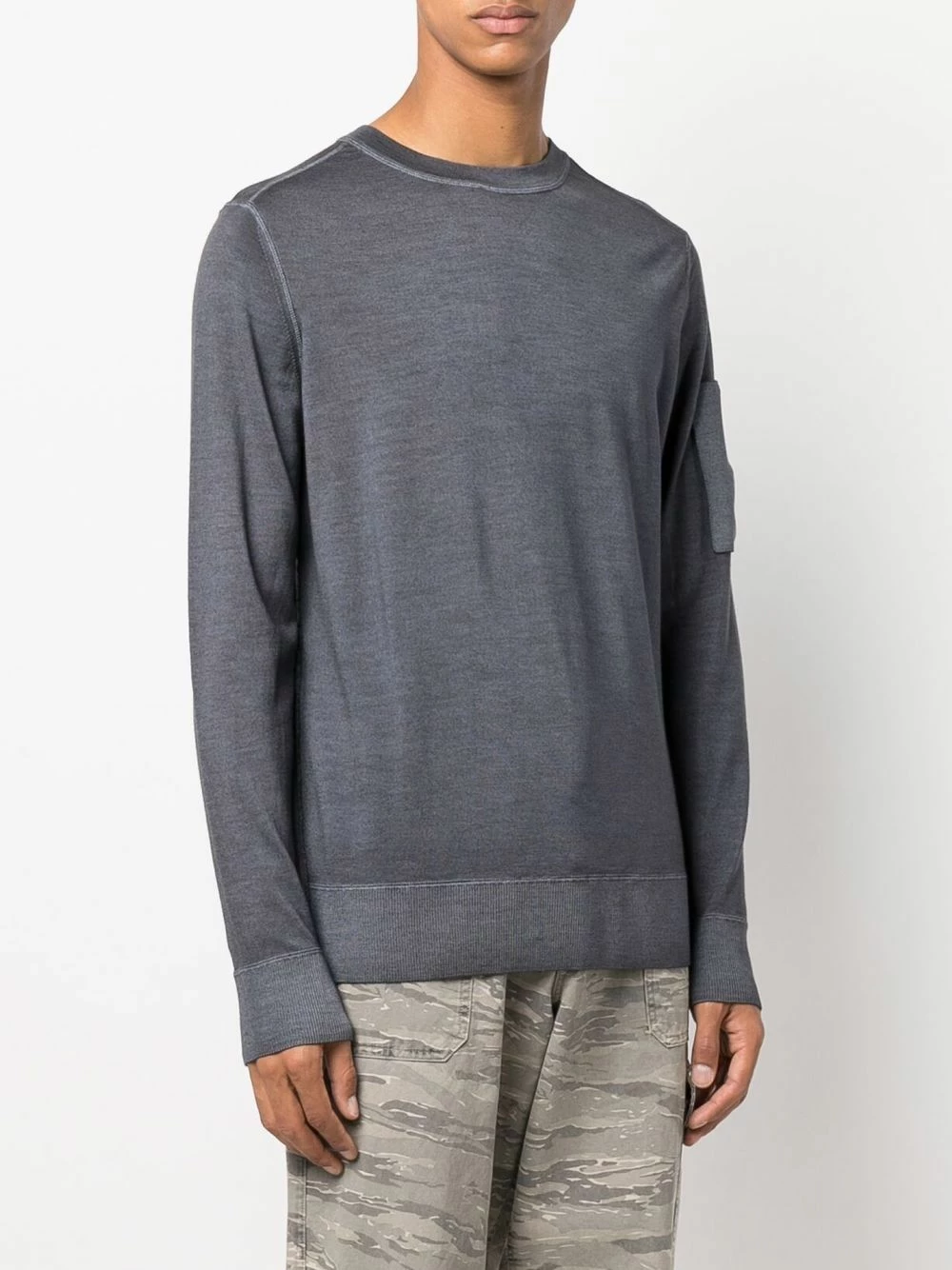 Patch logo sur la manche, encolure ras du cou, manches longues, manches à poignets resserrés. Couleur : bleu. Matière : laine.
