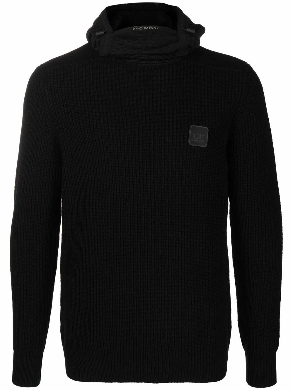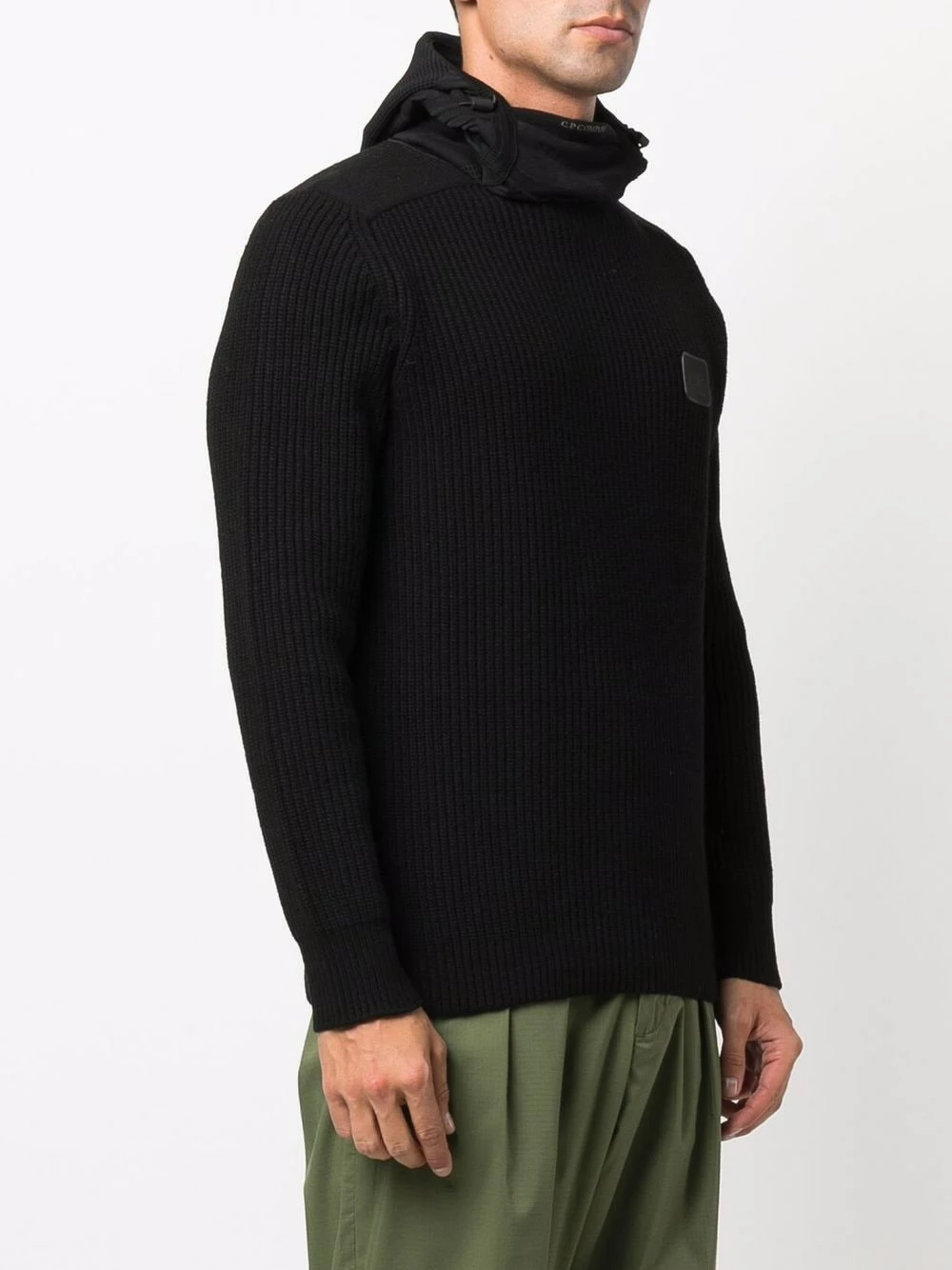 Maille nervurée, patch poitrine à logo, capuche classique, manches longues, ourlet droit. Couleur : noir.