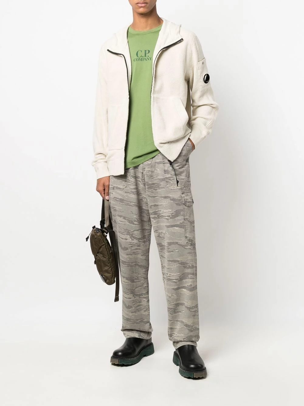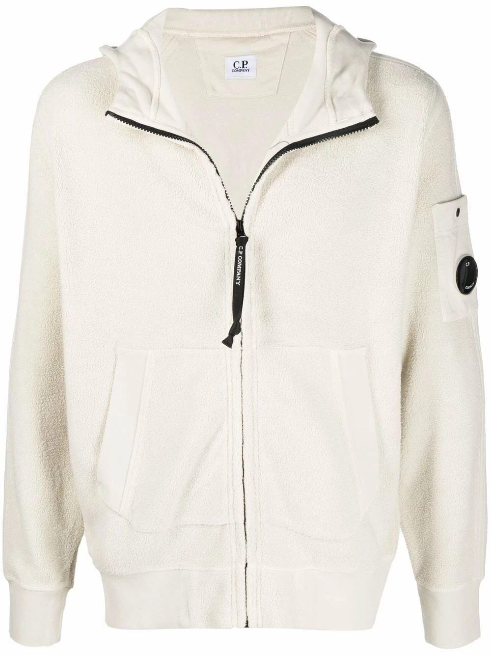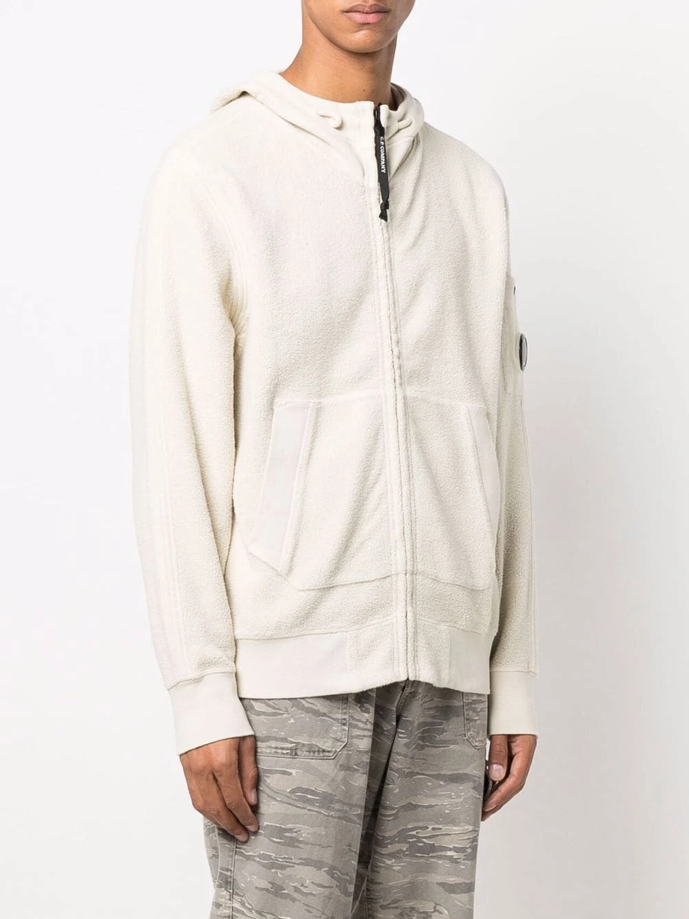Patch logo sur la manche, capuche classique, fermeture zippée devant, manches longues, manches à poignets resserrés, deux poches latérales fendues. Couleur : blanc. Matière : coton mélangé.