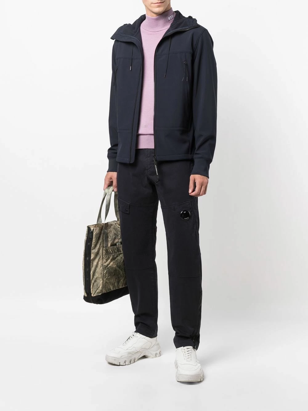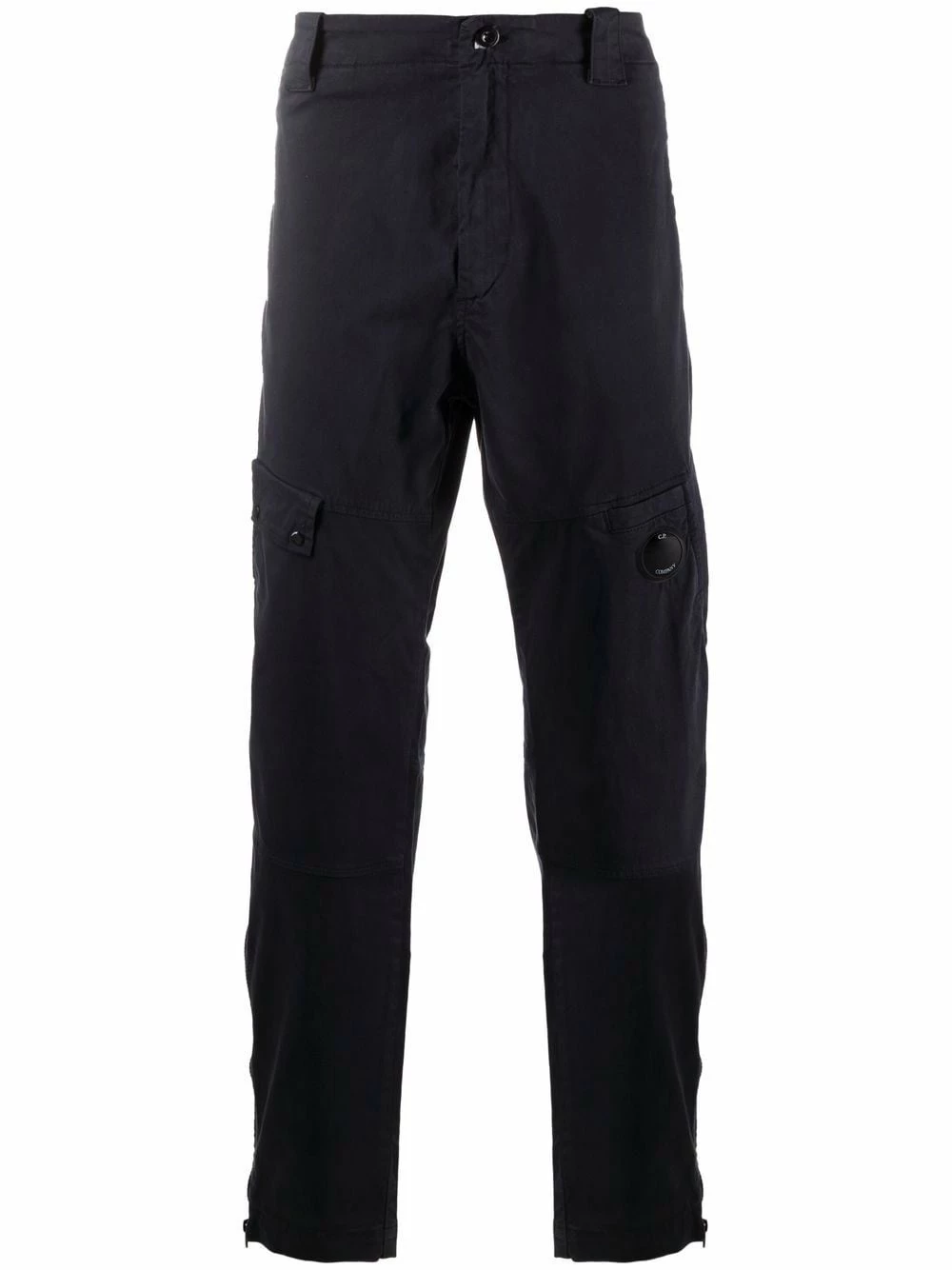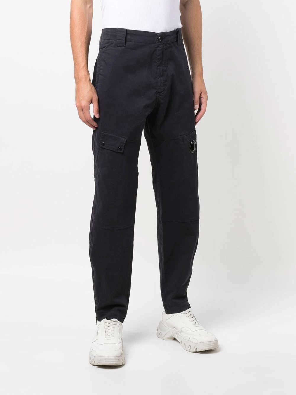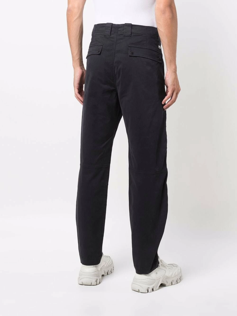 Taille mi-haute, passants de ceinture, fermeture à zip et boutons sur le devant, deux poches latérales fendues, poches arrière à rabat.
