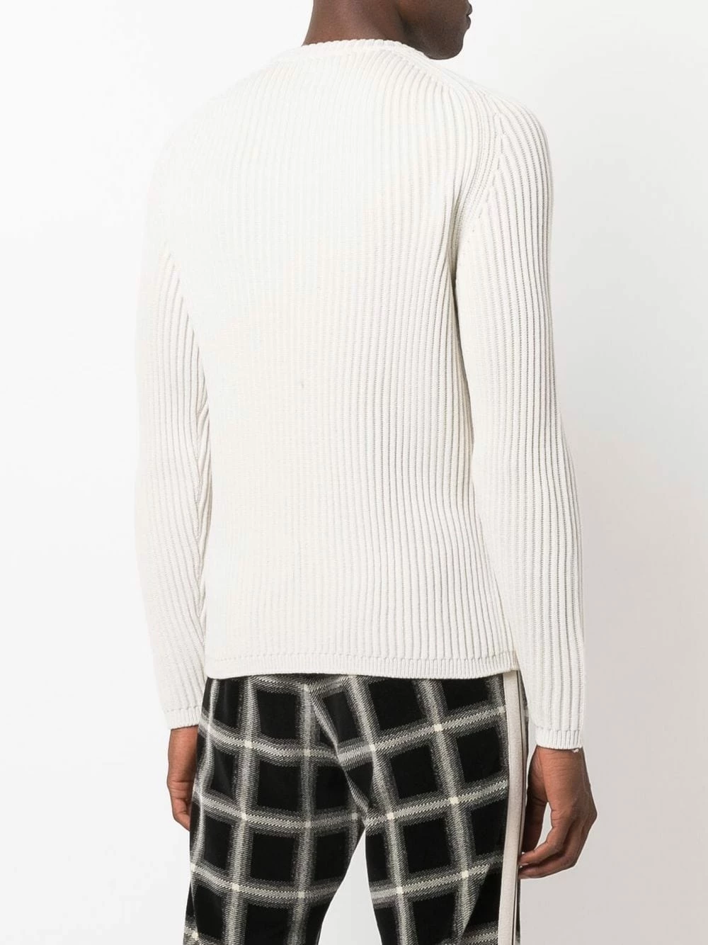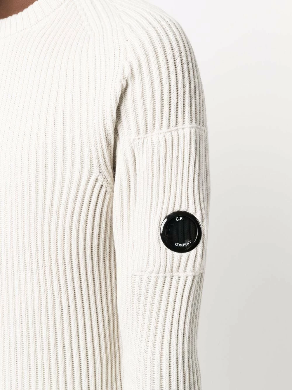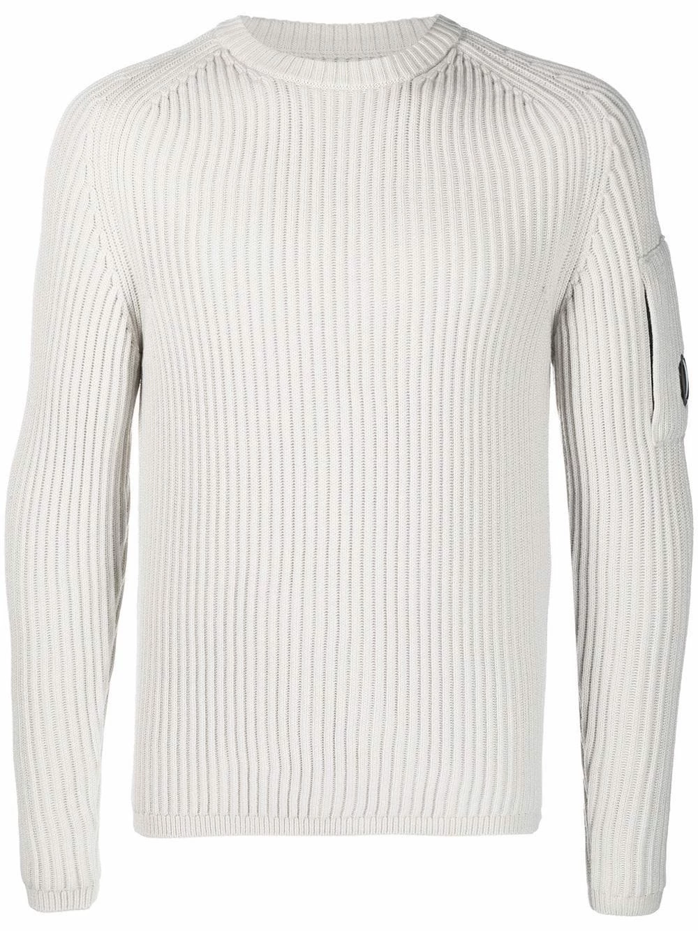 Maille nervurée, détail verre de lunette signature, encolure ras du cou, manches longues, poche zippée sur la manche, ourlet droit.