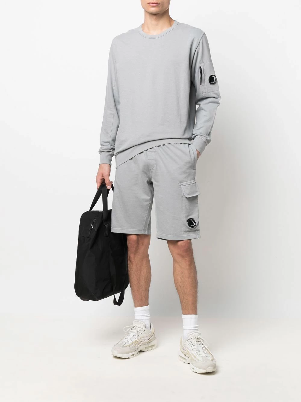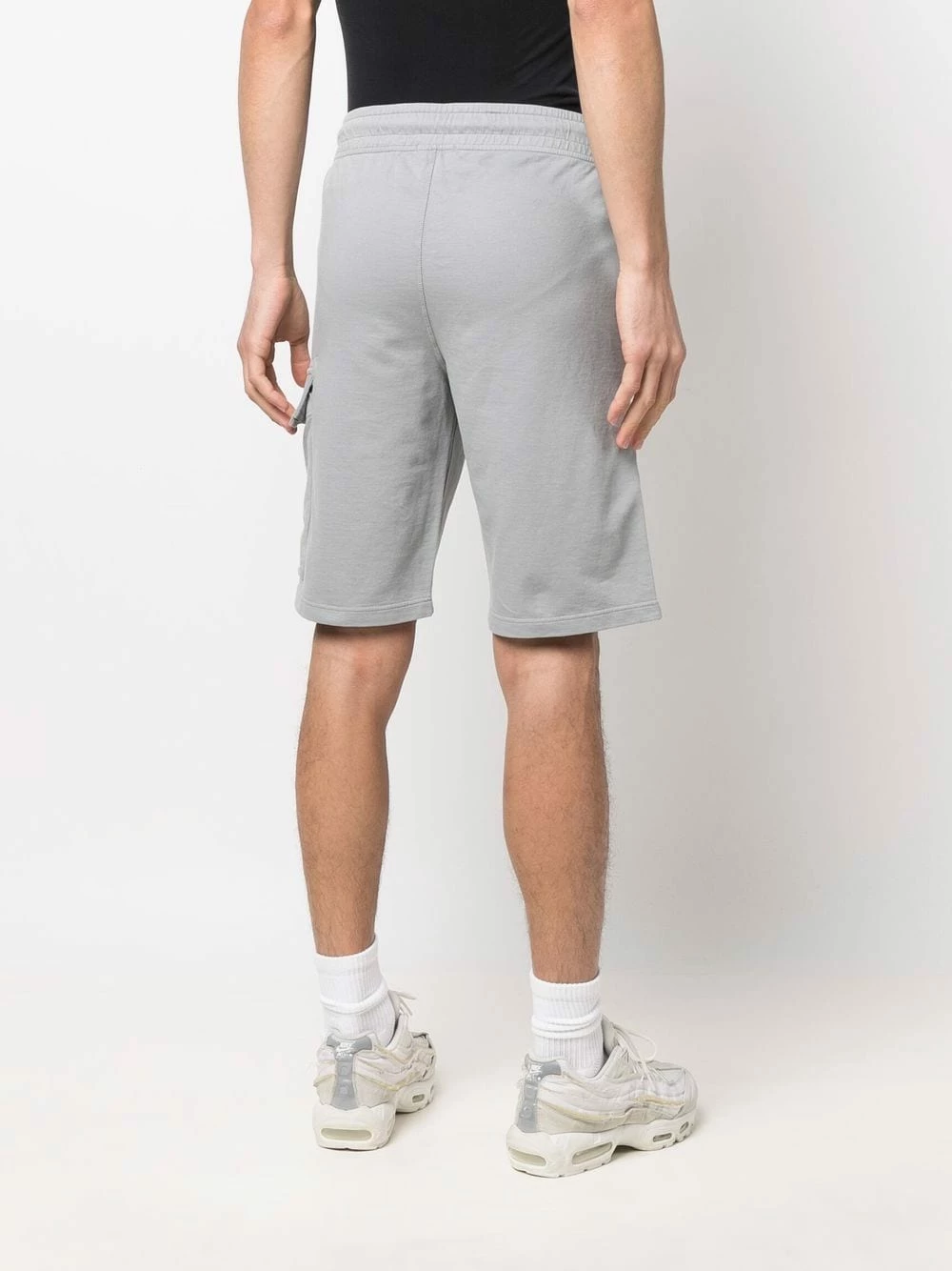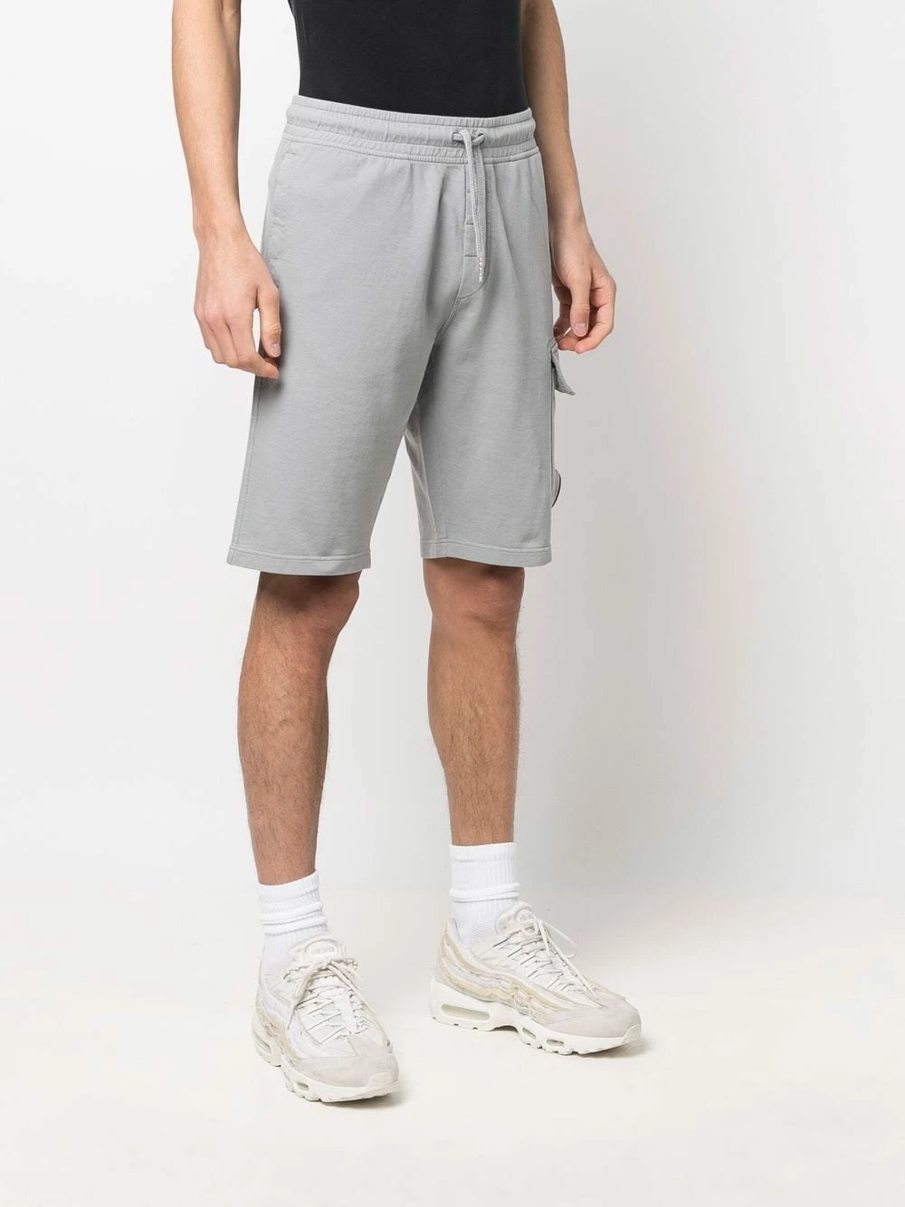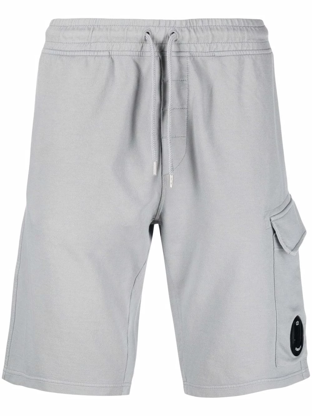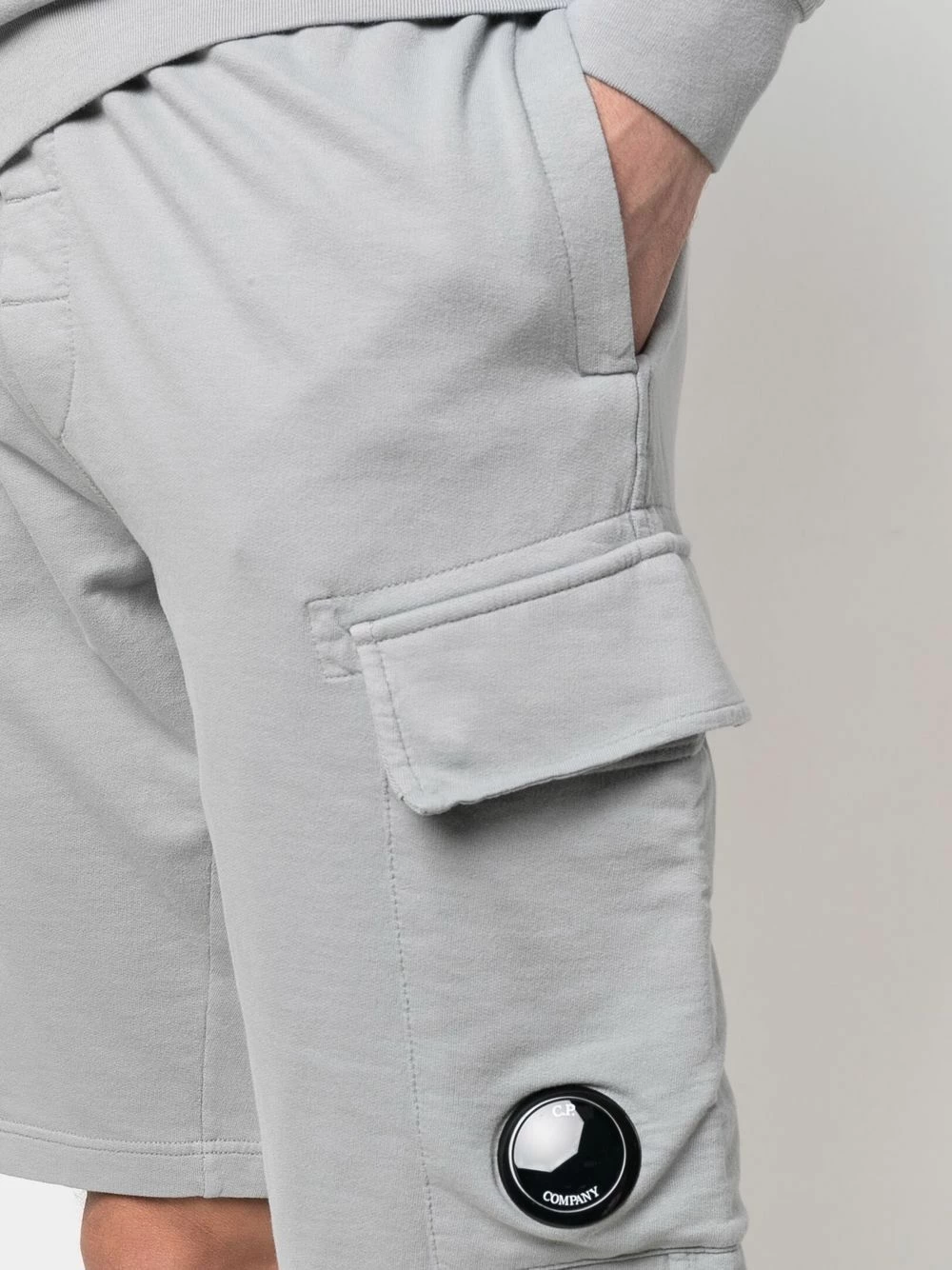 Détail verre de lunette signature, ceinture élastique, lien de resserrage, deux poches latérales fendues, poche latérale à rabat, longueur au dessus du genou. Couleur : gris. Matière : coton.