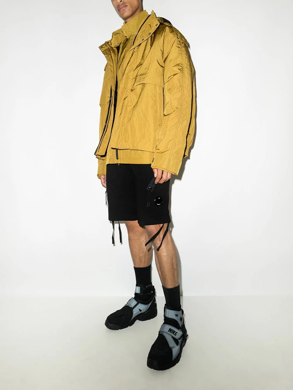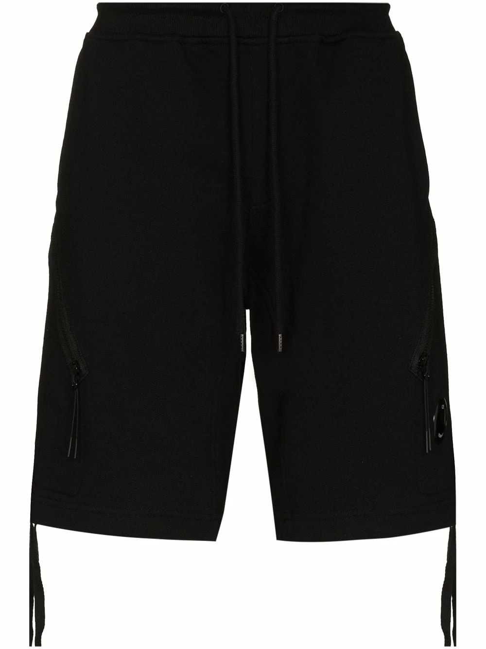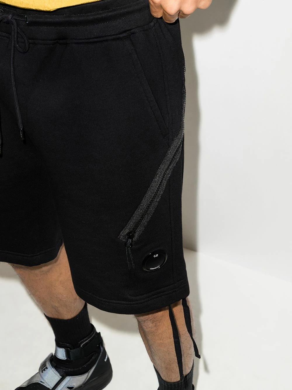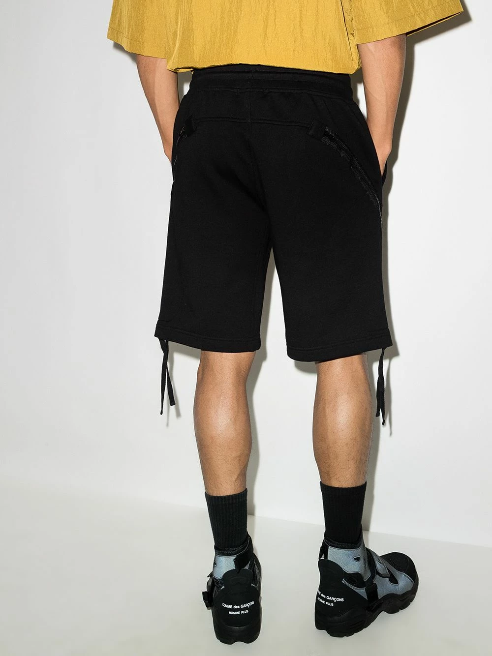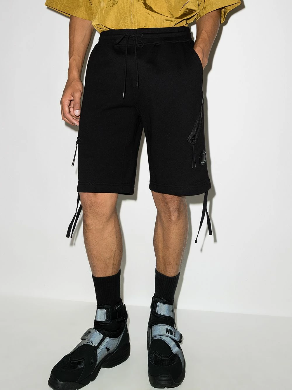 Patch logo sur le côté, taille élastique à lien de resserrage, coupe droite, hauteur genou, ourlet à lien de resserrage, deux poches latérales fendues, deux poches latérales zippées. Couleur : noir. Matière : coton.