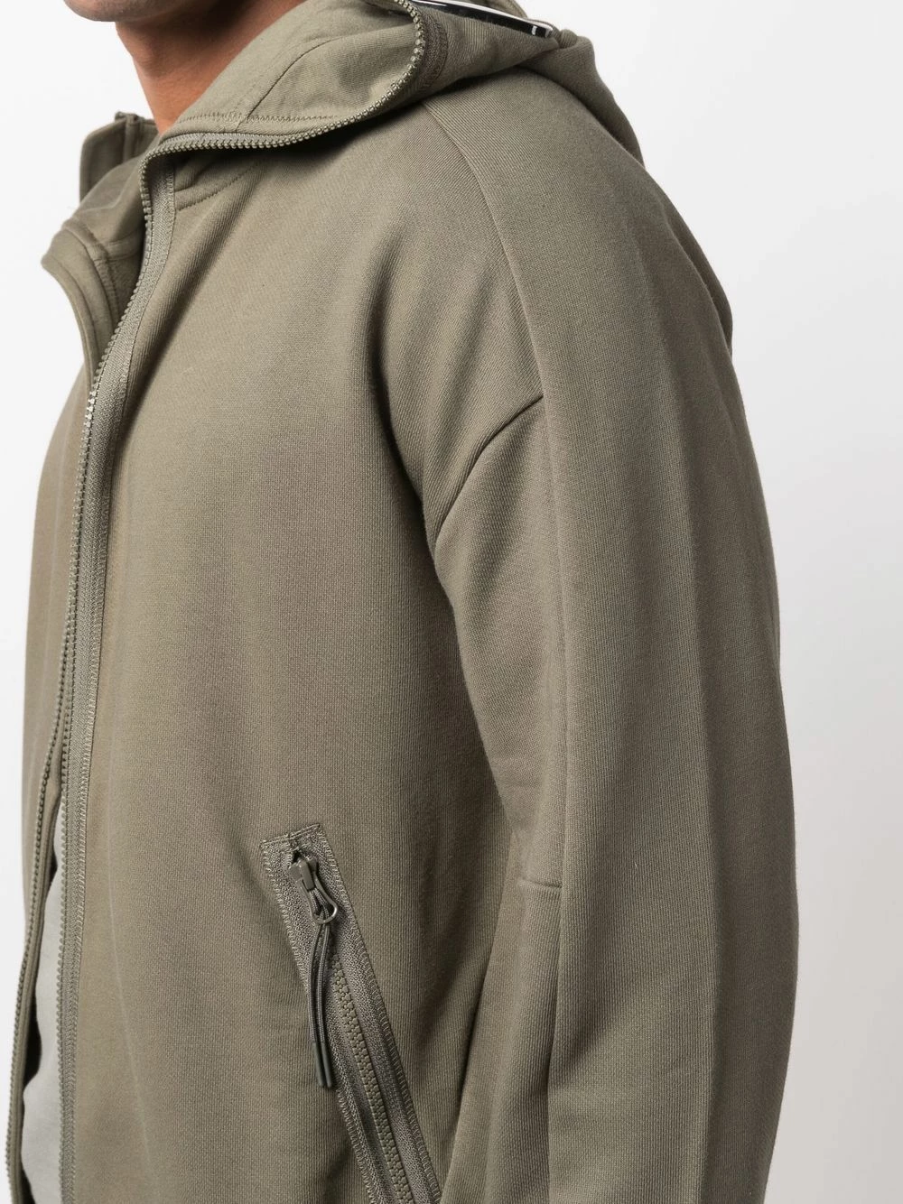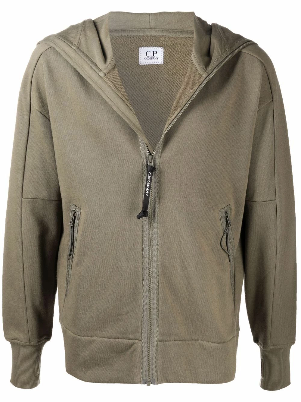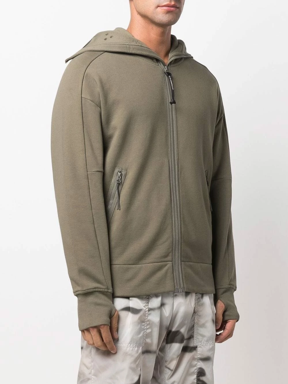 Capuche classique, fermeture zippée devant, manches longues, deux poches latérales zippées. Matière : coton.