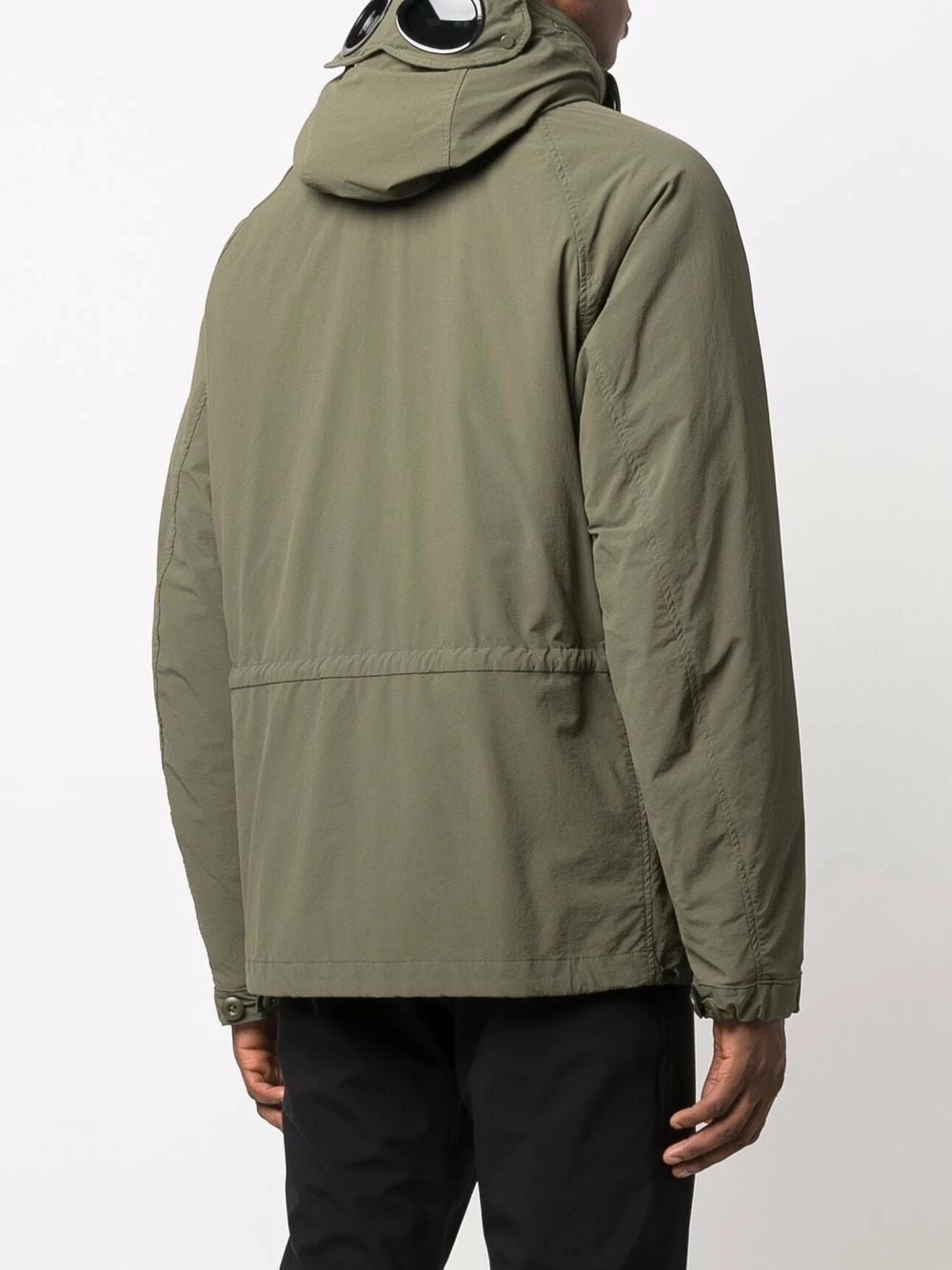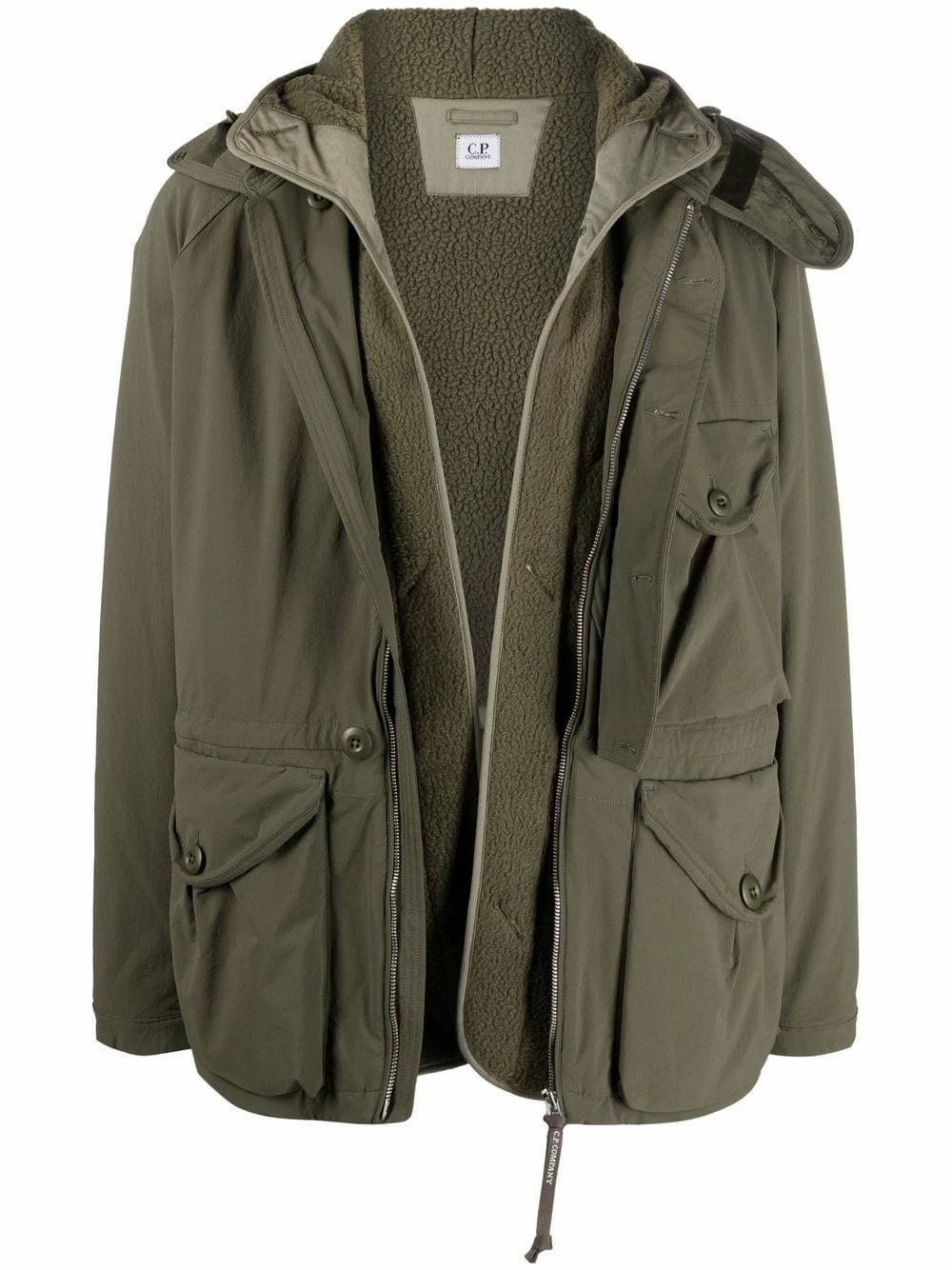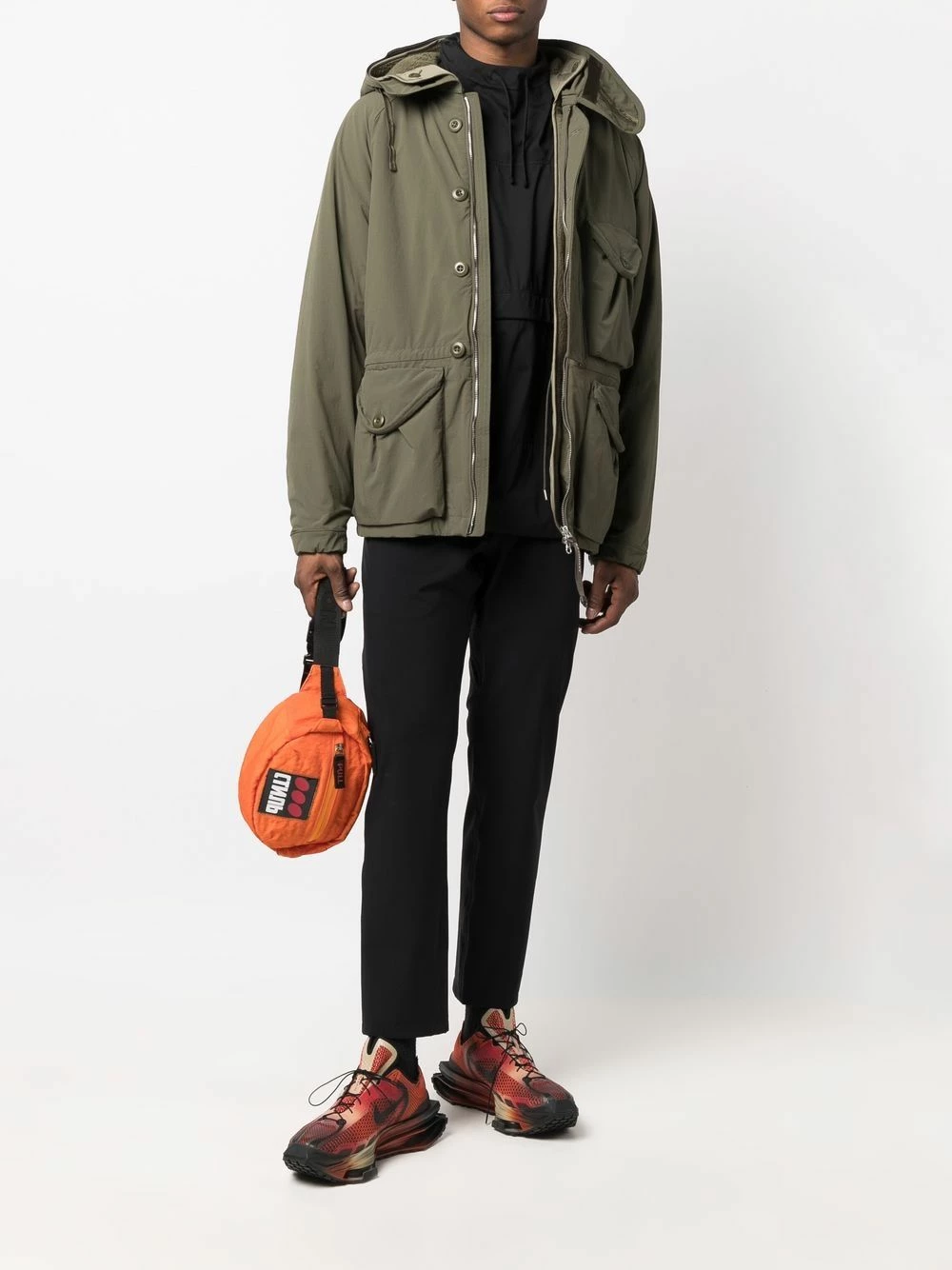 Effet superposé, capuche à lien de resserrage, boutonnière sur le devant, manches longues, poche poitrine boutonnée, deux poches passepoilées boutonnées sur le devant. Matière : coton.