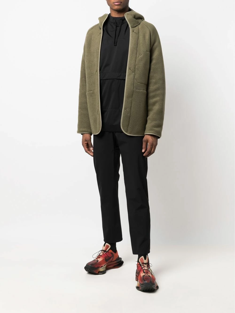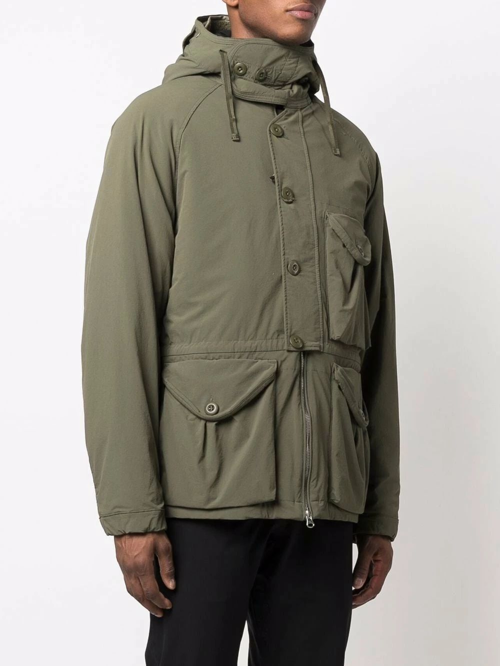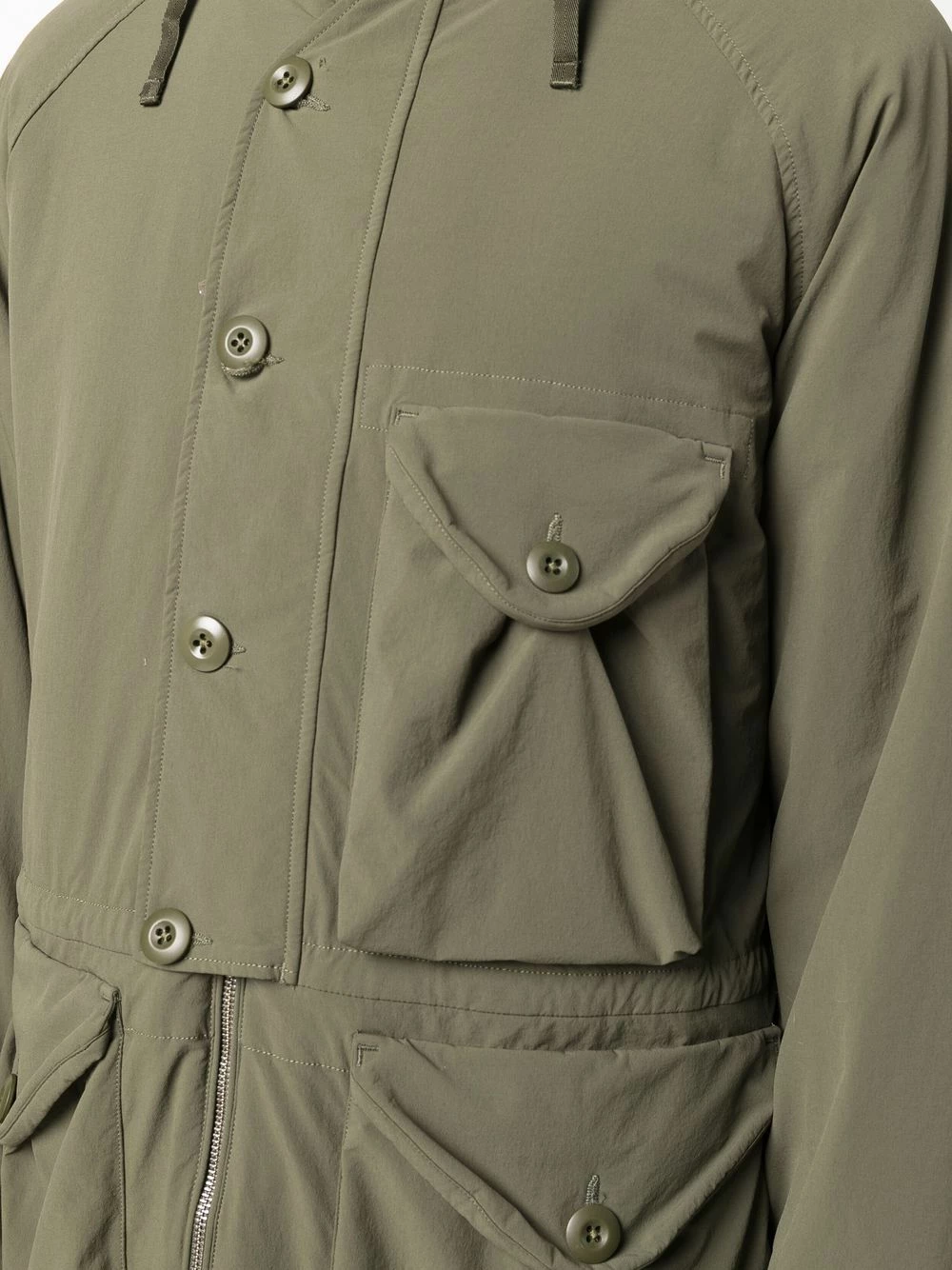 Effet superposé, capuche à lien de resserrage, boutonnière sur le devant, manches longues, poche poitrine boutonnée, deux poches passepoilées boutonnées sur le devant. Matière : coton.