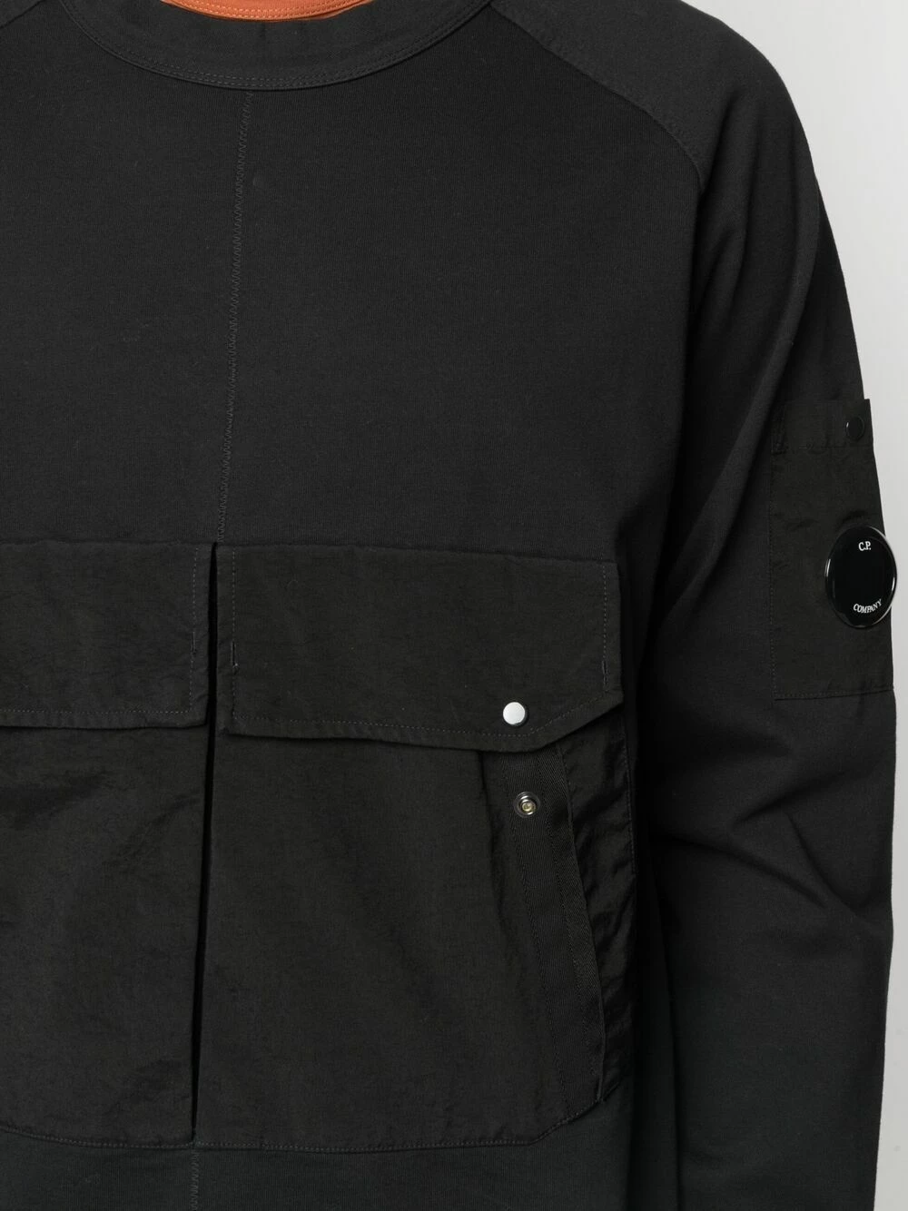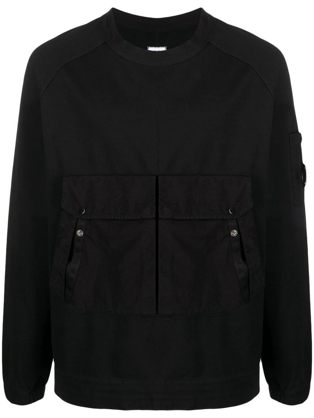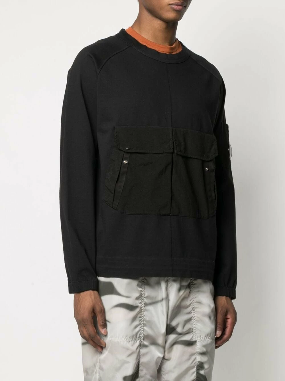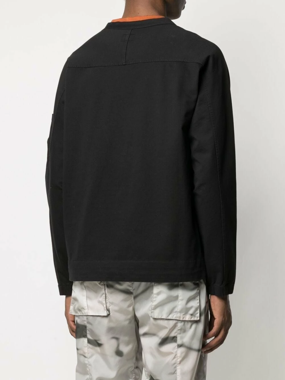Encolure ras du cou, manches longues, deux poches à rabat sur le devant, détail nervuré. Couleur : noir. Matière : coton.