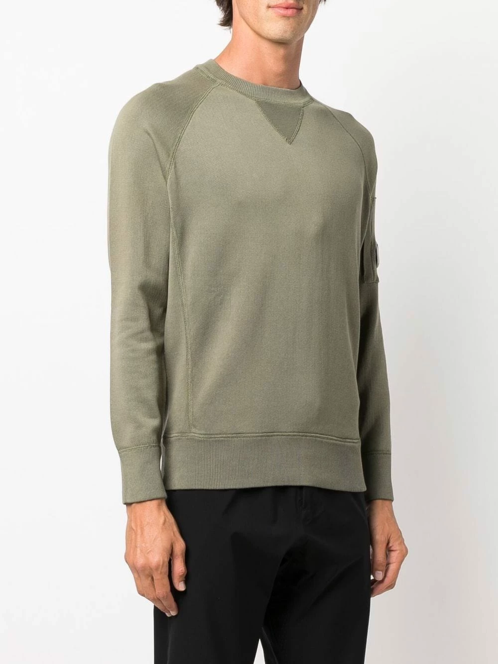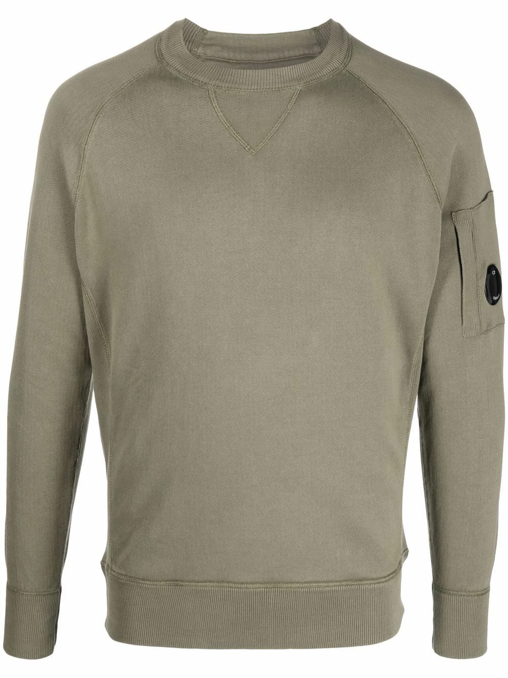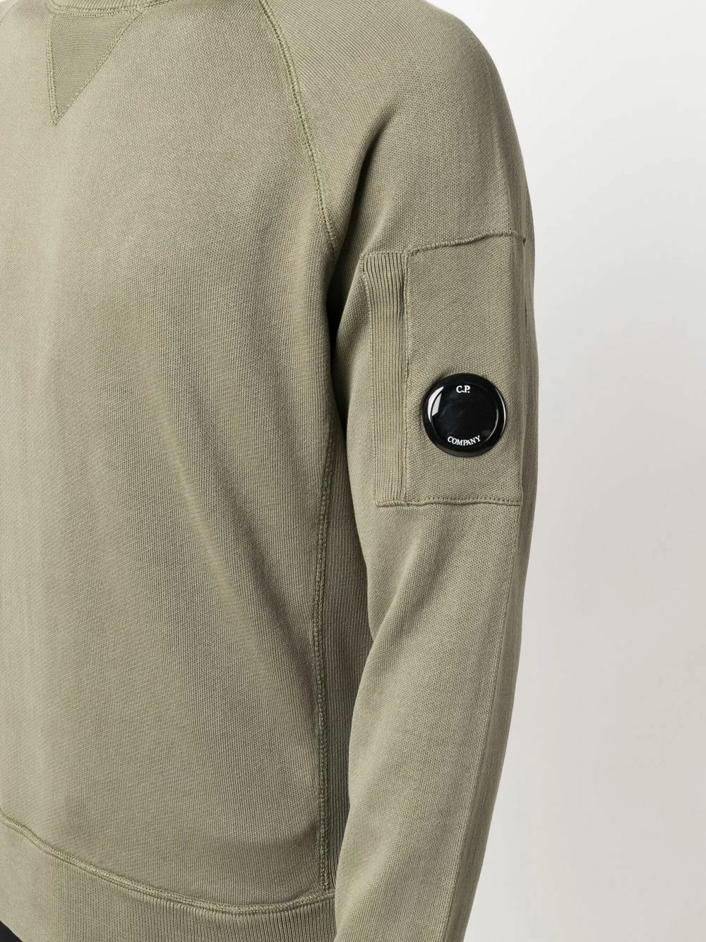 Détail verre de lunette signature, encolure ras du cou, manches longues, ourlet nervuré. Couleur : vert.