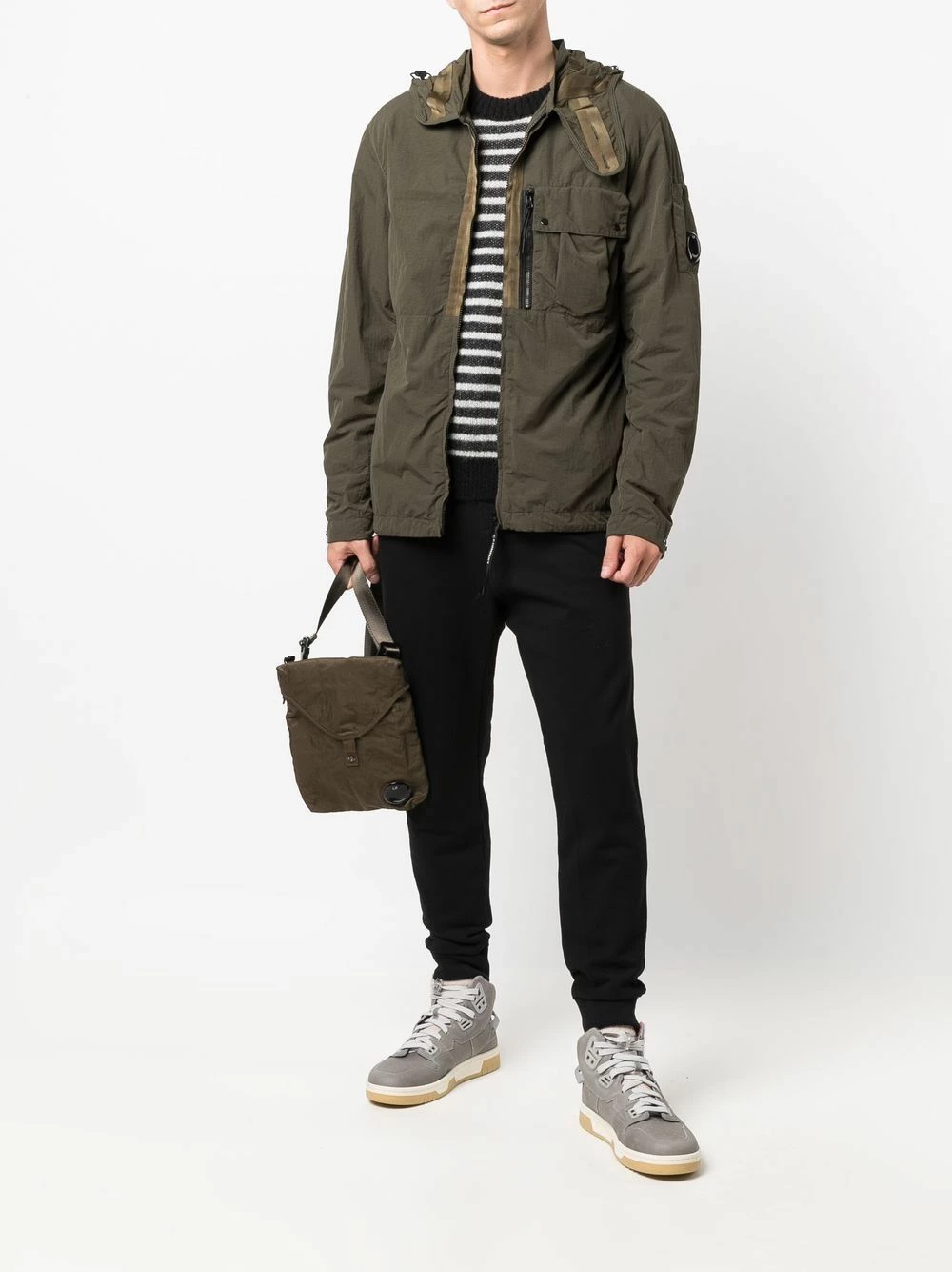 Détail verre de lunette signature, capuche classique, col montant, manches longues, poche zippée sur la manche, poche poitrine plaquée, fermeture zippée devant. Matière : coton.