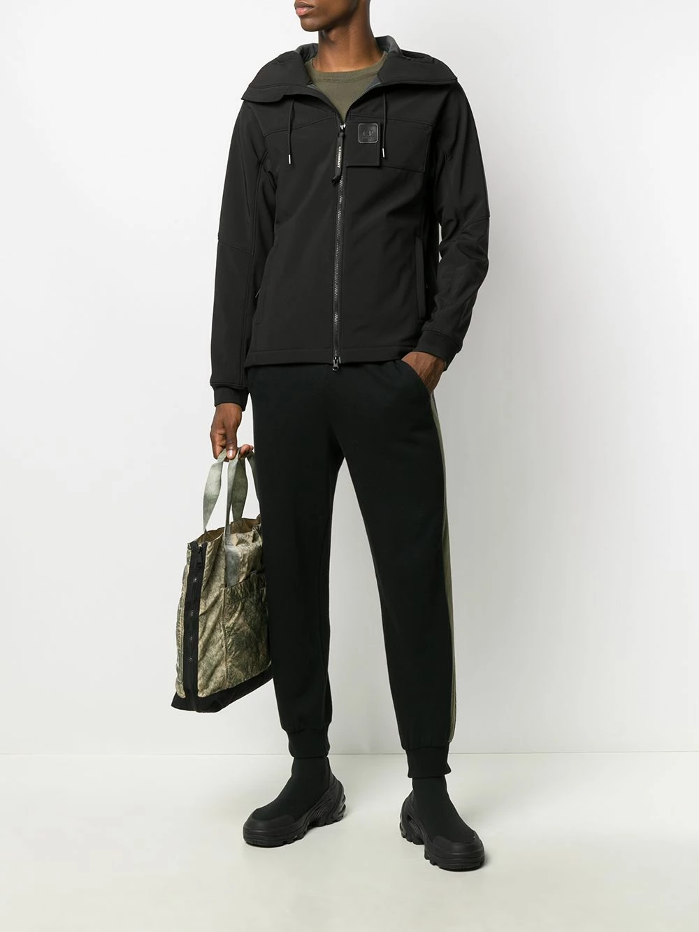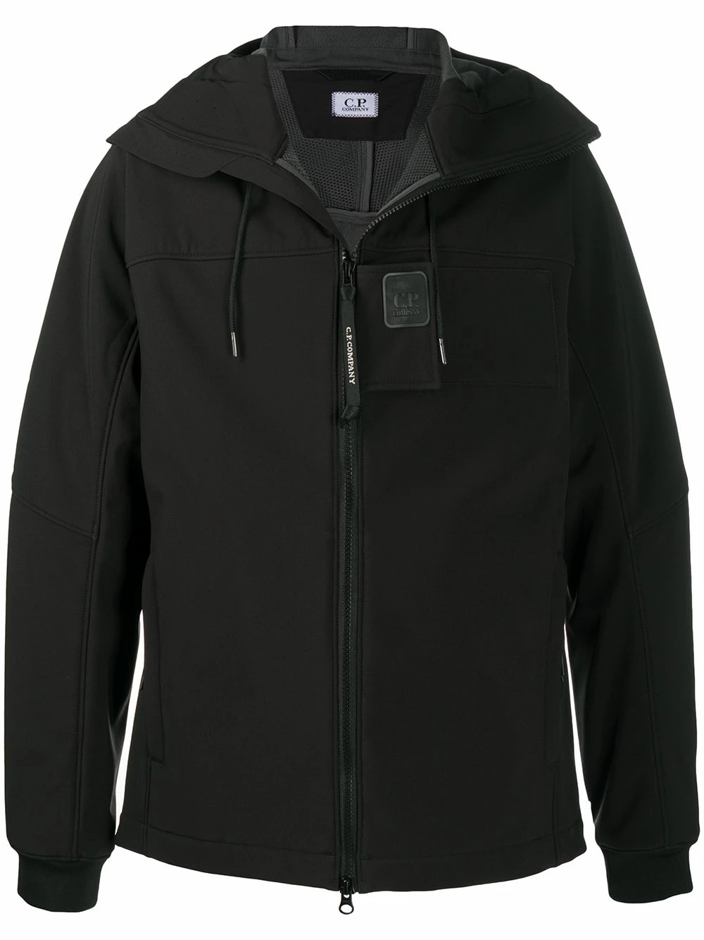 Patch logo sur le devant, capuche à lien de resserrage, fermeture zippée devant, manches longues. Couleur : noir. Matière : coton.