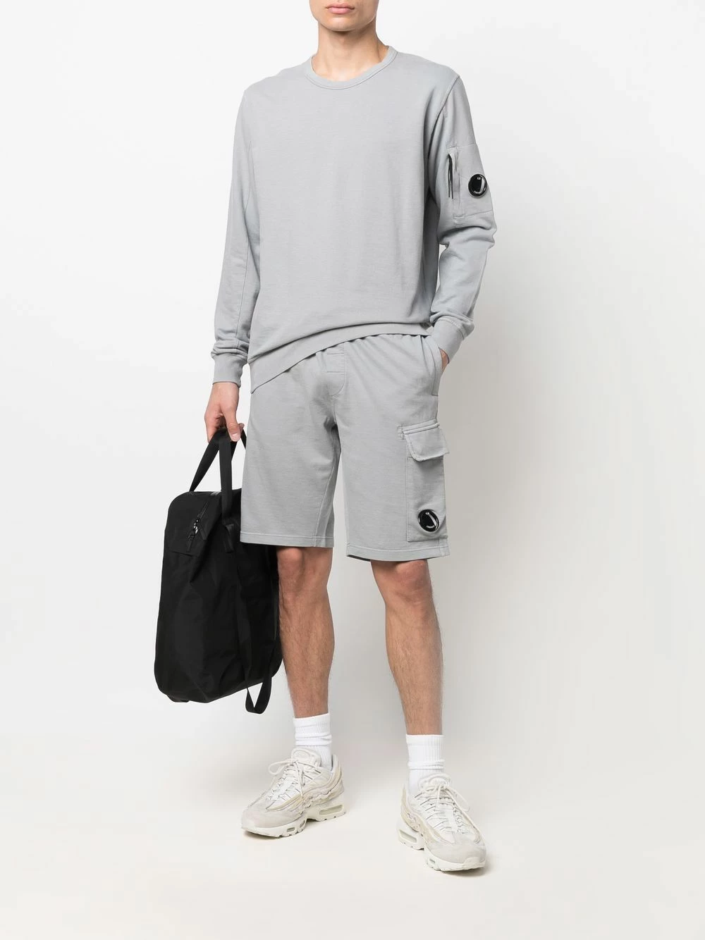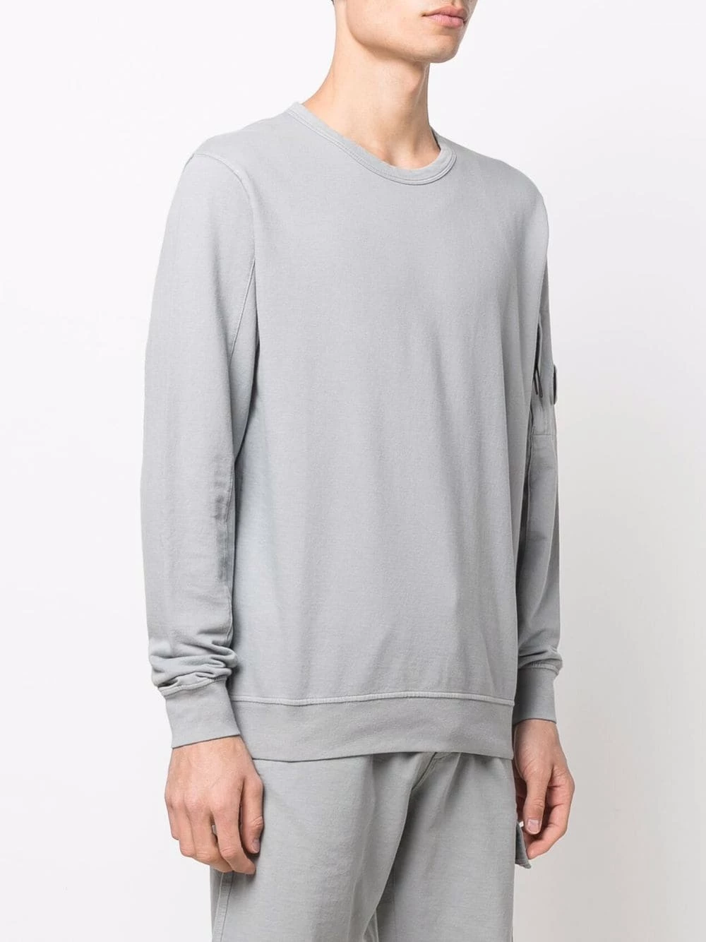 Détail verre de lunette signature, encolure ras du cou, manches longues, poignets nervurés, poche zippée sur la manche, ourlet droit. Couleur : gris. Matière : coton.