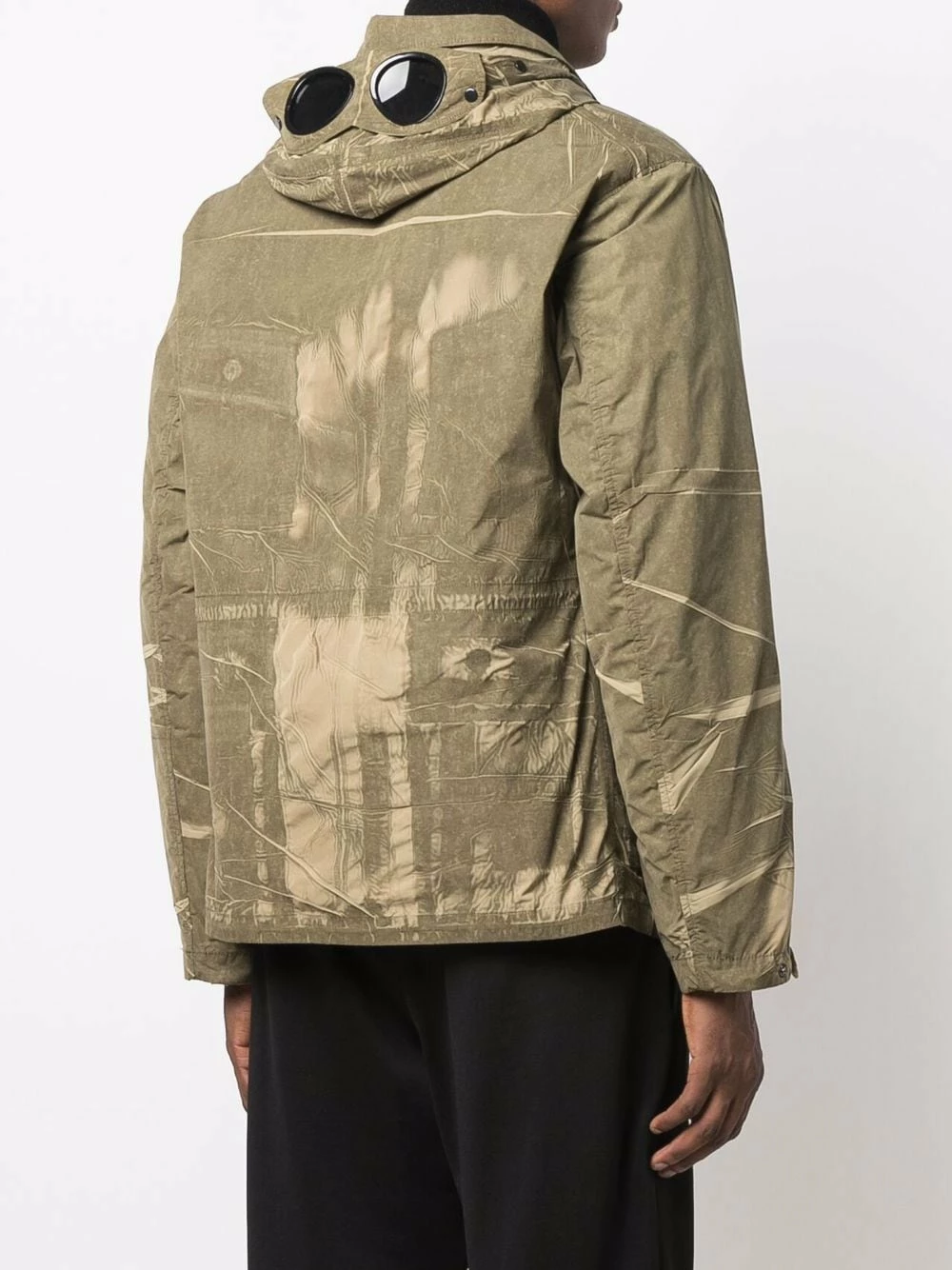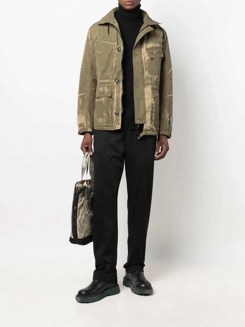 Détail verre de lunette signature, effet délavé, modèle bicolore, col italien, deux poches à rabat sur le devant, boutonnière sur le devant.