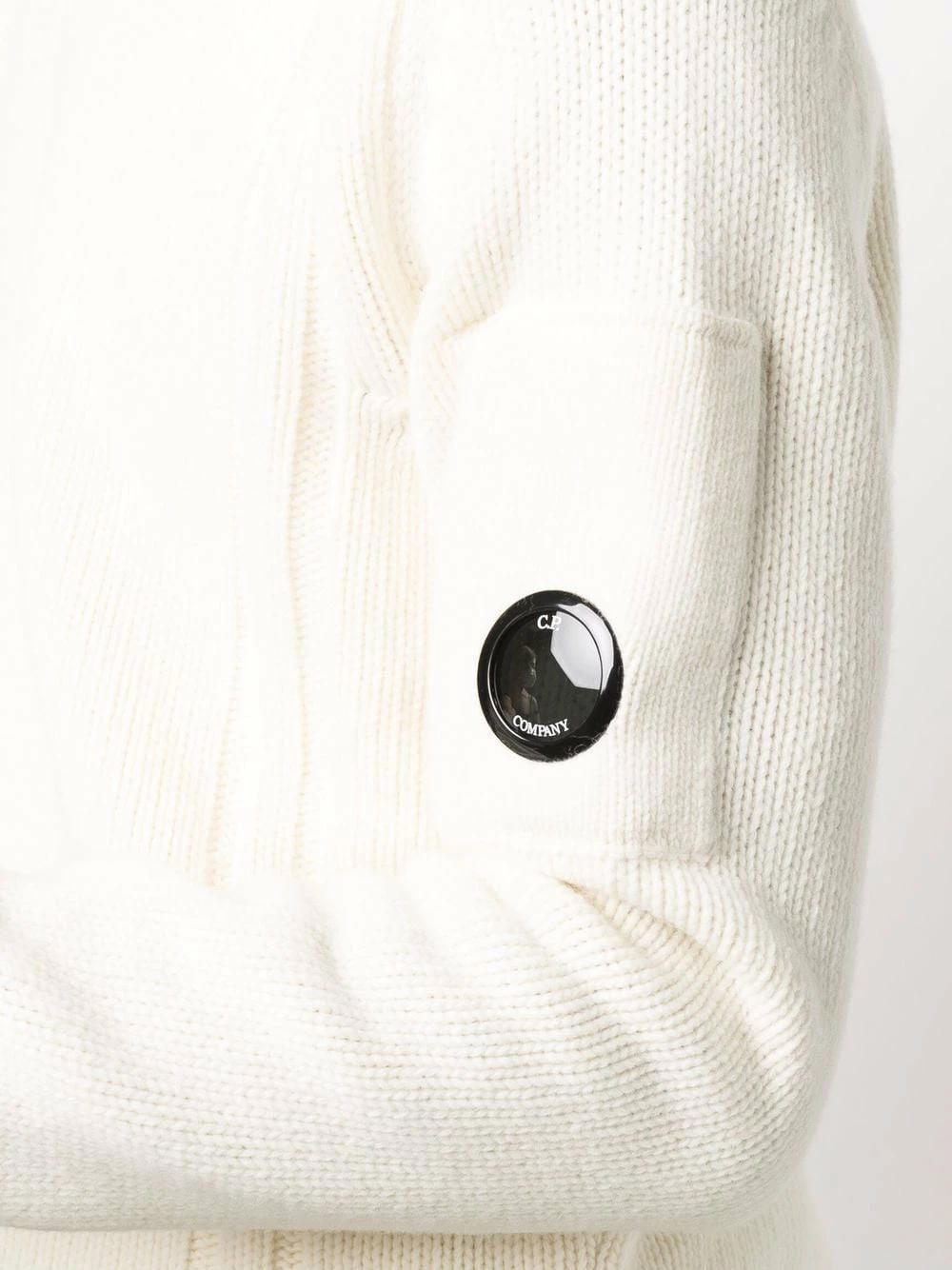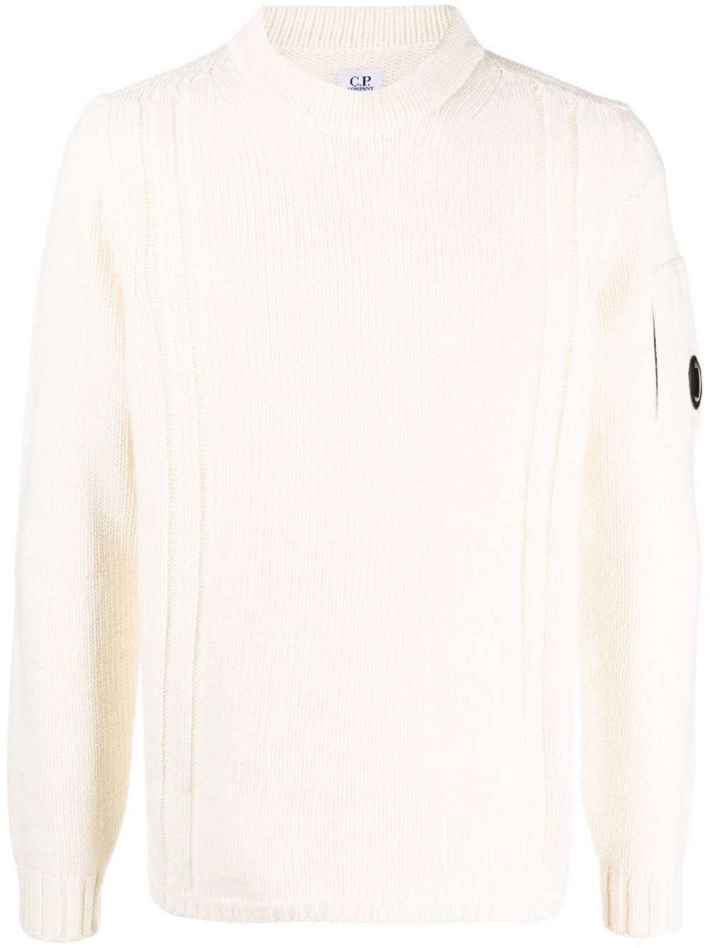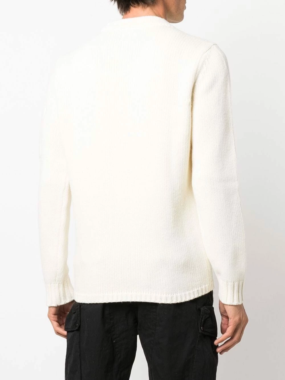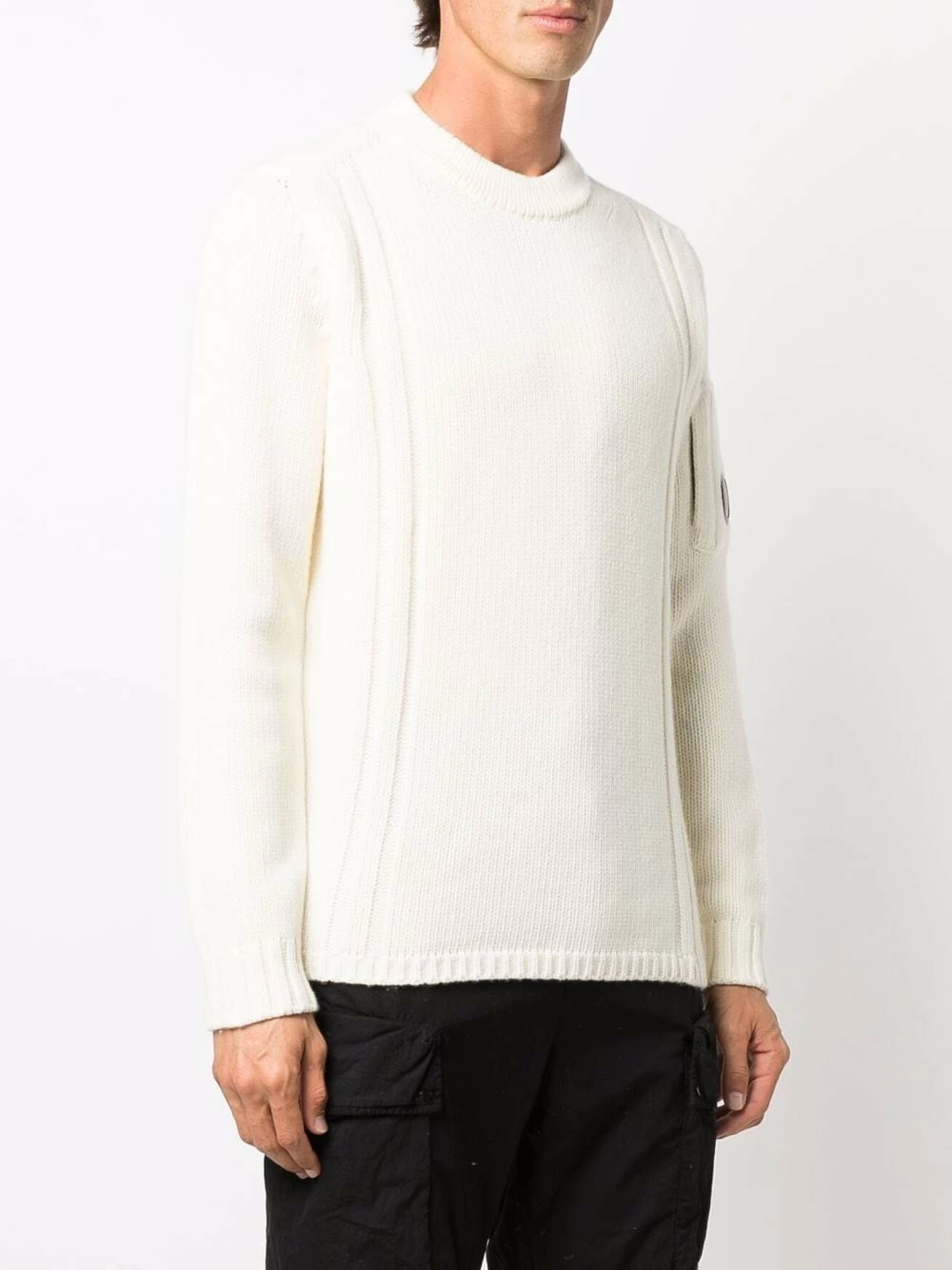 Design en maille, patch logo sur la manche, encolure ronde, manches longues, ourlet nervuré. Couleur : blanc.