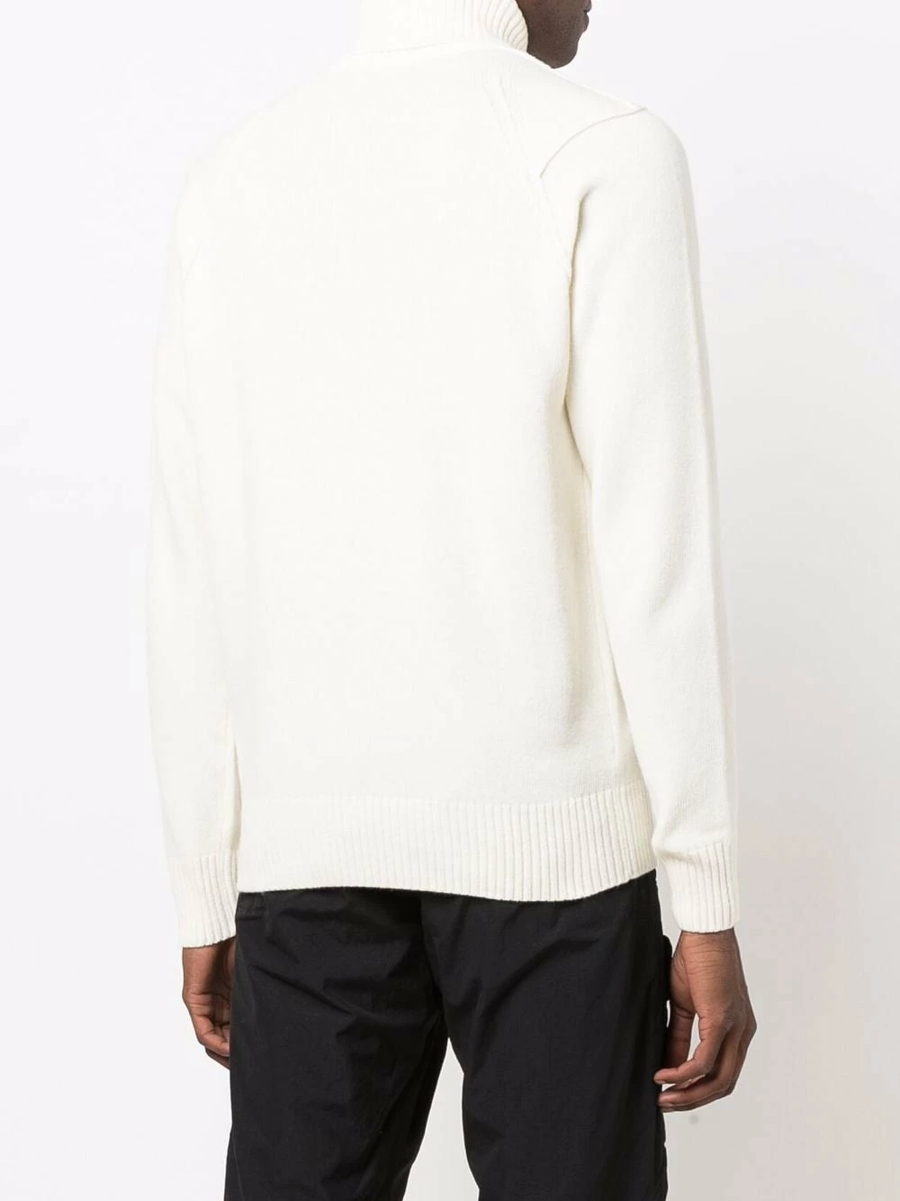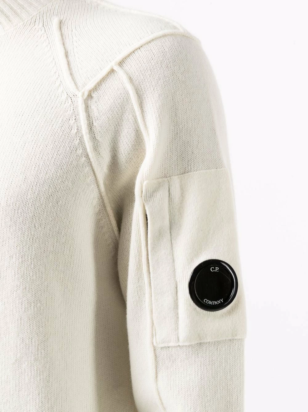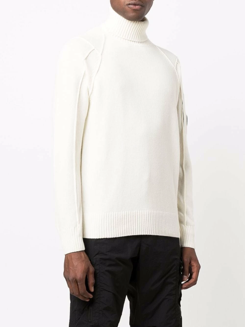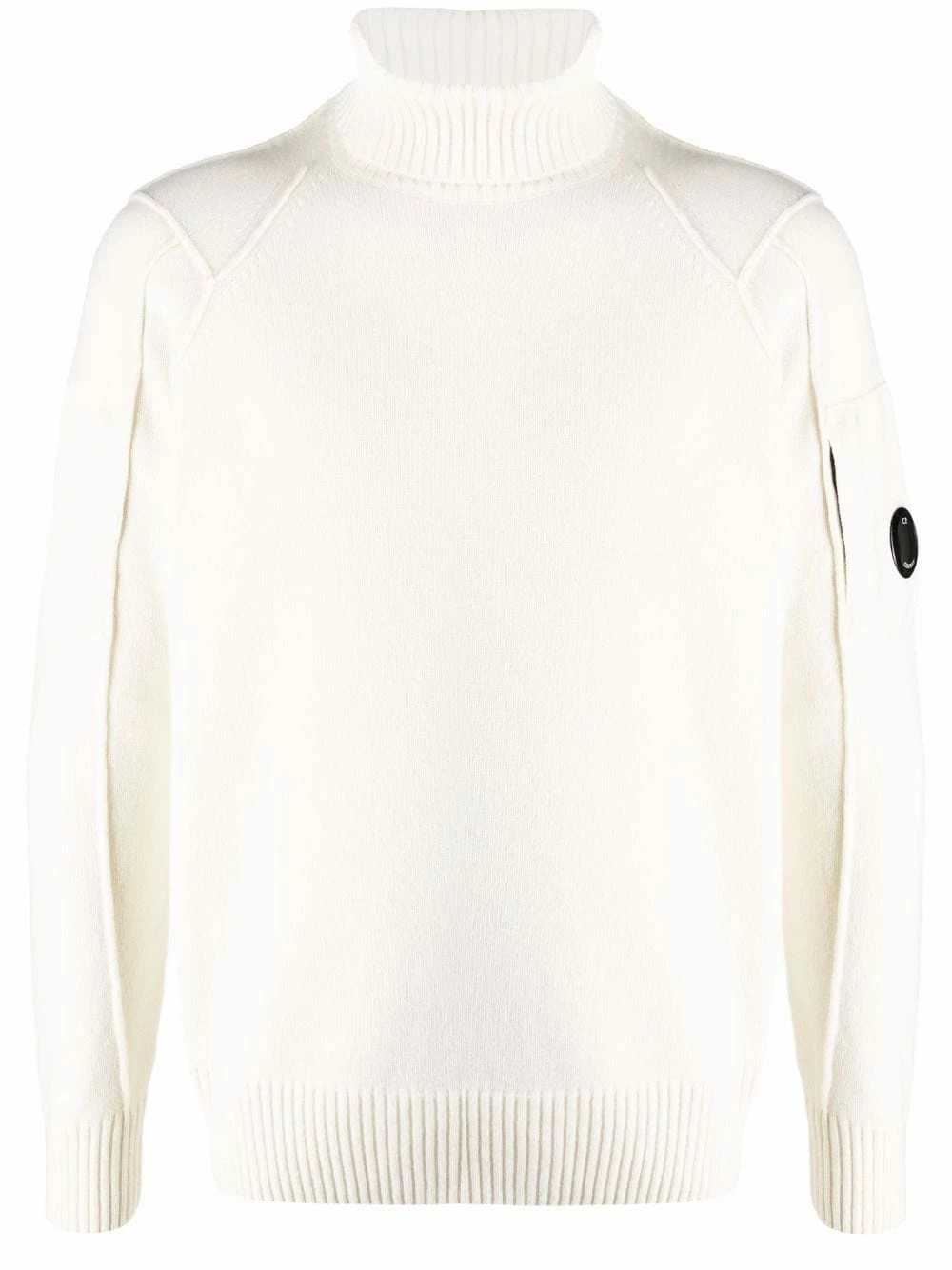 Détail nervuré, patch logo sur la manche, col roulé, manches longues, ourlet droit. Matière : laine.