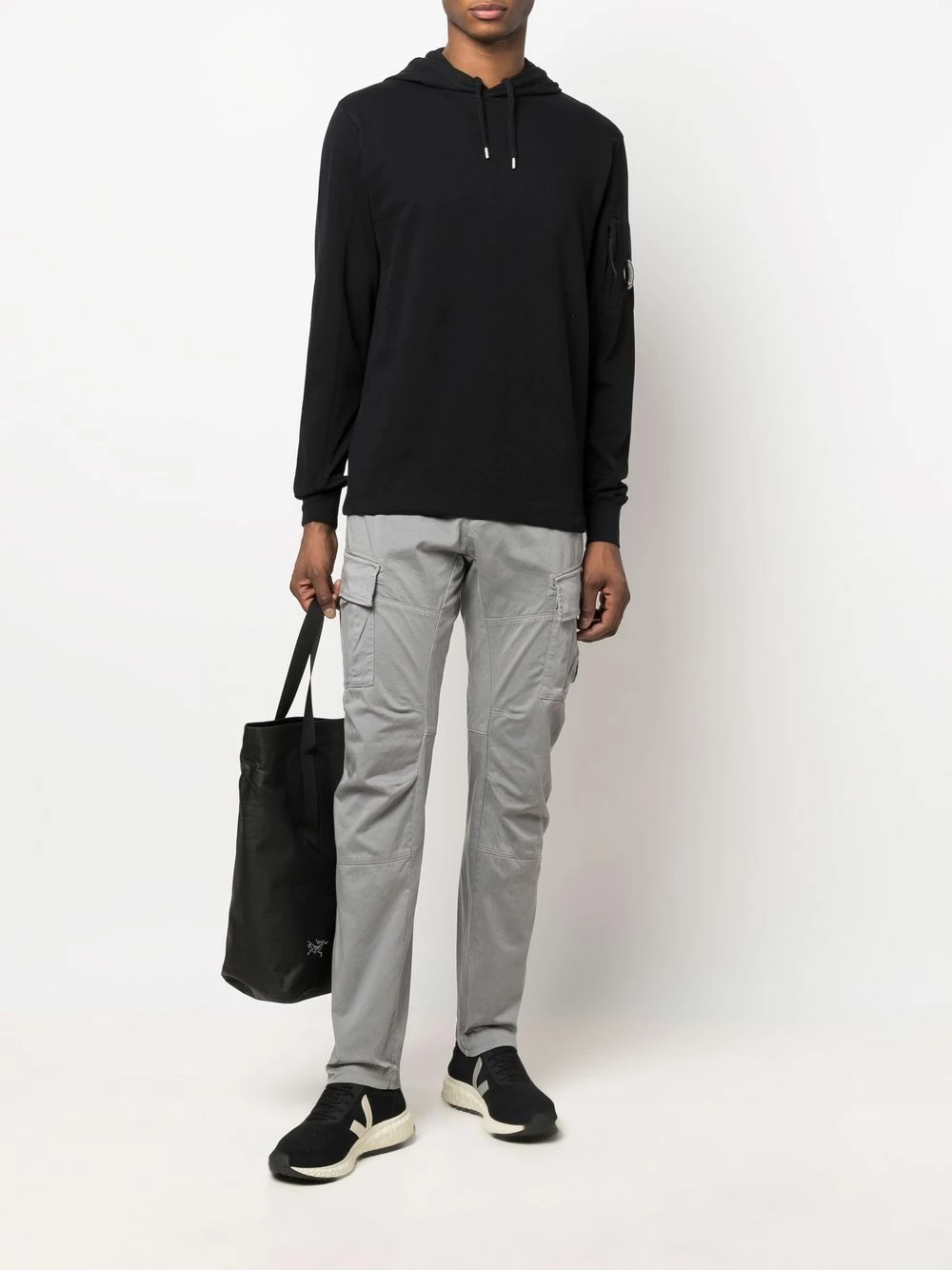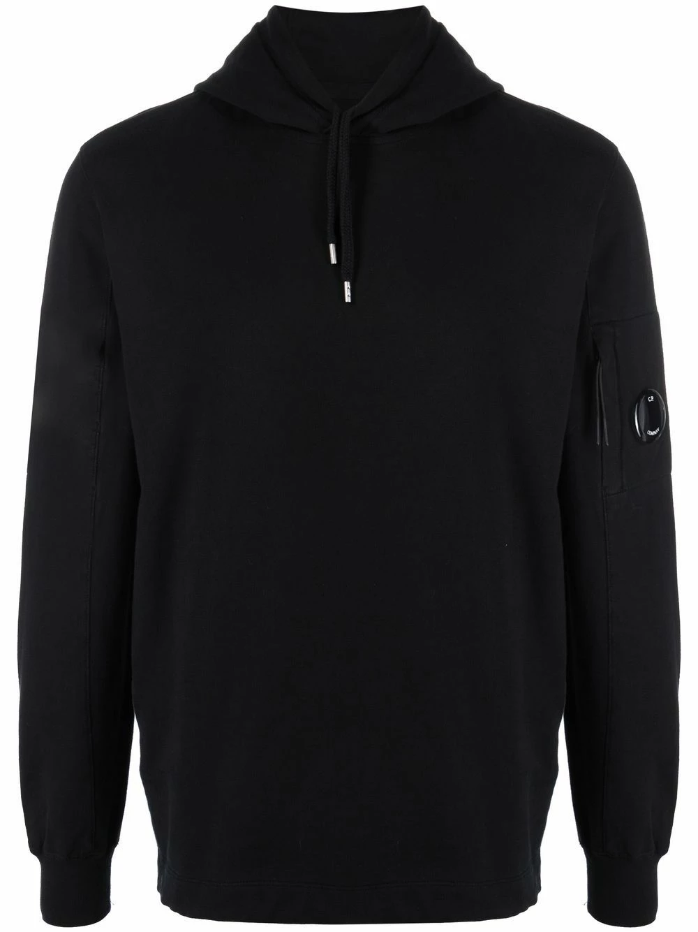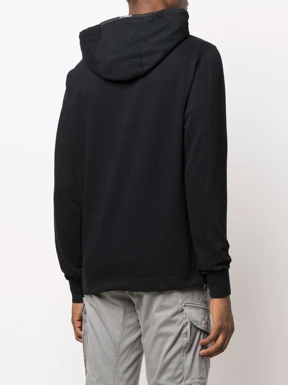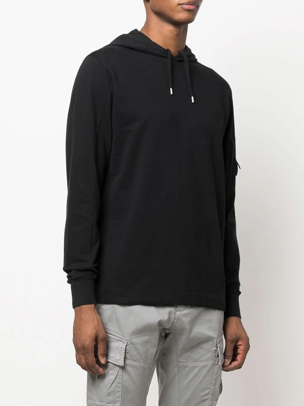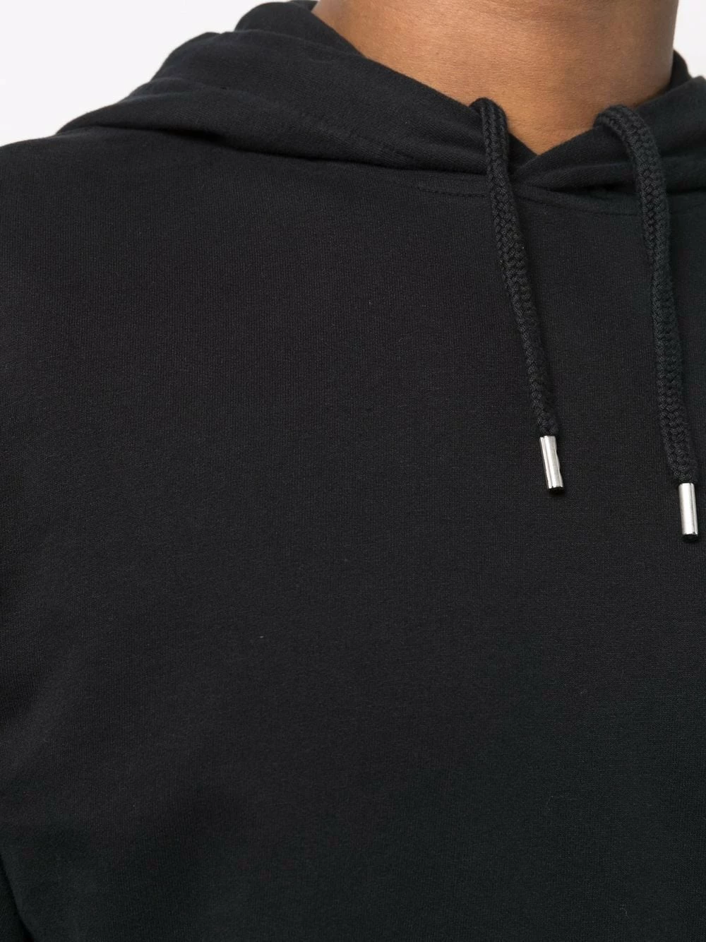 Détail verre de lunette signature, capuche à lien de resserrage, manches longues, poignets élastiqués, poche zippée sur la manche, ourlet élastiqué. Couleur : noir. Matière : coton.