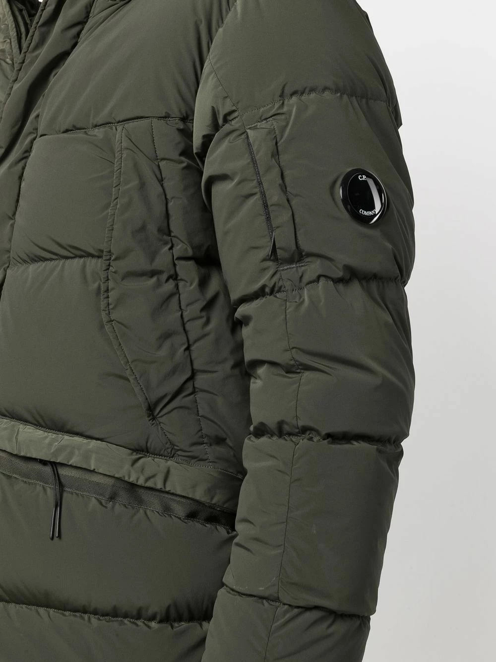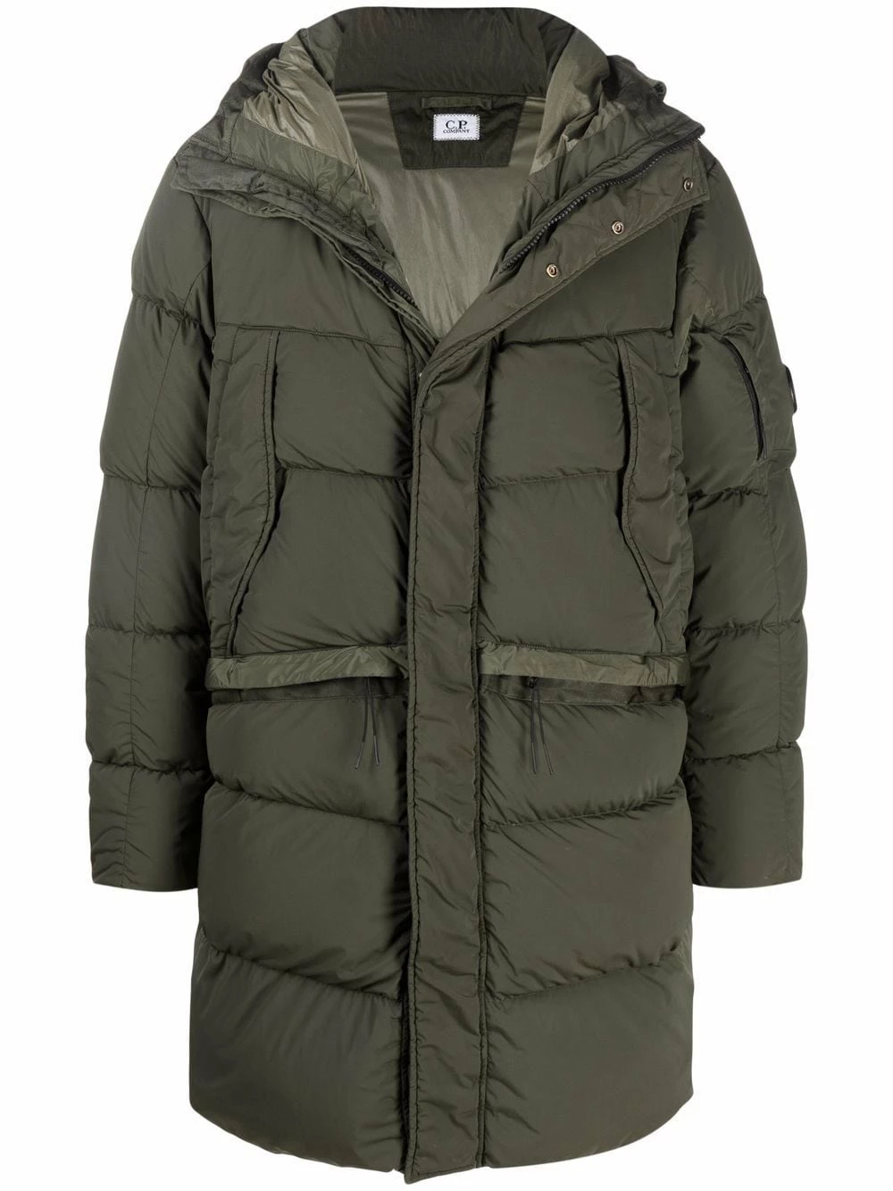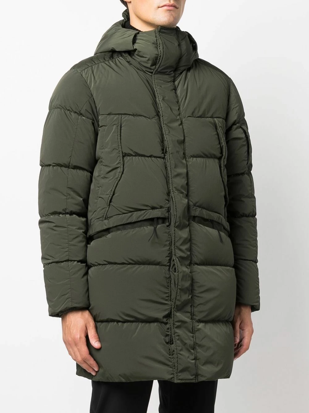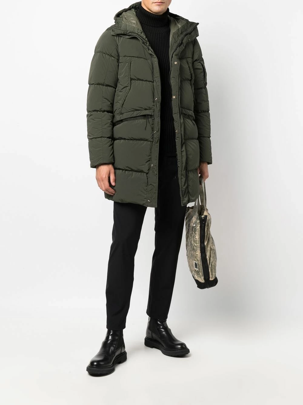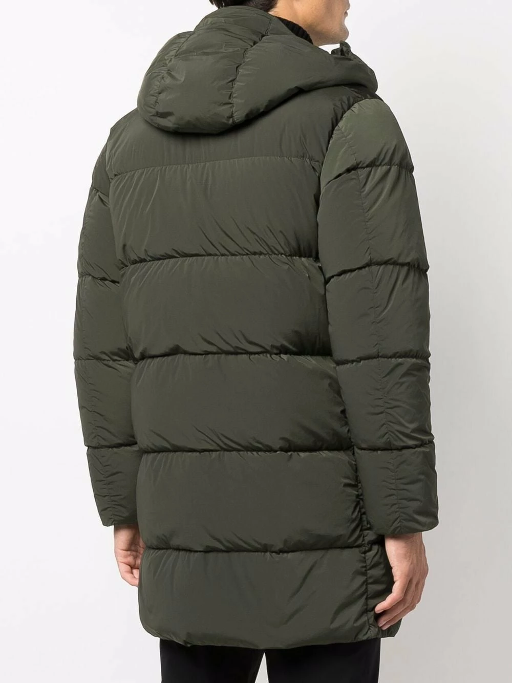 Design matelassé, coupe mi-longue, manches longues, capuche classique. Couleur : vert.