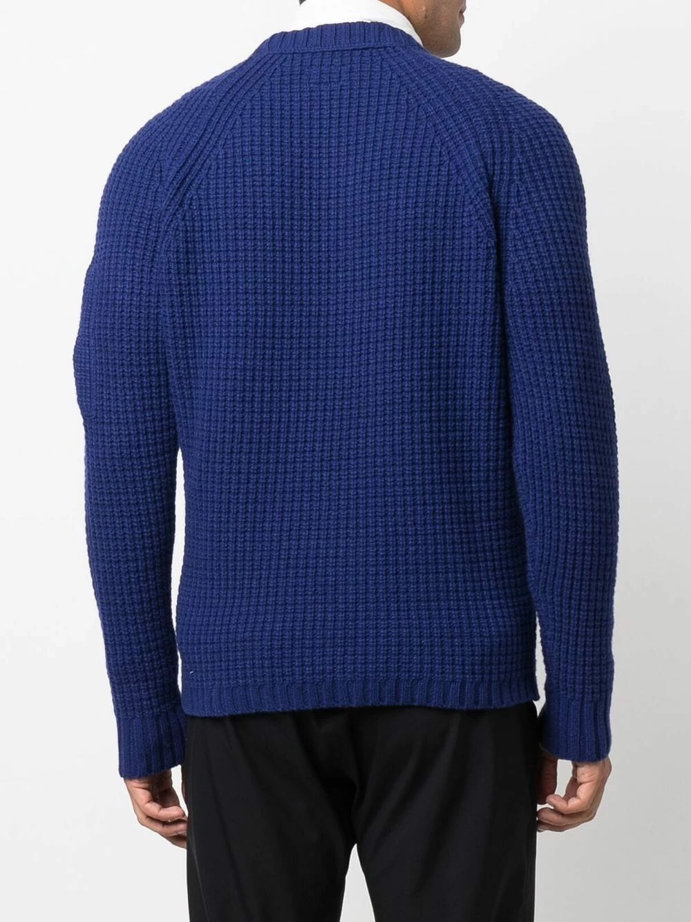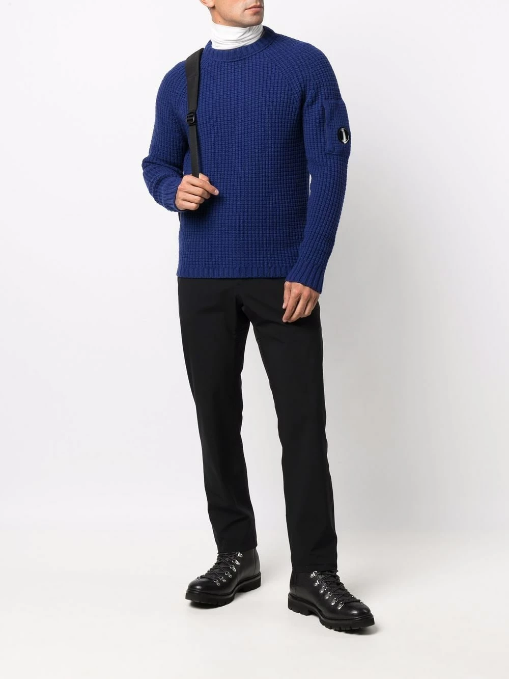 Patch logo sur la manche, tricot gaufré, encolure ras du cou, manches longues, bordures nervurées.