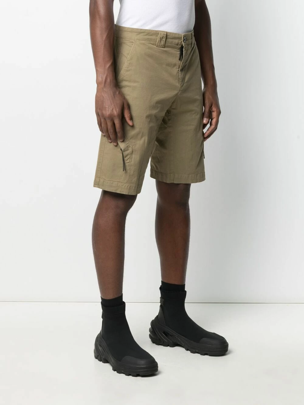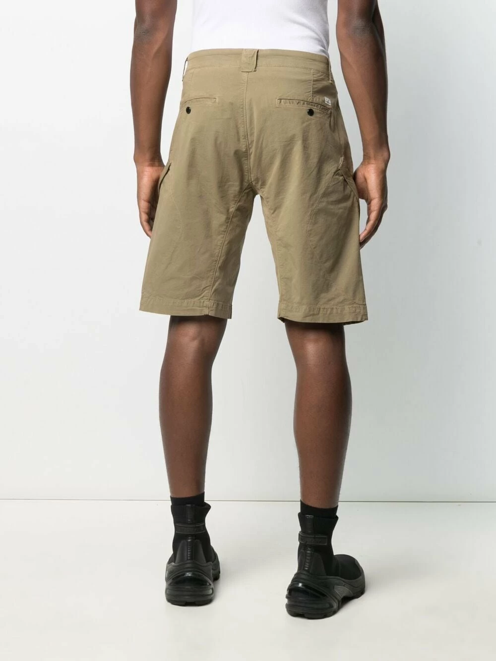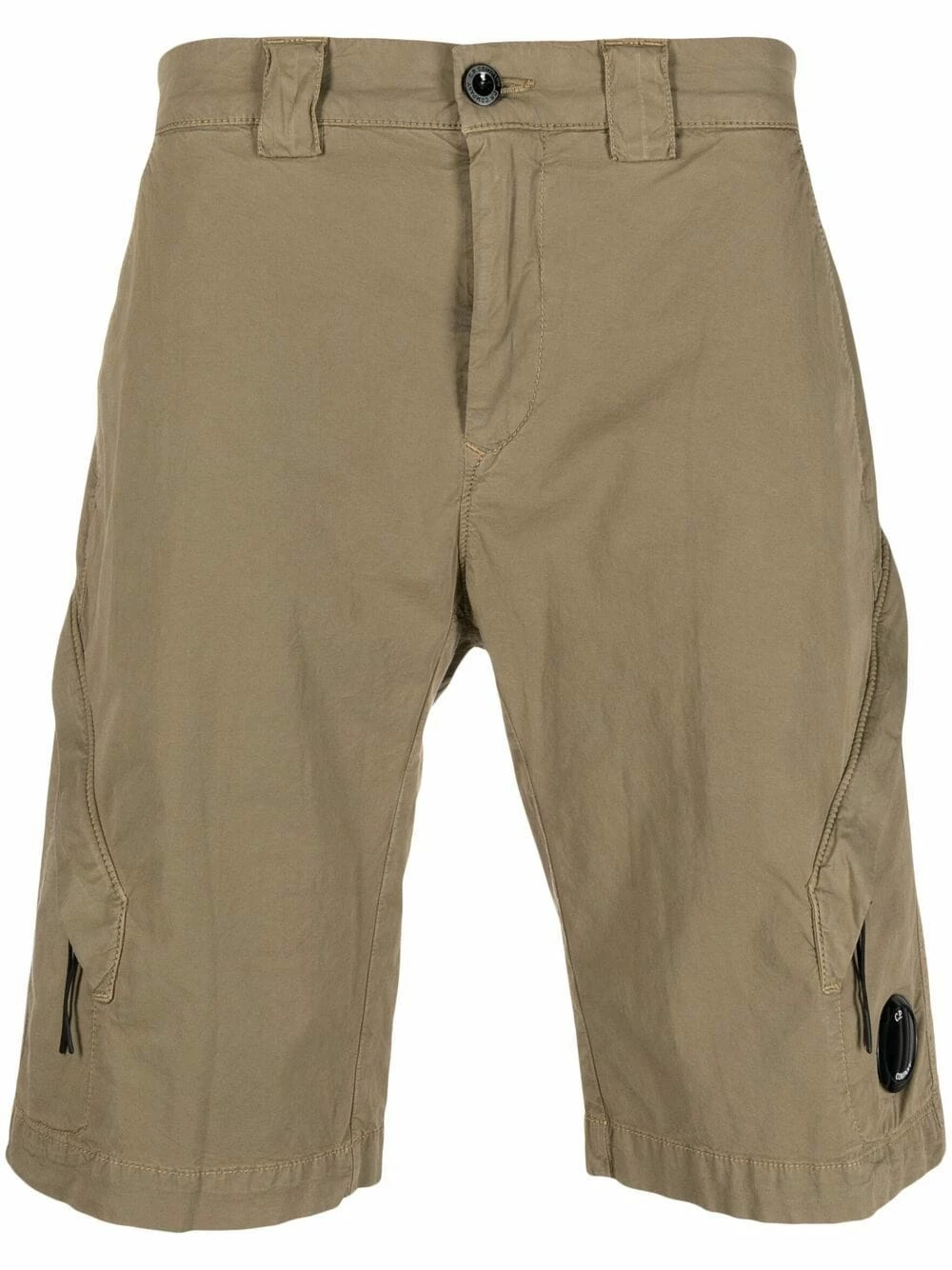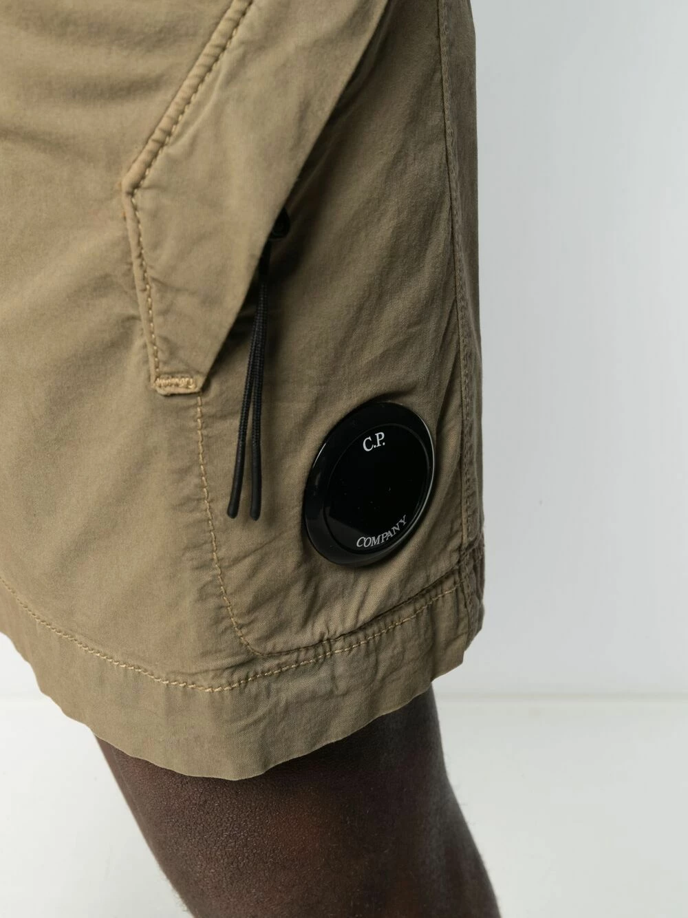 Détail verre de lunette signature, passants de ceinture, boutonnière sur le devant, deux poches latérales fendues, poches latérales cargo. Matière : coton mélangé.