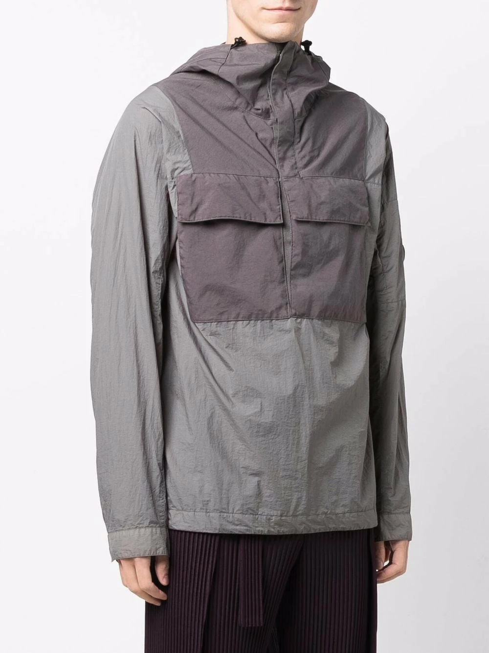 Effet froissé, deux poches poitrine à rabat, modèle bicolore, capuche classique, fermeture dissimulée sur le devant, manches longues, poignets boutonnés.