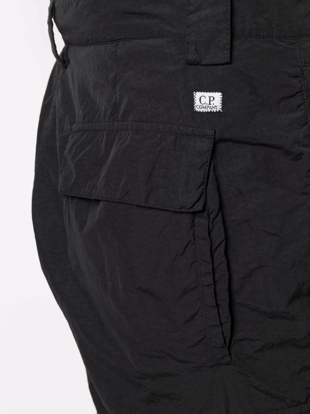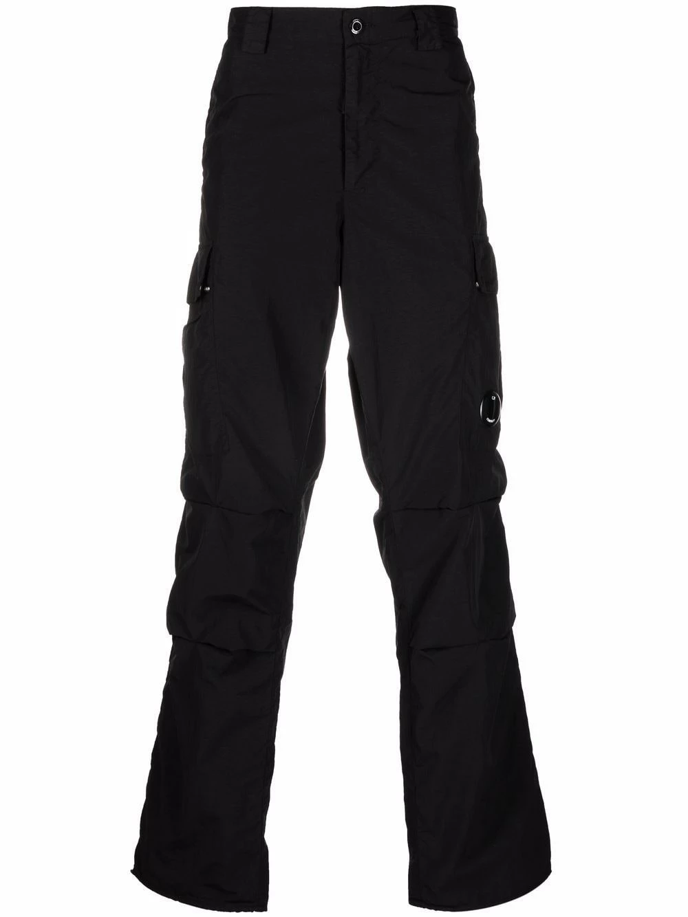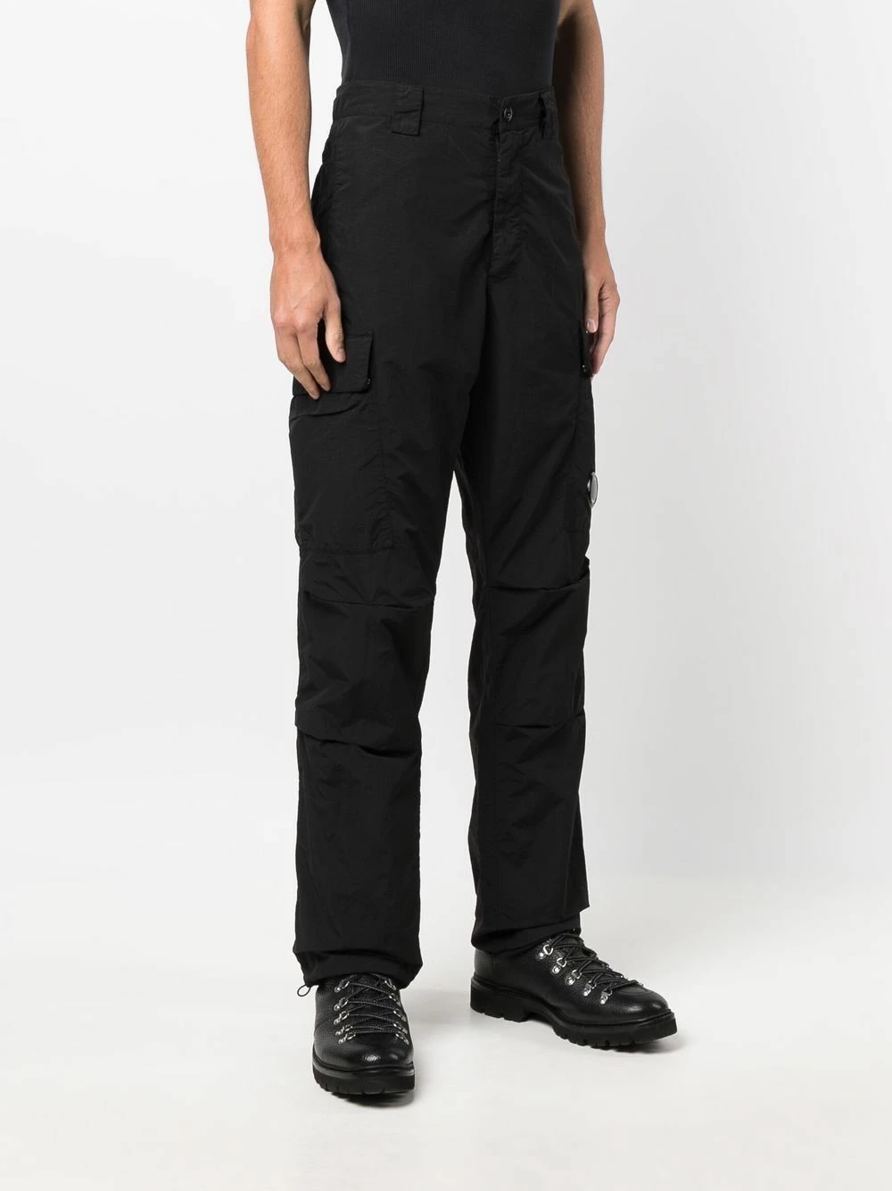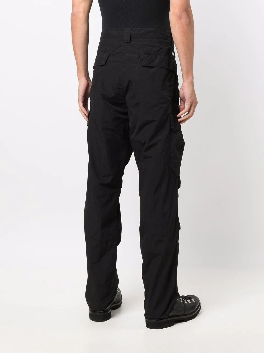 Coupe droite, passants de ceinture, fermeture dissimulée sur le devant, deux poches latérales fendues, poches latérales cargo, poches arrière à rabat. Couleur : noir.